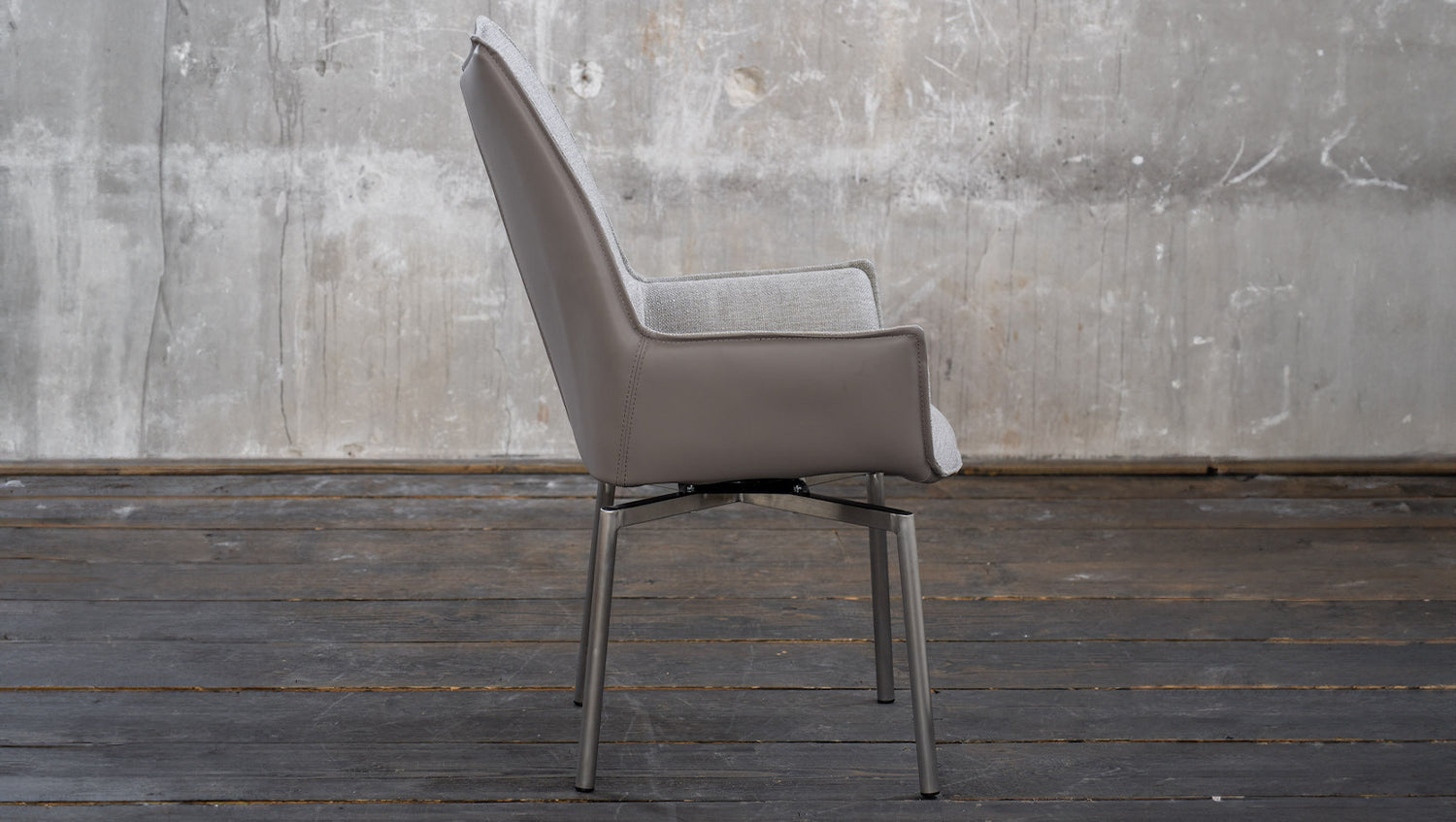 Esta silla es 2a oportunidad de una devolución de un cliente, que tiene ciertos defectos de menor importancia y por lo tanto es ofrecido por nosotros a un precio reducido. Los posibles defectos son: Arañazos en el armazón, marcas de presión, ligera suciedad y desviaciones de color en la tapicería, así como desgarros en la tela de los bajos. Por favor, eche un vistazo a las fotos de defectos directamente después de la foto principal. Sólo sirven para ilustrar posibles defectos. Se trata de imágenes de ejemplo generales y no representan el artículo en cuestión. El artículo no presenta necesariamente todos los defectos indicados. Las telas y colores de tapicería que aparecen en las imágenes de defectos tampoco se refieren a este artículo. La silla de comedor KAWOLA STINE convence por su elaboración de alta calidad y su diseño especial. La combinación de la piel sintética gris en el exterior de la carcasa del asiento y la tela flexible del asiento convierten a la silla en la estrella de cualquier comedor, y no sólo visualmente. Los elegantes pies de acero inoxidable cepillado tienen función giratoria y redondean la silla a la perfección. La forma y el tapizado de la silla garantizan un agradable confort de asiento. STINE no sólo destaca en el comedor, ya que la silla también es perfecta para su uso en el contract.