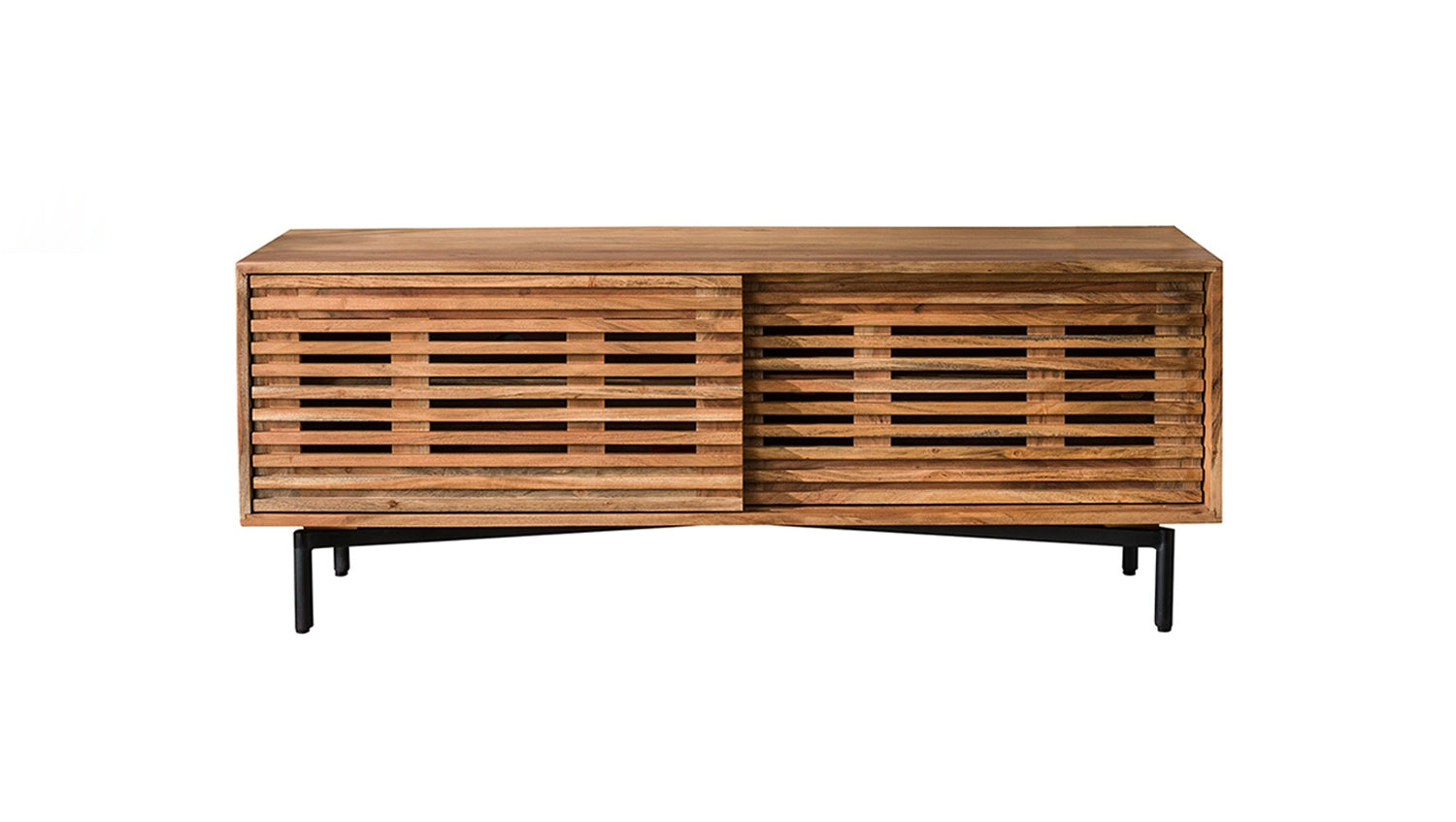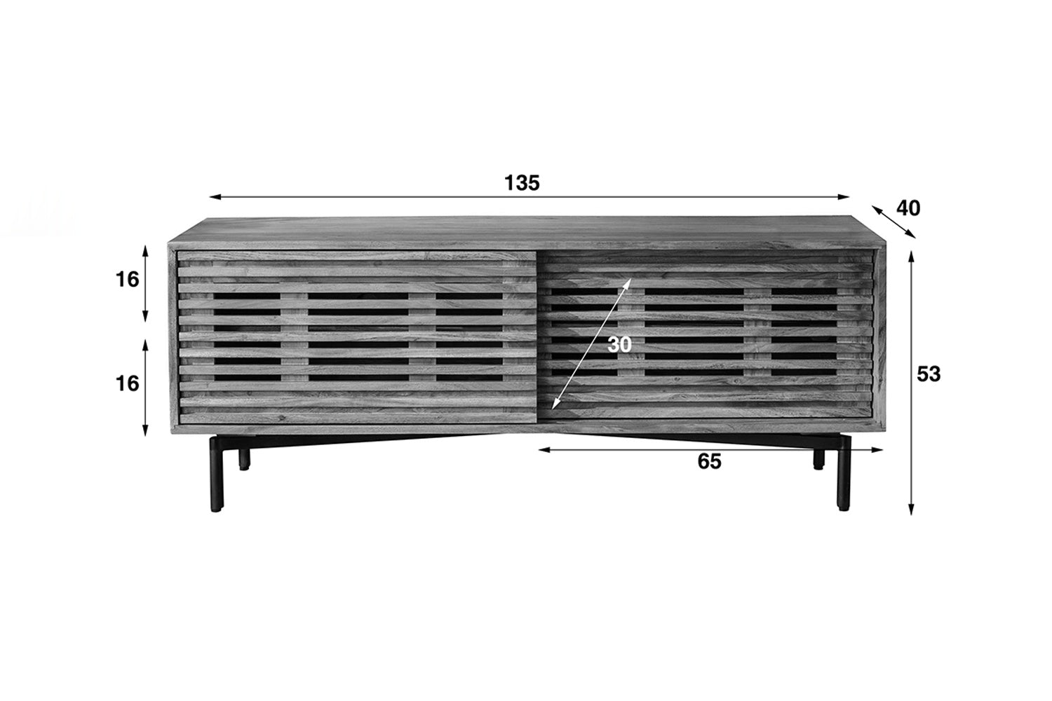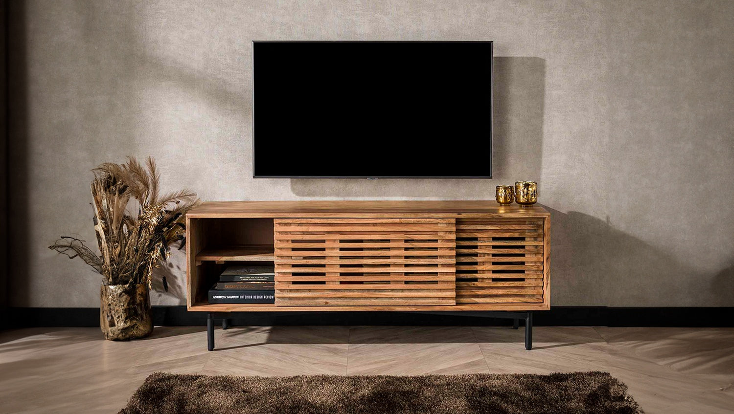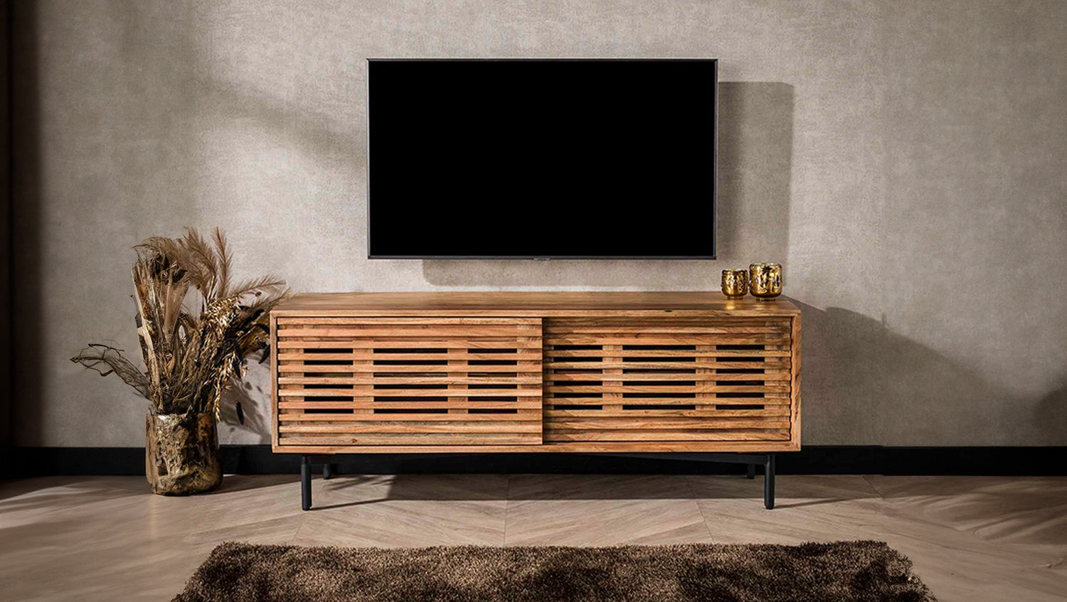 El Aparador de TV RIONI está fabricado en madera de acacia y tiene una robusta estructura metálica. Con una anchura de 135 cm, es ideal para televisores de 32 a 55 pulgadas. El mueble tiene dos puertas correderas y un estante, lo que proporciona mucho espacio de almacenamiento. También cuenta con un pasacables para ocultar los cables de forma ordenada. El Mueble bajo RIONI combina funcionalidad con un diseño atractivo y es la elección perfecta para cualquiera que valore la calidad y la estética. Una auténtica joya para su salón.