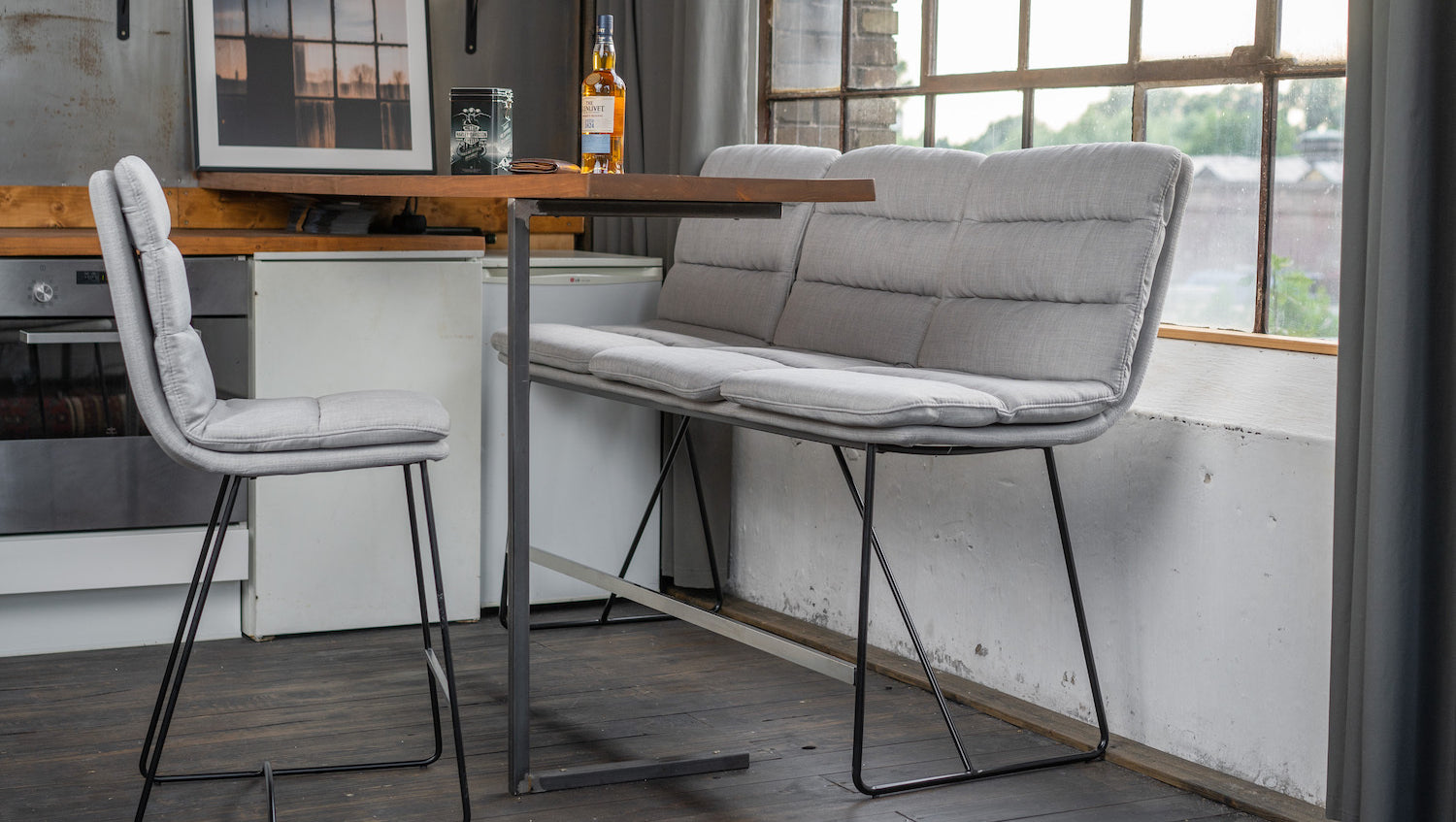 El banco de mostrador KAWOLA ofrece una gran opcion de asiento en su isla de cocina. 180 cm de largo, siempre hay espacio para amigos y familiares en esta gran opcion de asiento. El banco esta tapizado en un bonito tejido gris claro, que esconde un agradable acolchado que asegura un asiento comodo.