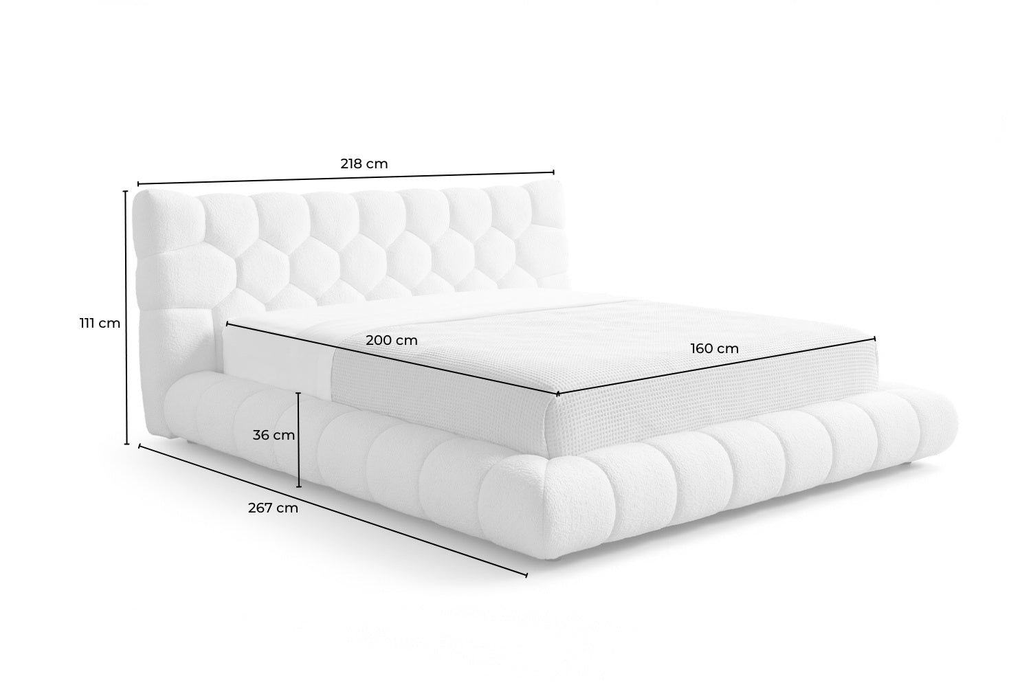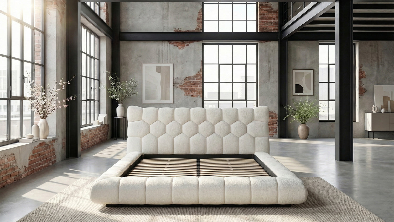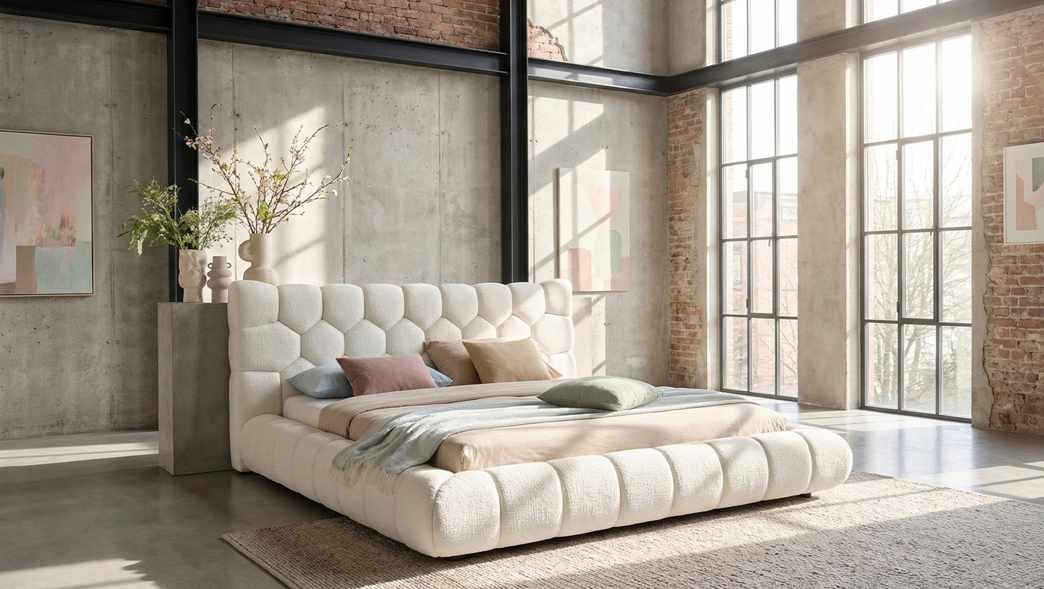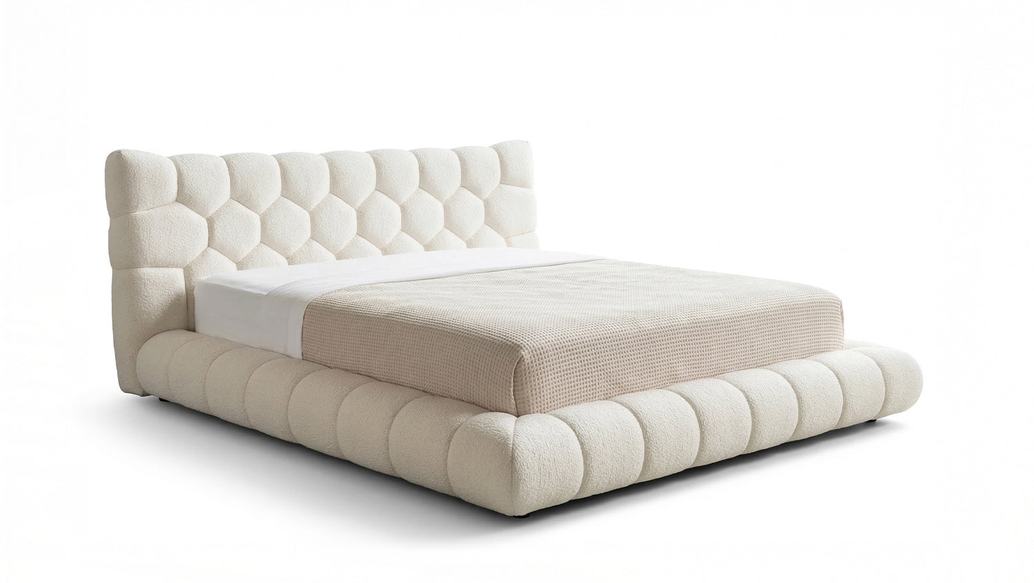 La cama tapizada ATTICO de KAWOLA, en un elegante color blanco crema, combina un diseño moderno con un lenguaje de formas extraordinario y materiales de alta calidad. Una característica especial es el cabecero de elaborado diseño con su llamativo acolchado en forma de panal. Los elementos dispuestos geométricamente irradian armonía y tranquilidad, mientras que las partes del marco suavemente redondeadas crean una silueta fluida y lujosa. Un detalle especialmente destacado es la funda de alta calidad en tejido bouclé. El bouclé se caracteriza por su estructura típica de bucles ligeramente irregulares, que confiere al material una superficie viva y tridimensional. La fina textura no solo resulta visualmente atractiva, sino que también proporciona un tacto agradable, suave y cálido. El bouclé es sinónimo de confort moderno, transmite comodidad y, al mismo tiempo, aporta un toque de diseño a la habitación. Gracias a su estructura densa, el tejido es además resistente y muy adecuado para el uso diario. La parte trasera del cabecero también está completamente tapizada con el mismo tejido bouclé, lo que permite colocar la cama en cualquier lugar de la habitación y ofrece un aspecto de alta calidad desde cualquier perspectiva. La profundidad de inserción para somieres es ajustable en tres alturas diferentes: 15 cm, 20 cm o 25 cm. De este modo, se puede adaptar individualmente a diferentes alturas de colchón y a las necesidades personales, y se consigue una altura de acceso cómoda. El cabecero, suavemente acolchado, ofrece además un agradable respaldo, ideal para leer o descansar relajadamente. Con la cama tapizada ATTICO, se decide por un objeto de diseño expresivo que combina de forma elegante materiales lujosos, una funcionalidad bien pensada y un confort moderno.