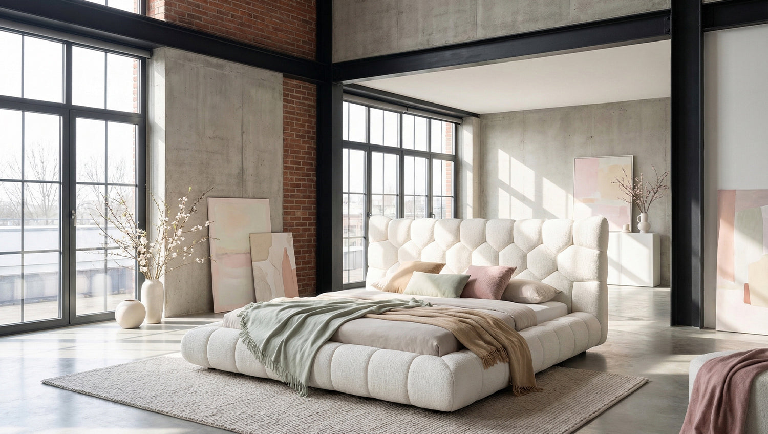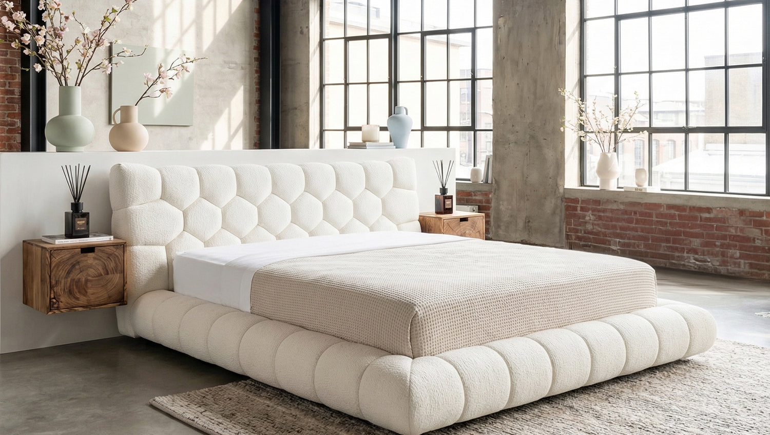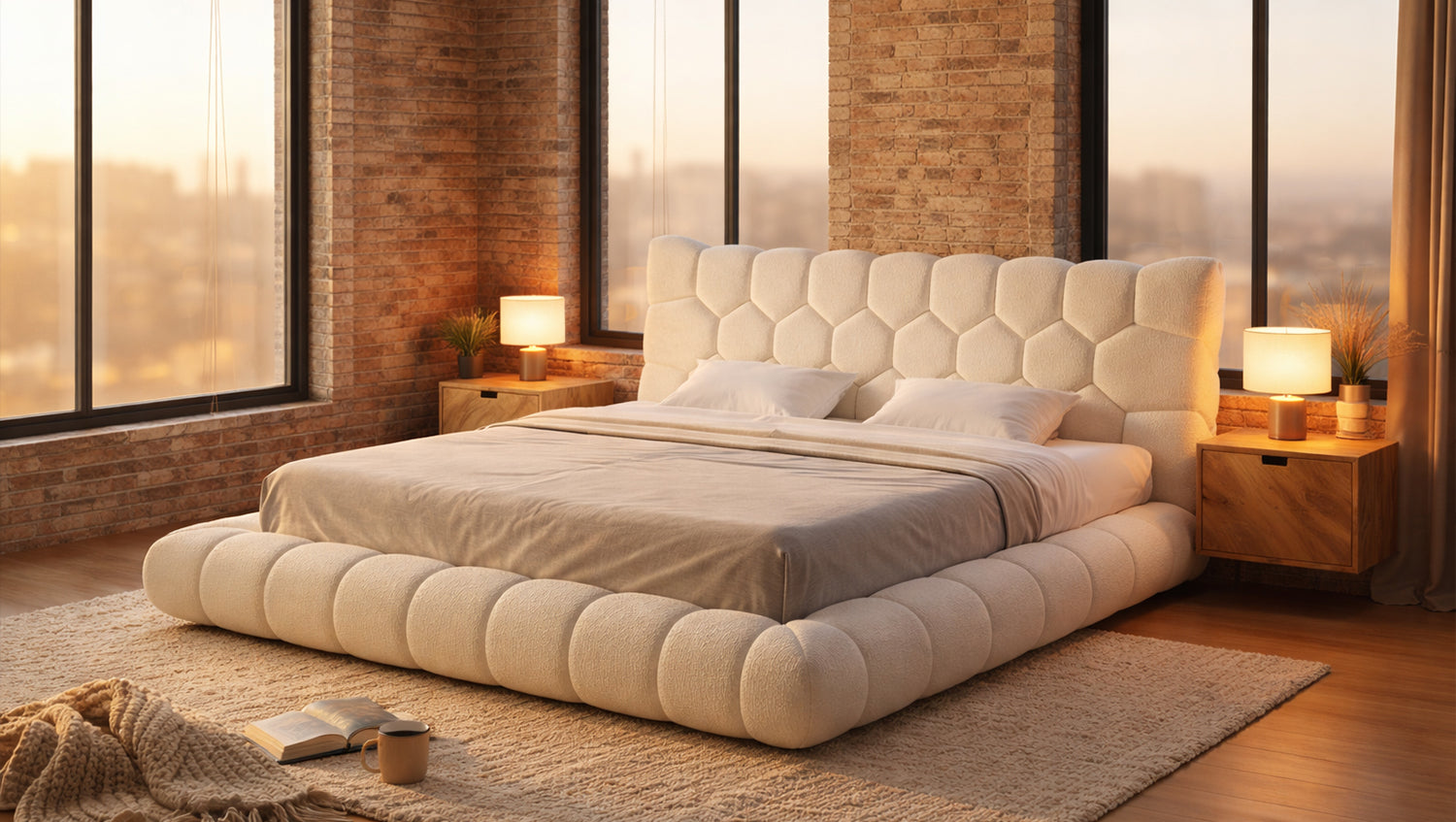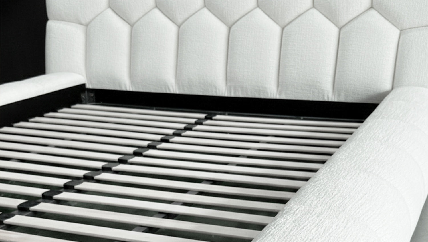 La cama tapizada ATTICO de KAWOLA, en un elegante color blanco crema, combina un diseño moderno con un lenguaje de formas extraordinario y materiales de alta calidad. Una característica especial es el cabecero de elaborado diseño con su llamativo acolchado en forma de panal. Los elementos dispuestos geométricamente irradian armonía y tranquilidad, mientras que las partes del marco suavemente redondeadas crean una silueta fluida y lujosa. Un detalle especialmente destacado es la funda de alta calidad en tejido bouclé. El bouclé se caracteriza por su estructura típica de bucles ligeramente irregulares, que confiere al material una superficie viva y tridimensional. La fina textura no solo resulta visualmente atractiva, sino que también proporciona un tacto agradable, suave y cálido. El bouclé es sinónimo de confort moderno, transmite comodidad y, al mismo tiempo, aporta un toque de diseño a la habitación. Gracias a su estructura densa, el tejido es además resistente y muy adecuado para el uso diario. La parte trasera del cabecero también está completamente tapizada con el mismo tejido bouclé, lo que permite colocar la cama en cualquier lugar de la habitación y ofrece un aspecto de alta calidad desde cualquier perspectiva. La profundidad de inserción para somieres es ajustable en tres alturas diferentes: 15 cm, 20 cm o 25 cm. De este modo, se puede adaptar individualmente a diferentes alturas de colchón y a las necesidades personales, y se consigue una altura de acceso cómoda. El cabecero, suavemente acolchado, ofrece además un agradable respaldo, ideal para leer o descansar relajadamente. Con la cama tapizada ATTICO, se decide por un objeto de diseño expresivo que combina de forma elegante materiales lujosos, una funcionalidad bien pensada y un confort moderno.