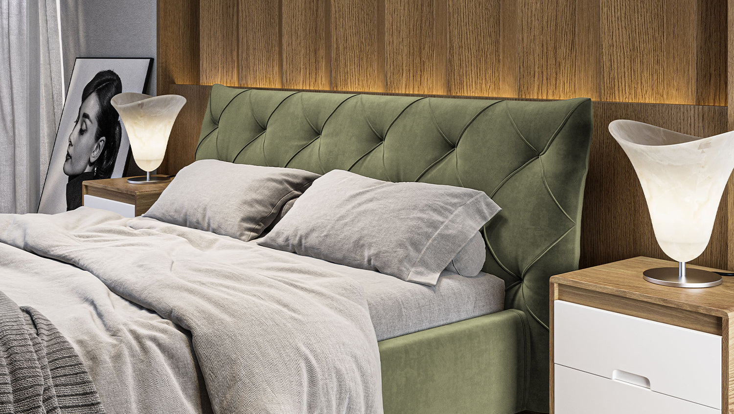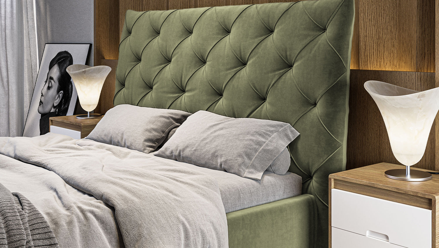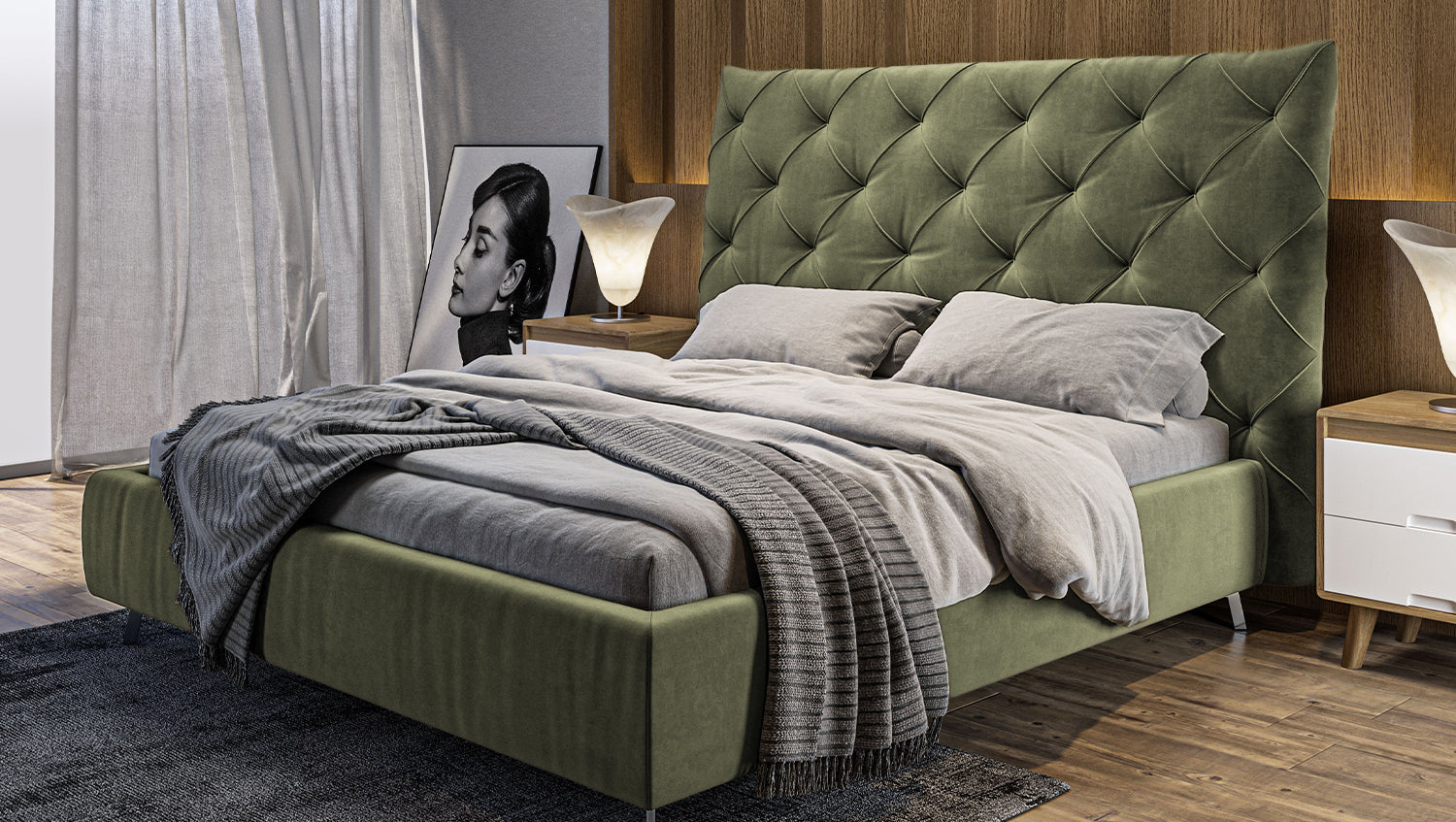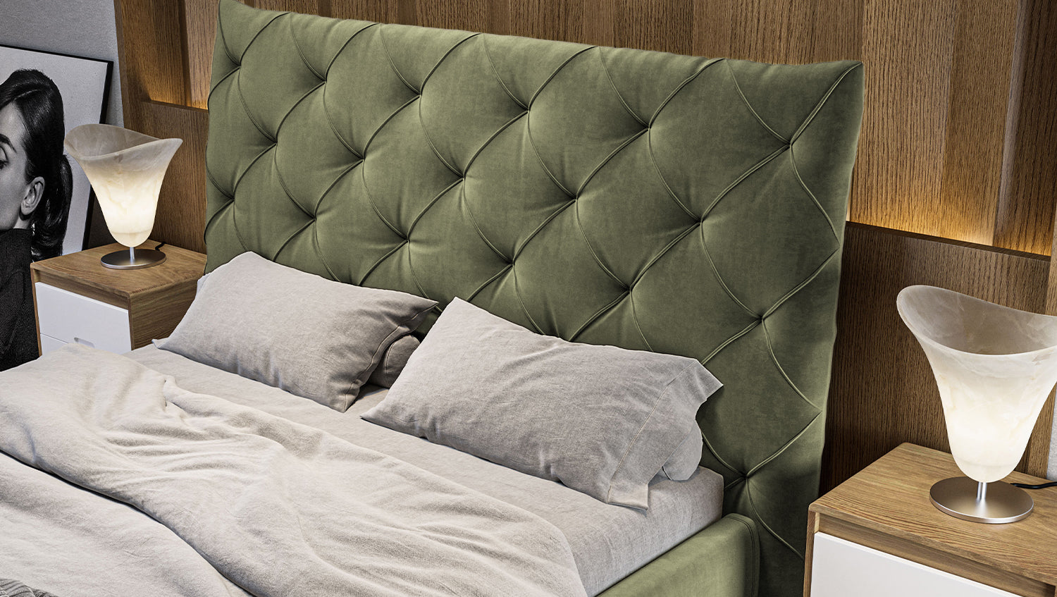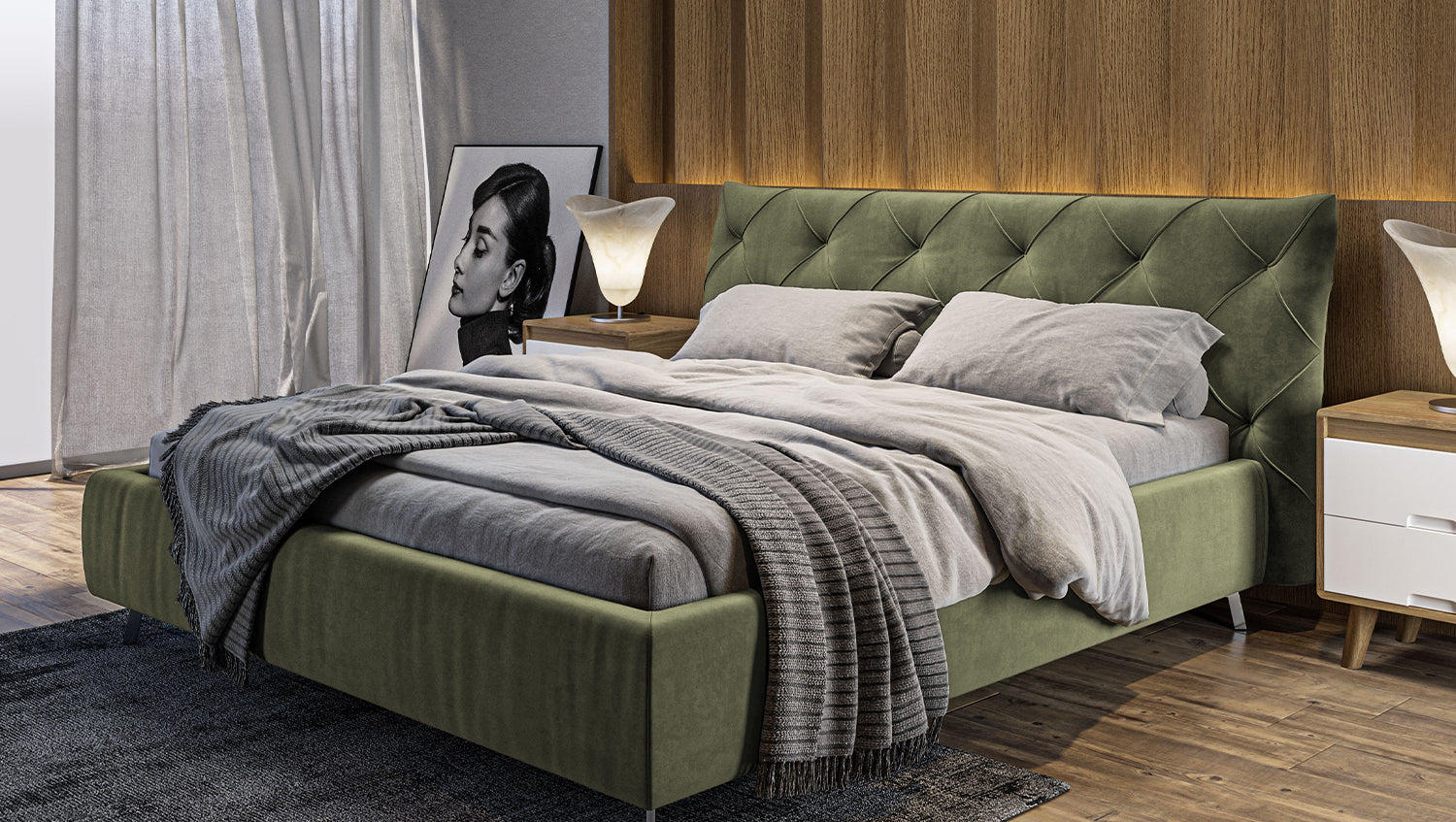 KAWOLA cama ANNY cama tapizada Terciopelo verde oliva