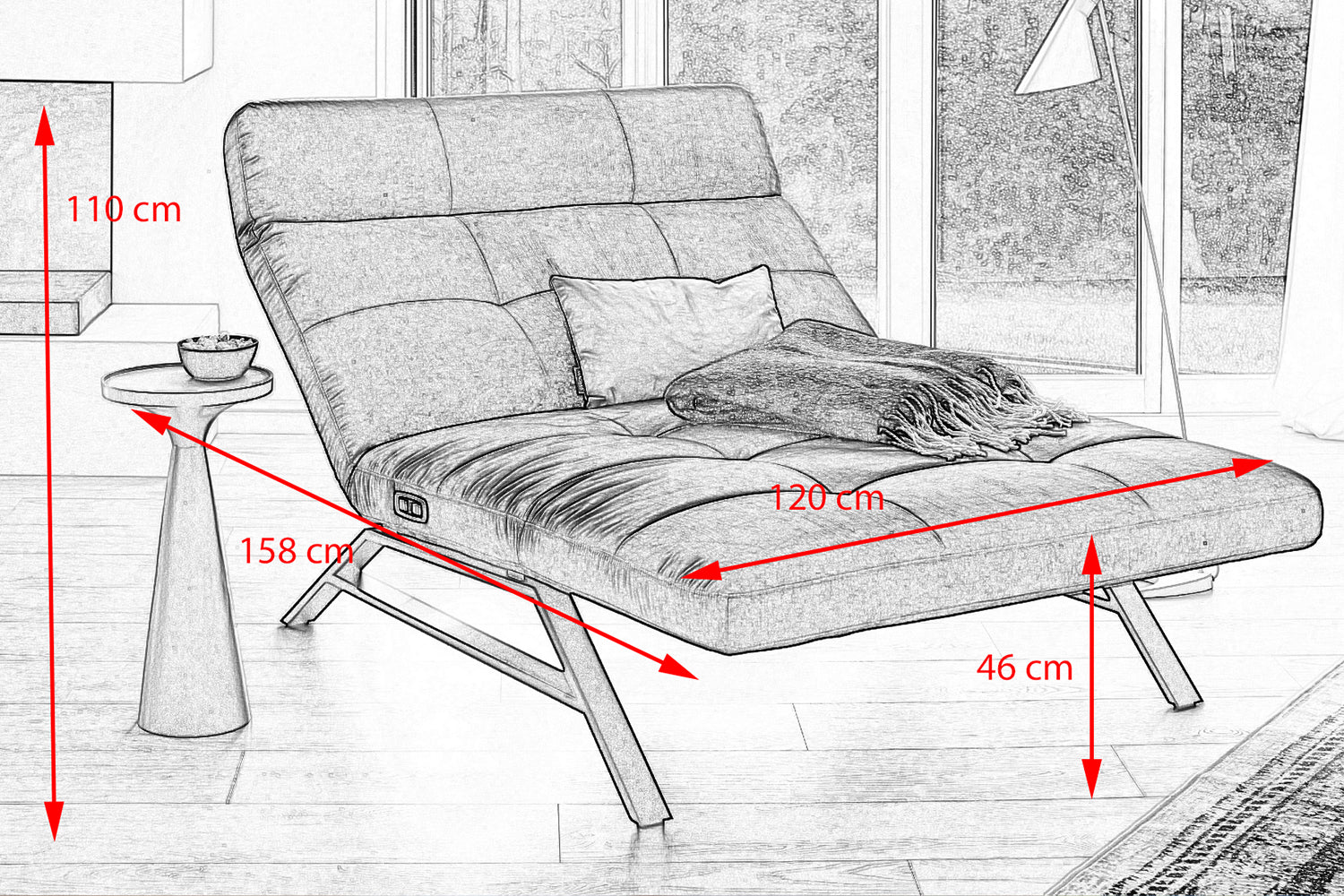 La Chaise longue AMERIVA de KAWOLA es una maravillosa combinación de diseño y funcionalidad. Las guías metálicas en negro mate contrastan con el moderno tejido de terciopelo. Sin embargo, la tumbona no es sólo un verdadero atractivo visual, sino que también cumple todos los deseos en cuanto a funcionalidad. La función motorizada, que puede accionarse con los botones del lado derecho, ofrece una posición de reclinación infinitamente ajustable. La Chaise longue también dispone de conexión USB. La versatilidad de este mueble es tan variada como sus funciones: El sillón AMERIVA no sólo destaca en el salón de casa, sino también en el vestíbulo o en la sala de descanso.