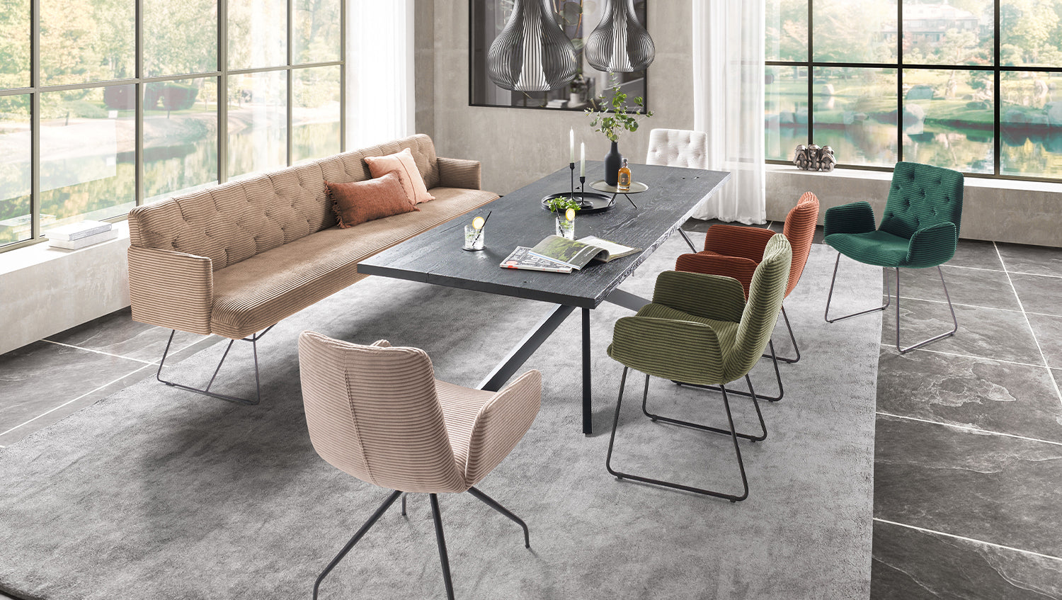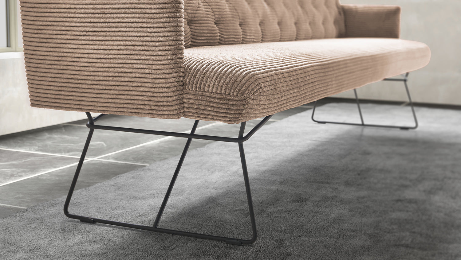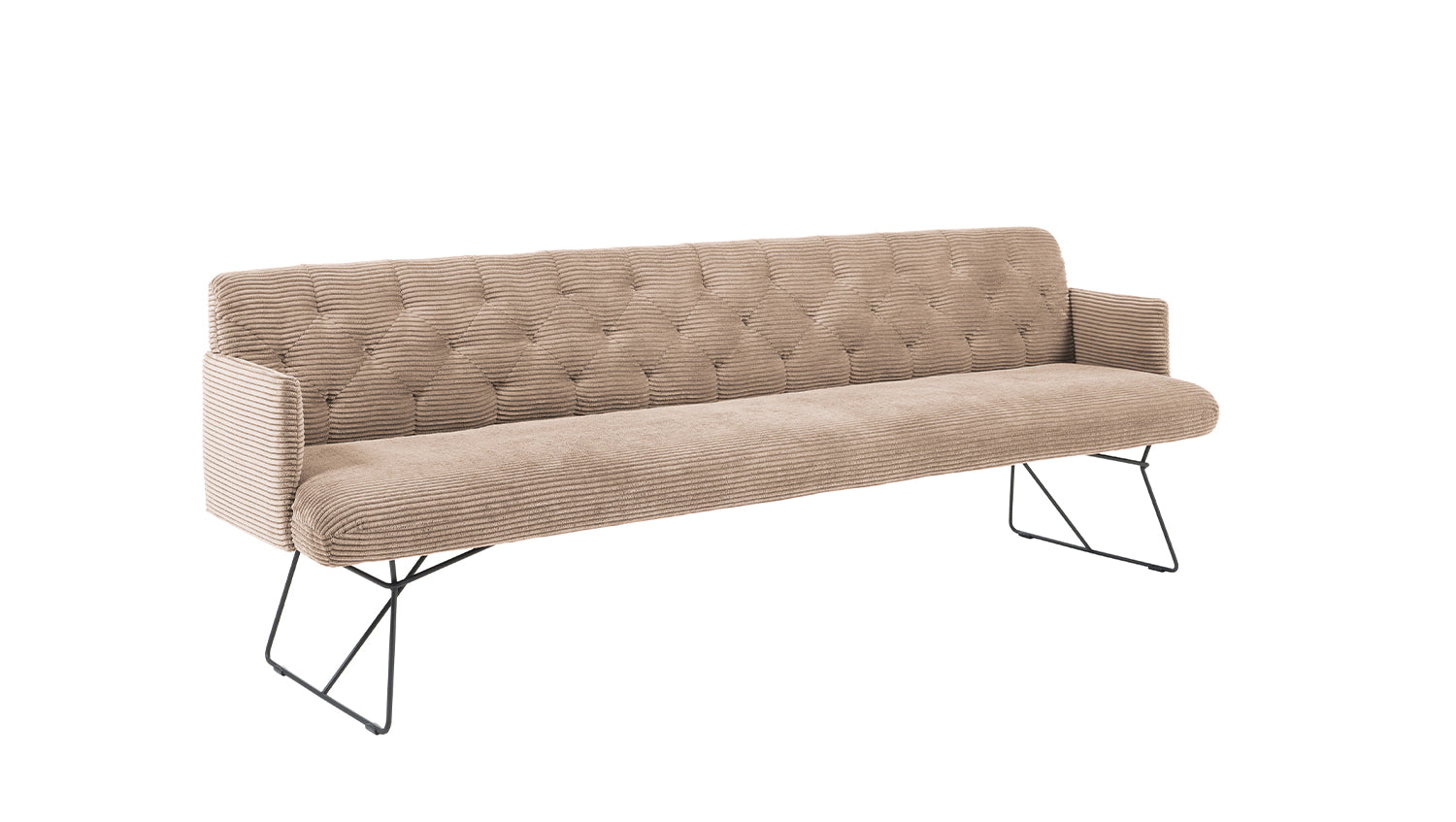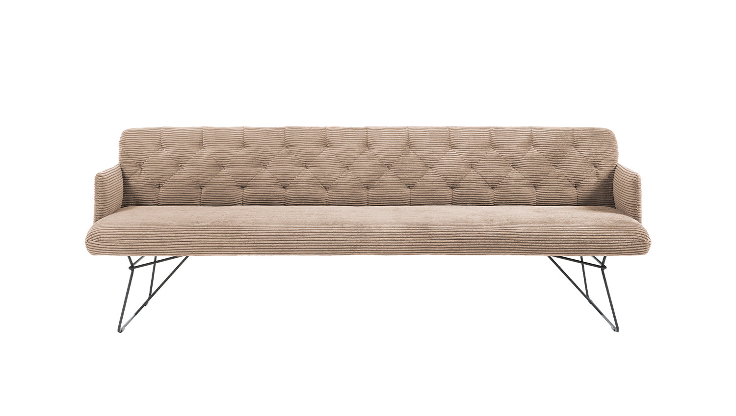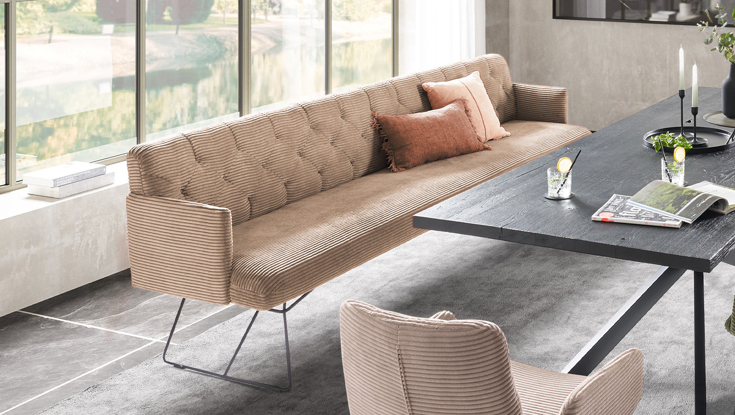 El banco de comedor KAWOLA CHARME aporta un aire vintage a cualquier habitación. Gracias a su diseño minimalista, el cómodo Banco tapizado se adapta a cualquier hogar e invita a pasar las tardes jugando con los amigos o la familia. El banco se caracteriza por su tapizado desenfadado y el elevado confort de asiento que conlleva. La estructura desenfadada del asiento es típica del modelo y el diseño ondulado acentúa el factor acogedor del banco. El acogedor tapizado se acentúa aún más con la suave funda de tela de pana de moda, que hace que la sensación del banco sea acogedora y cómoda. Como el banco de comedor CHARME está revestido totalmente de tela, también se puede colocar en cualquier lugar de la habitación. El Banco tapizado encaja perfectamente en su hogar gracias a sus pies de alambre y a su elegante tapizado de pana. El banco tiene capacidad para cuatro personas que pueden disfrutar de una comodidad de asiento sin restricciones.