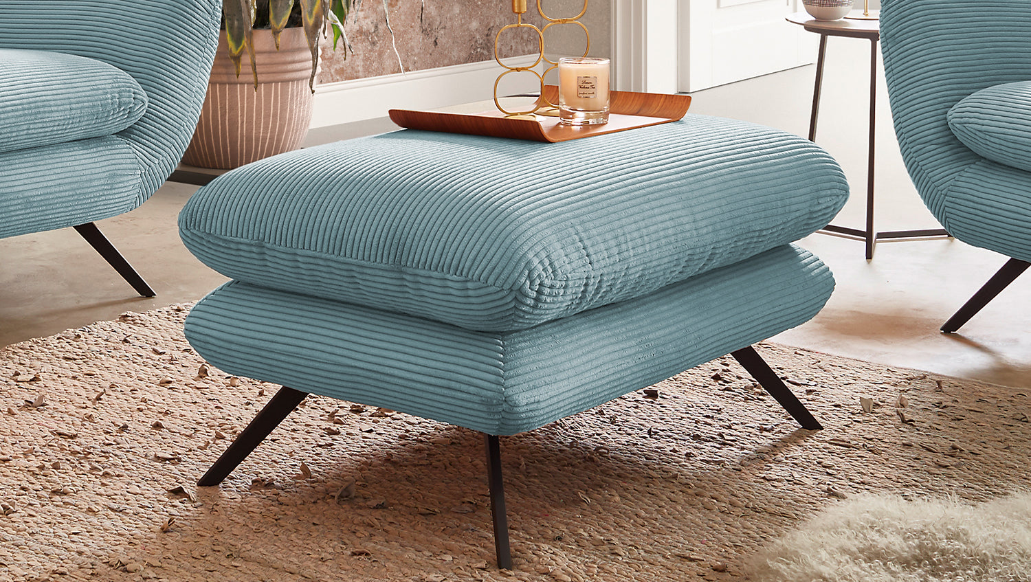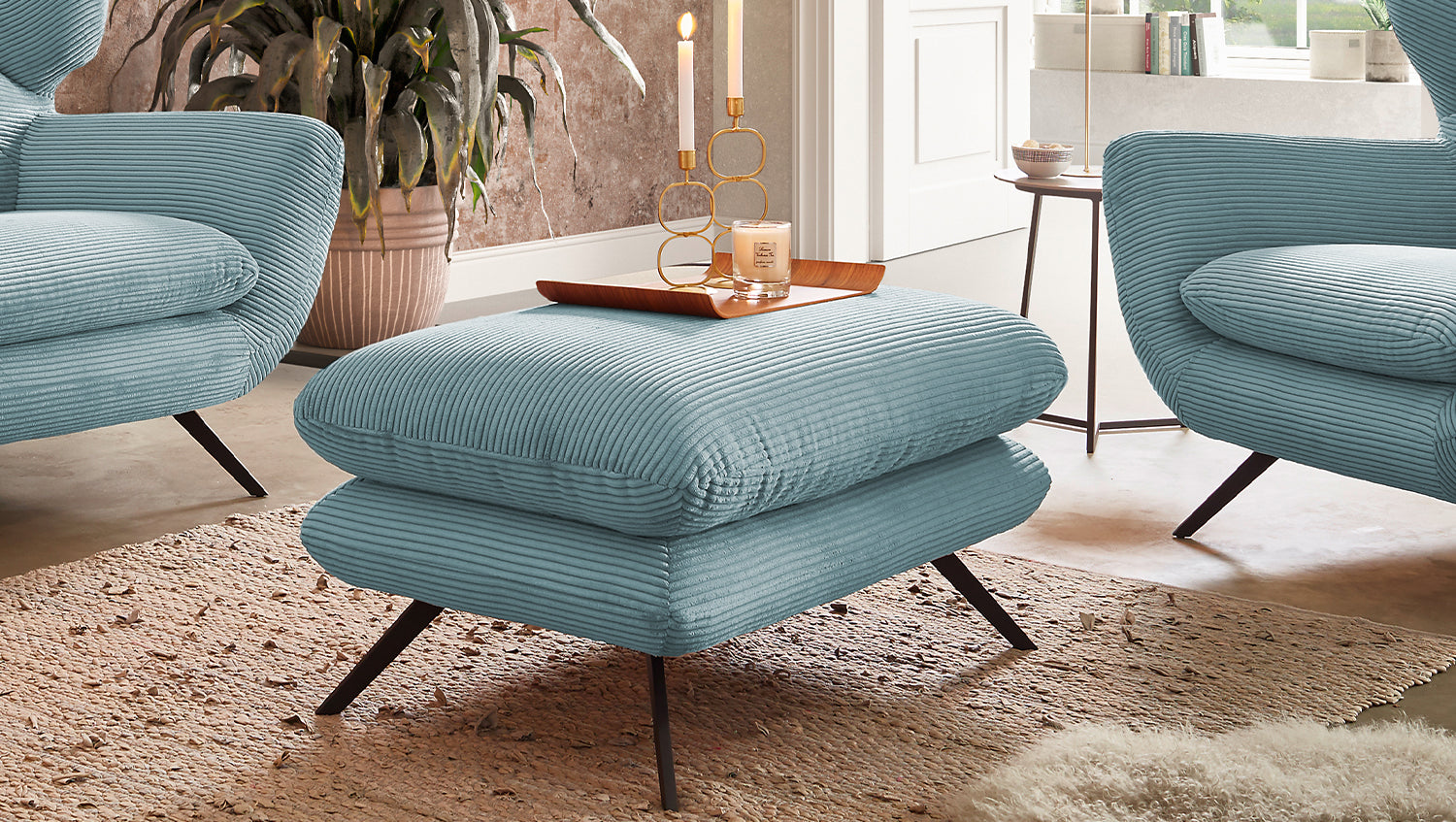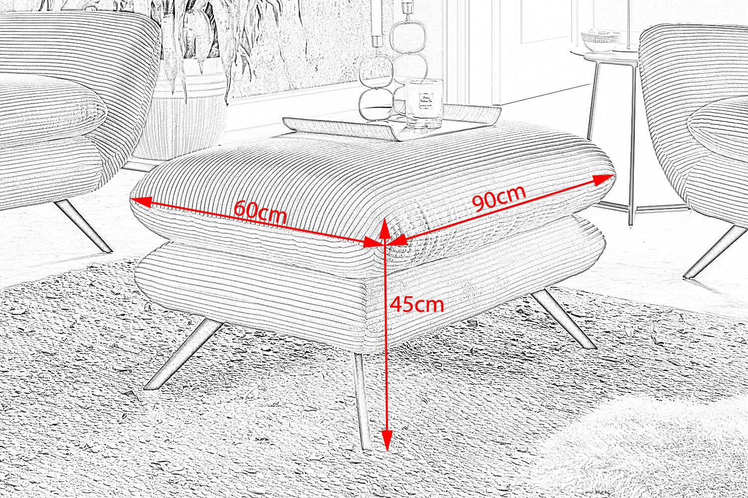 El taburete CHARME de KAWOLA es un banco taburete muy especial y pone nuevos acentos en el salón como auténtica pieza de diseño. El estilo del taburete CHARME recuerda a los años sesenta: en este caso se ha optado por el revestimiento de pana a juego con la forma inusual. Los pies de metal negro están ligeramente acampanados. El acolchado del banco taburete CHARME es de espuma PUR e impresiona por su comodidad de asiento suave y desenfadada. Naturalmente, el banco taburete está completamente revestido con la tela de pana, de modo que también puede colocarse en cualquier lugar de la habitación. Si no busca un simple taburete, sino un punto de atracción muy especial, ¡el banco taburete CHARME de KAWOLA es la elección perfecta!