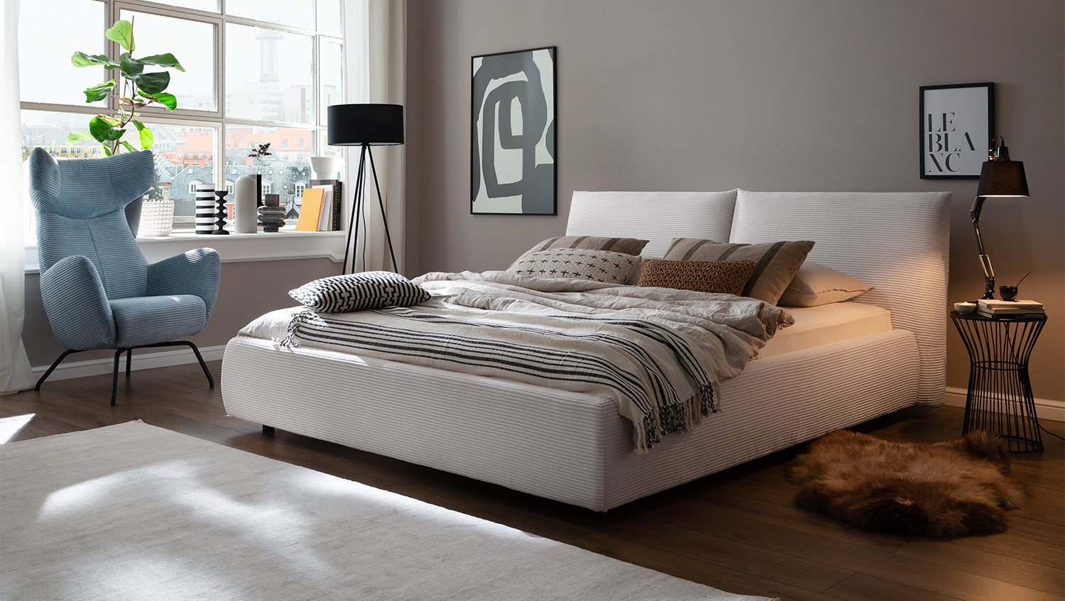 KAWOLA cama HENRY cama tapizada Pana blanco