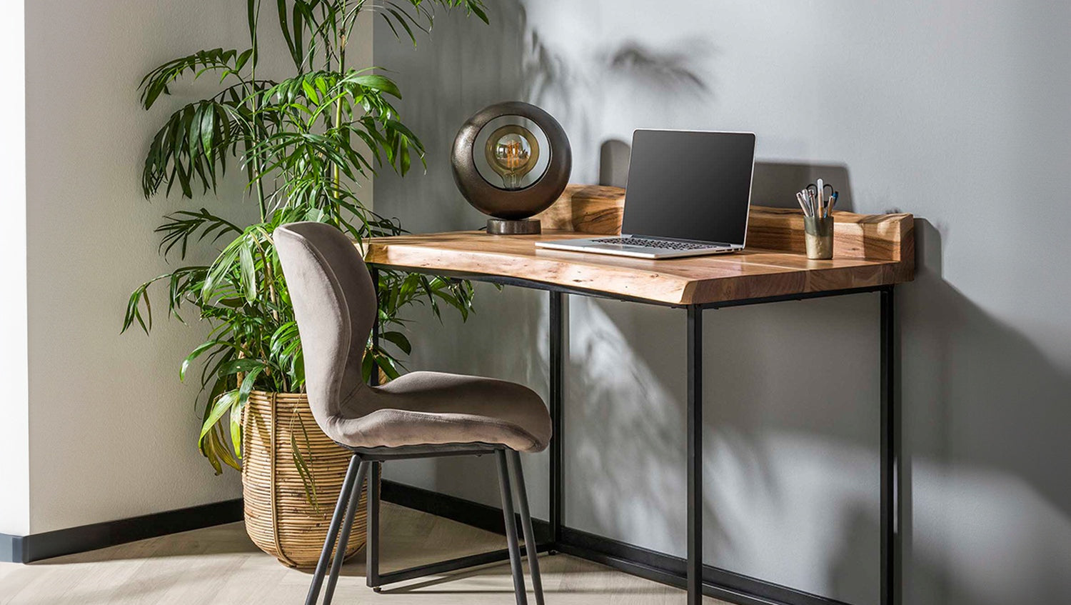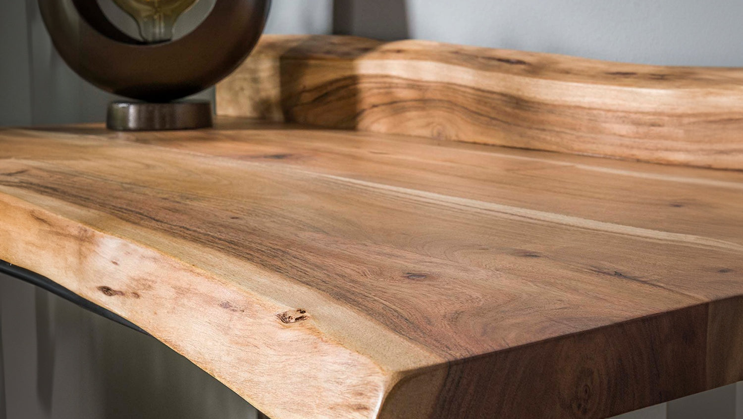 El escritorio FERHA de KAWOLA combina la fuerza natural con un diseño industrial minimalista. Fabricado en madera de acacia maciza, impresiona por su auténtico canto natural y su cálido veteado, perfectamente acentuado por un lacado mate transparente. El robusto pero delicado armazón de metal con recubrimiento de polvo negro acentúa su carácter moderno y garantiza la máxima estabilidad. Con un tablero de 60 cm de profundidad, FERHA ofrece mucho espacio para el trabajo o la creatividad. Su versatilidad permite utilizarla con la misma elegancia que un elegante tocador. Como parte de la serie Edge, FERHA es una declaración de diseño natural y funcional.