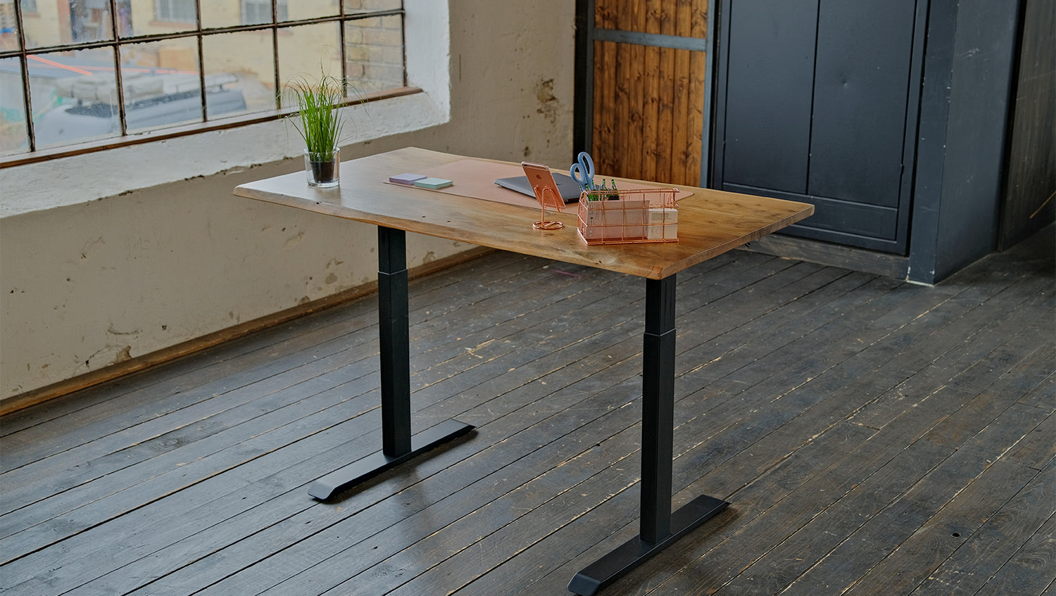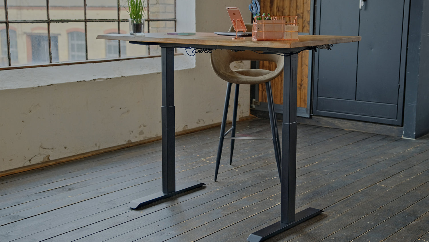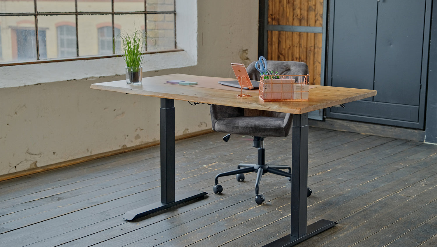 Escritorio KAWOLA LORA regulable eléctricamente en altura con borde de árbol macizo