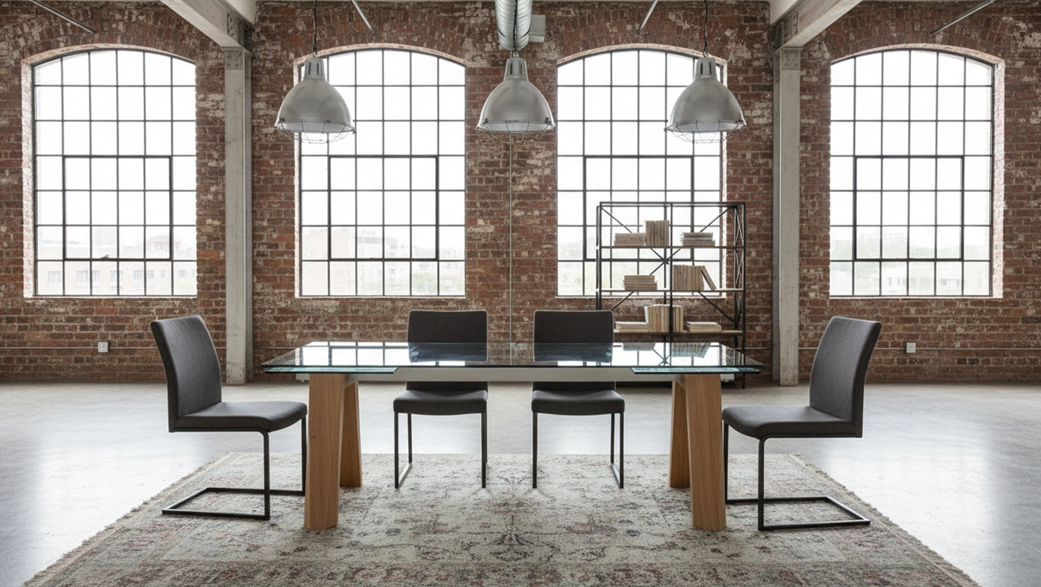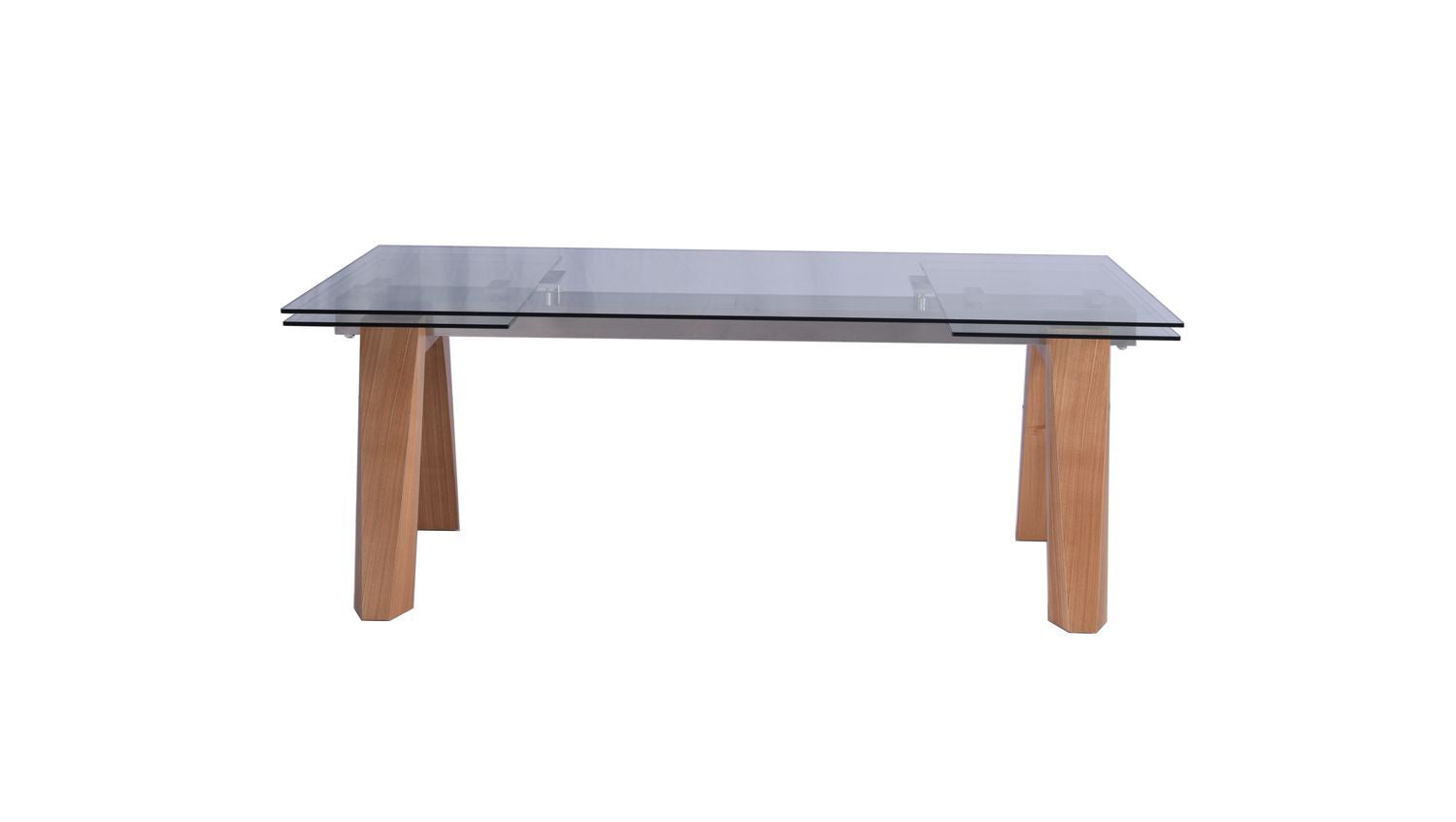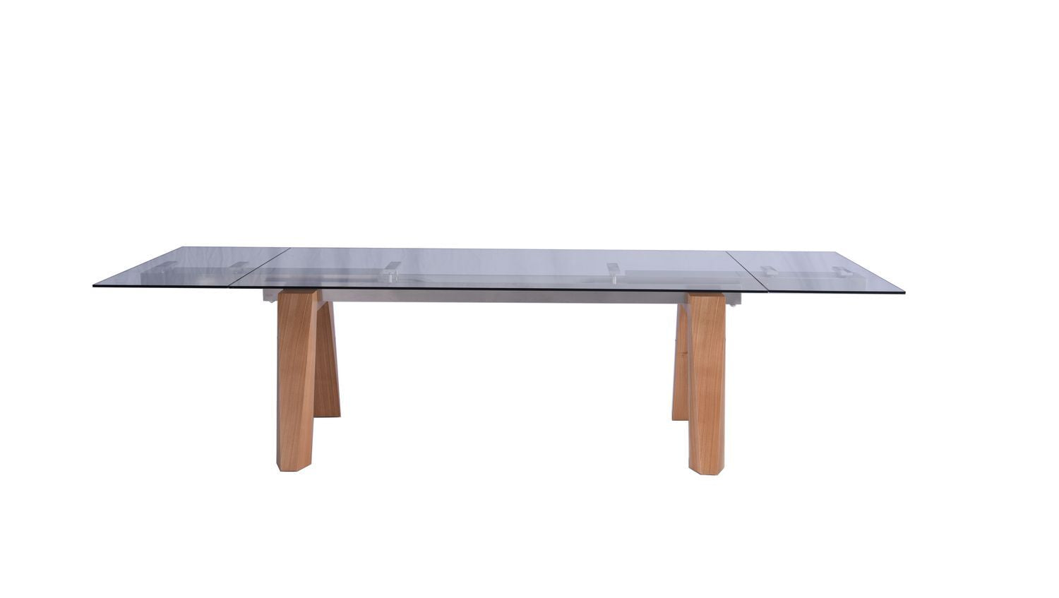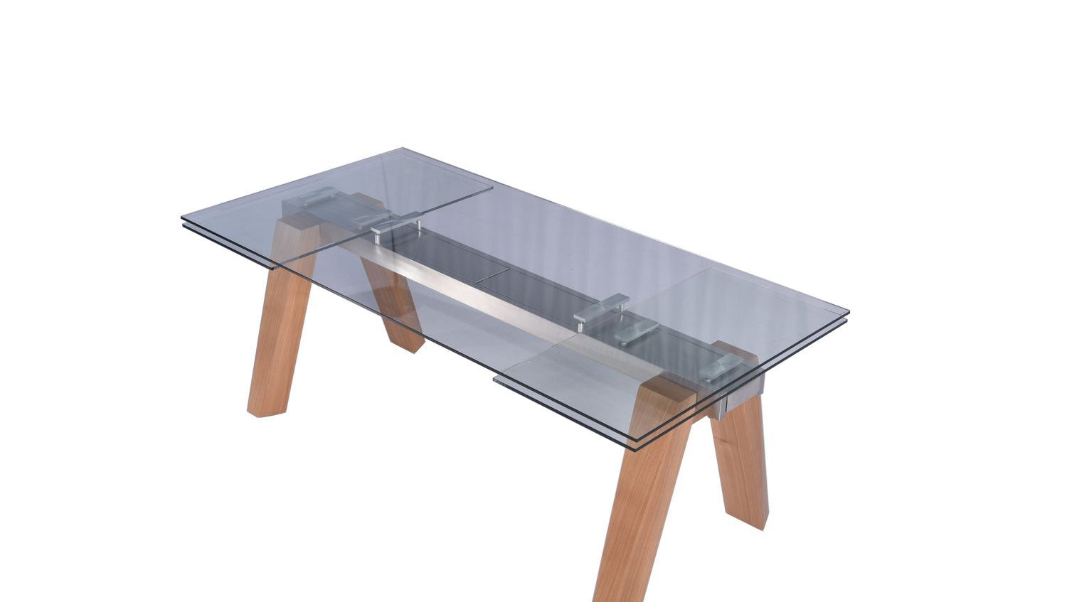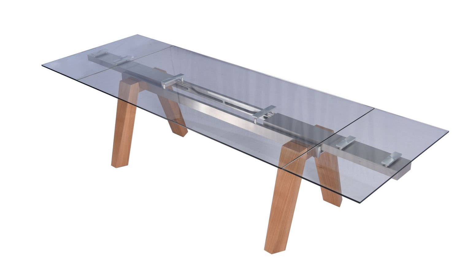 La Mesa de comedor Mounty impresiona por su maravillosa combinación de materiales; el tablero de la mesa es de cristal de 1 cm de grosor. El tamaño básico del tablero es de 200 cm y puede ampliarse mecánicamente hasta 300 cm. El armazón mecánico de acero inoxidable puede verse a través del tablero de cristal, lo que confiere a la mesa cierto encanto industrial. Las patas de la mesa son de madera maciza y garantizan una buena estabilidad. El cristal, el acero inoxidable y la madera hacen de la mesa un mueble único e insuperable. El tamaño de 200 cm encaja en cualquier habitación y puede ampliarse rápidamente hasta 300 cm cuando llegan invitados.