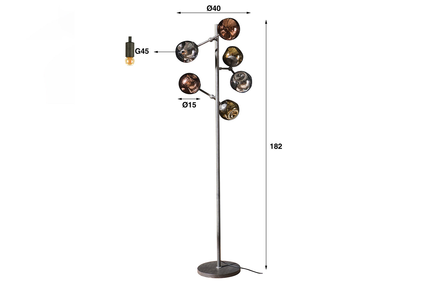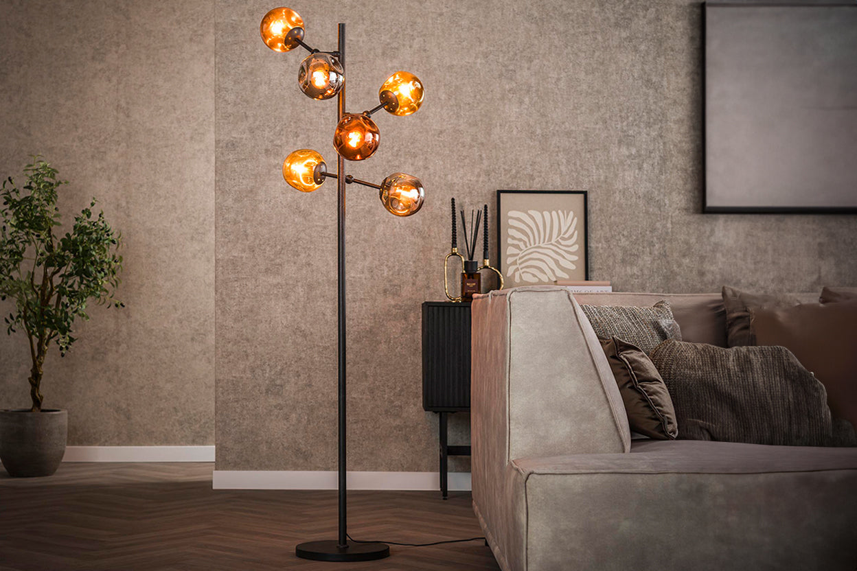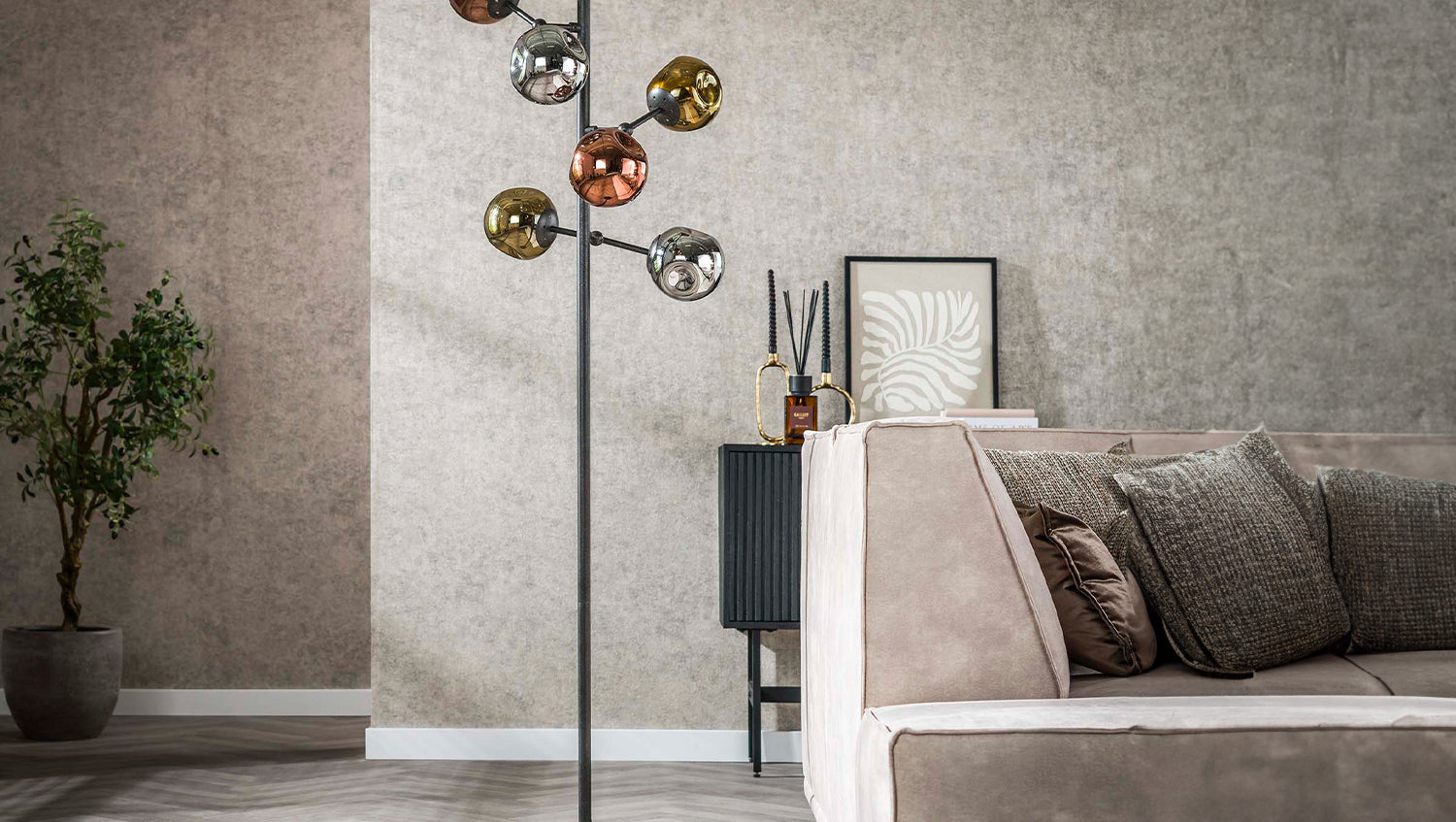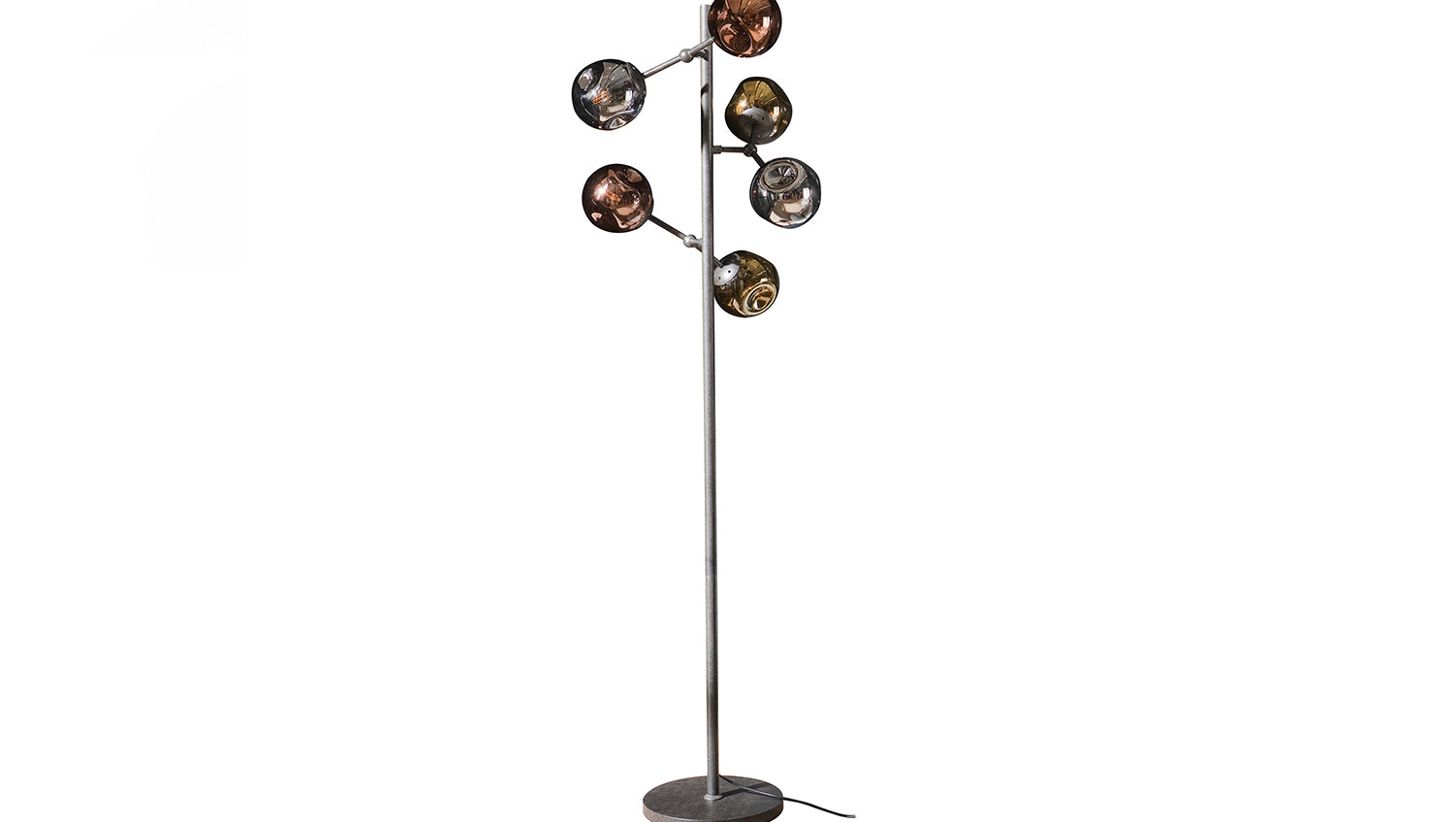 La lámpara de pie PELOTA de KAWOLA impresiona por su inusual diseño y se convierte en el centro de atención de cualquier habitación. Seis pantallas de cristal en los elegantes tonos cromo, oro y cobre crean emocionantes contrastes y fascinantes juegos de luz y color. Como resultado, la luminaria crea elegantes acentos luminosos e ilumina maravillosamente la estancia. Ideal para interiores modernos, la lámpara de pie PELOTA aporta belleza estética y funcionalidad práctica a su hogar.