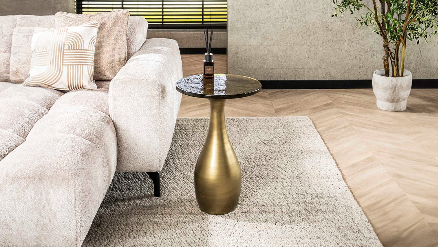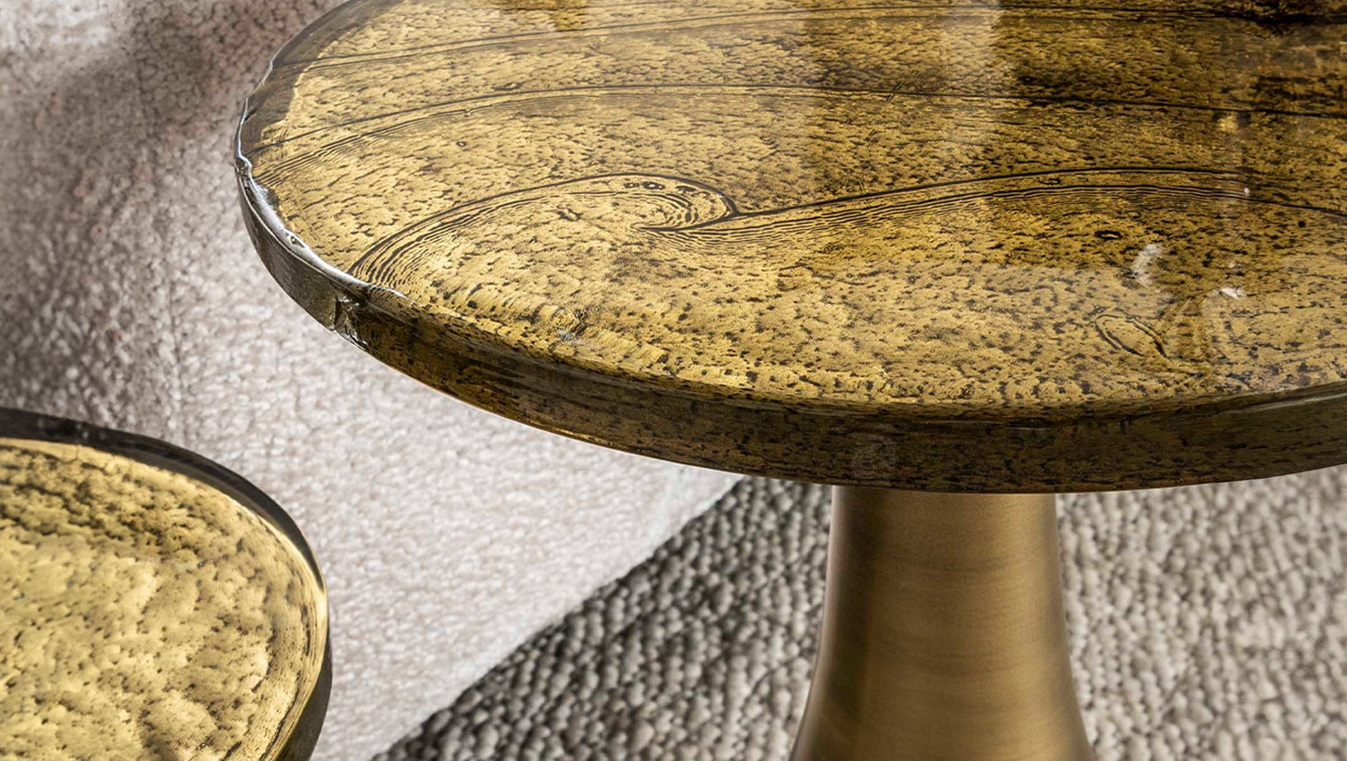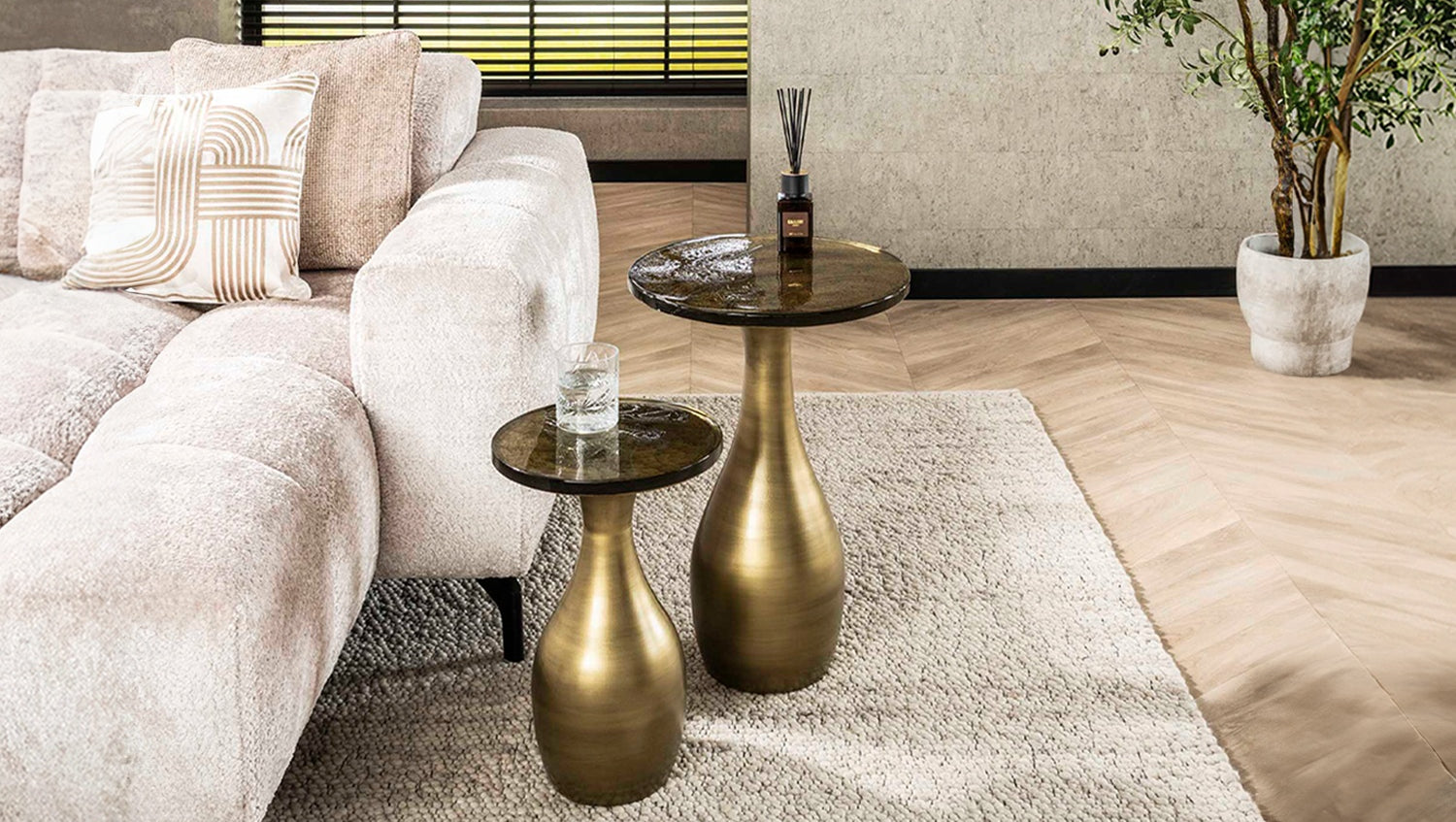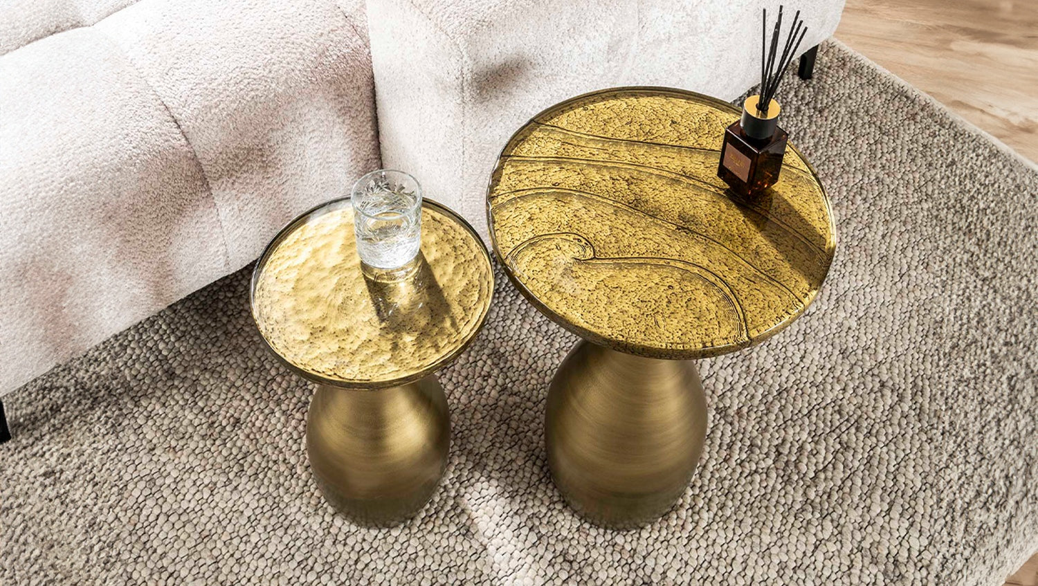 La mesa auxiliar MOKKA en tamaño M de KAWOLA es la combinación perfecta de diseño y funcionalidad. Su estructura metálica en forma de lágrima en brillante oro antiguo irradia elegancia y aporta un toque sofisticado a la estancia. El tablero de cristal estirado se caracteriza por su suave estructura ondulada y sus sutiles irregularidades que recuerdan a la artesanía tradicional. Con su forma de tamaño medio, MOKKA ofrece espacio suficiente para bebidas, libros o adornos, lo que lo convierte en un elegante compañero de diario. Gracias a sus líneas armoniosas, encaja perfectamente tanto en interiores modernos como clásicos y añade un acento discreto y lujoso dondequiera que se coloque.