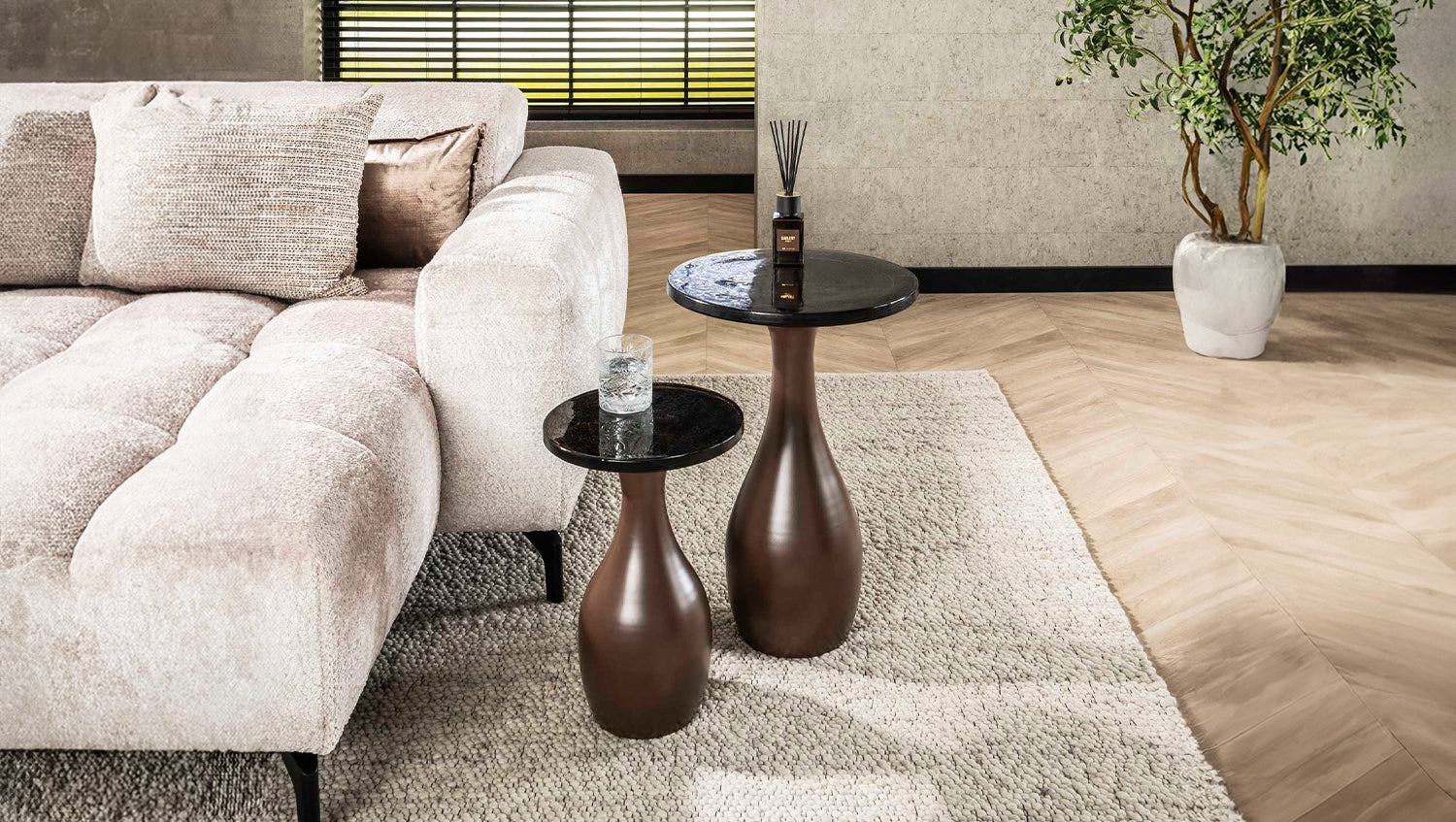 La mesa auxiliar MOKKA en tamaño S de KAWOLA combina un diseño artístico con una artesanía de alta calidad. La silueta en forma de gota del marco confiere a la mesa un aspecto especialmente elegante y la convierte en un elegante punto de atracción. El tablero de cristal estirado impresiona por su superficie ligeramente ondulada y sus pequeñas y finas irregularidades, que reflejan el encanto de la fabricación tradicional del cristal. El marco metálico de color a juego, en cobre antiguo u oro antiguo, añade un elegante acento a la vez que garantiza la estabilidad. Gracias a su tamaño compacto, esta mesa es ideal para exponer con gusto bebidas, libros o adornos. Ya sea como pieza decorativa independiente o como armoniosa compañera junto a un sofá o un sillón, esta mesa auxiliar aporta estilo y carácter a cualquier habitación.