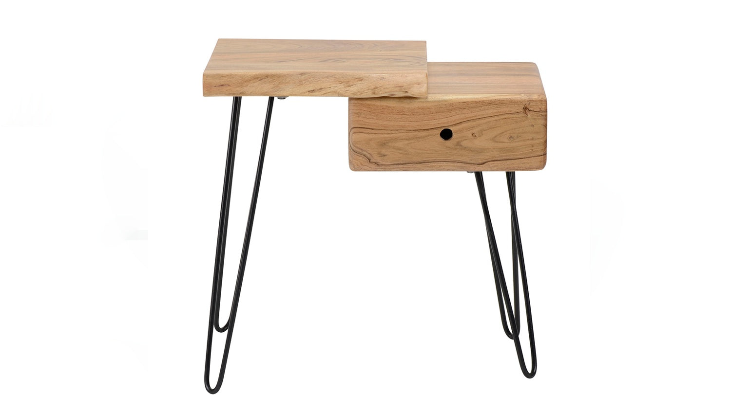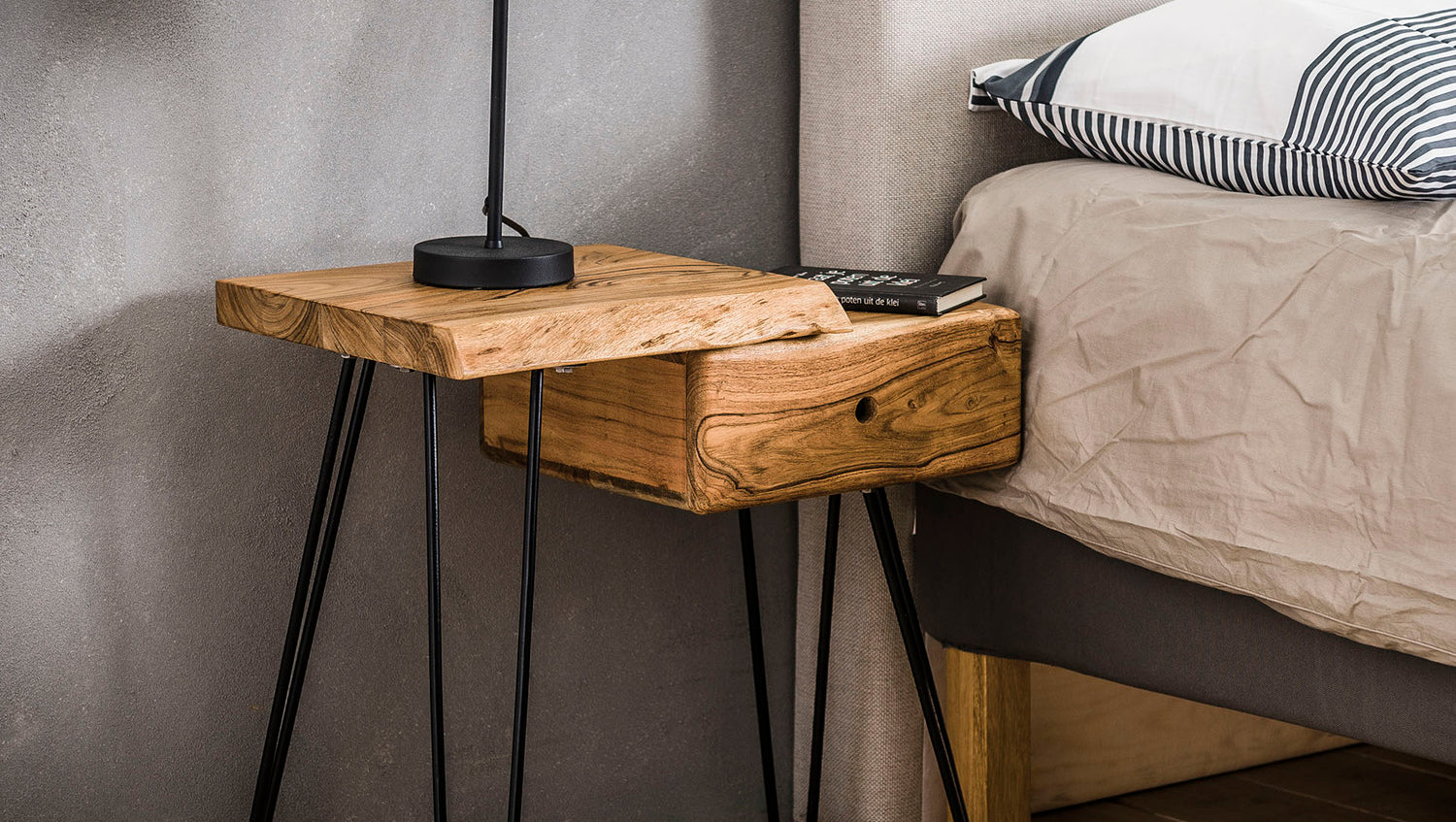 La mesilla de noche KAWOLA ERGEA impresiona por su diseño moderno y sus materiales naturales. Fabricada en madera de acacia maciza con un lacado transparente mate, aporta calidez y estructura a su dormitorio. La forma de tronco de árbol crea un aspecto natural. La mesilla dispone de una cajonera en el lado derecho y un estante. La mesilla se completa con una pata fina de metal negro con recubrimiento en polvo. Con sus dimensiones de 60 x 32 x 59 cm, ERGEA no sólo es versátil como mesilla de noche, sino también como mesa auxiliar. La mesilla de noche ERGEA combina funcionalidad, calidad artesanal y un diseño expresivo: ideal para conceptos de vida modernos con carácter natural.