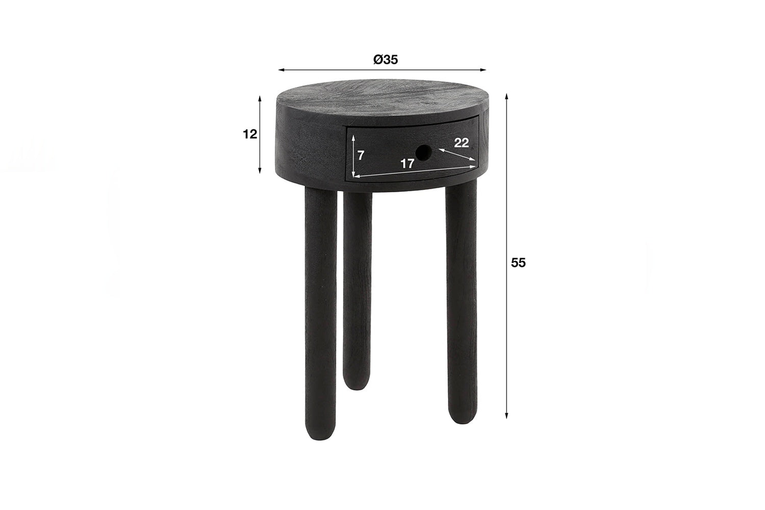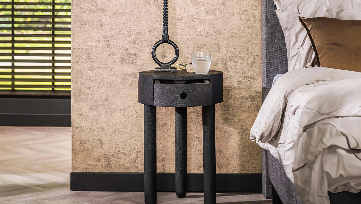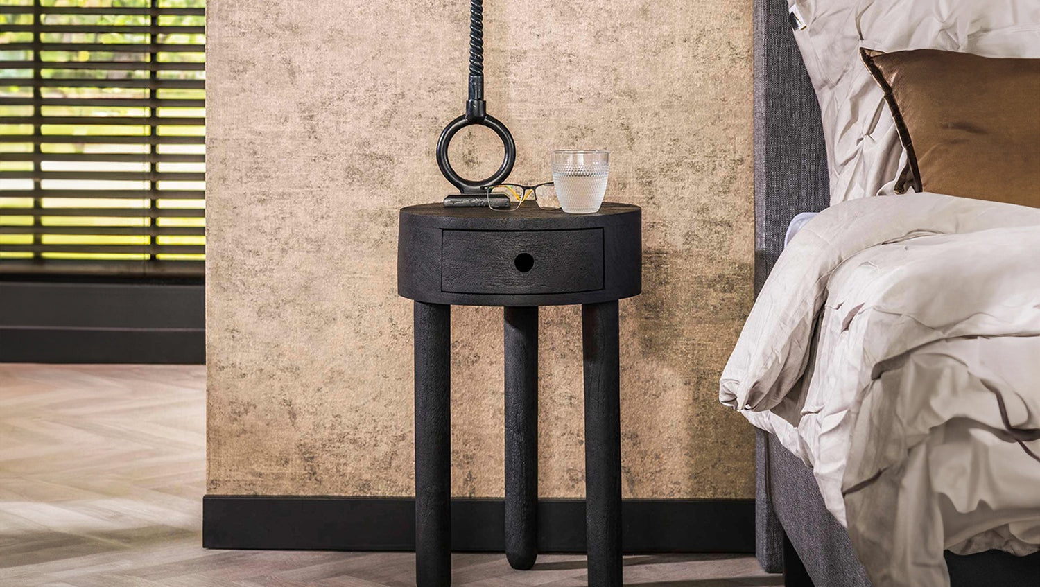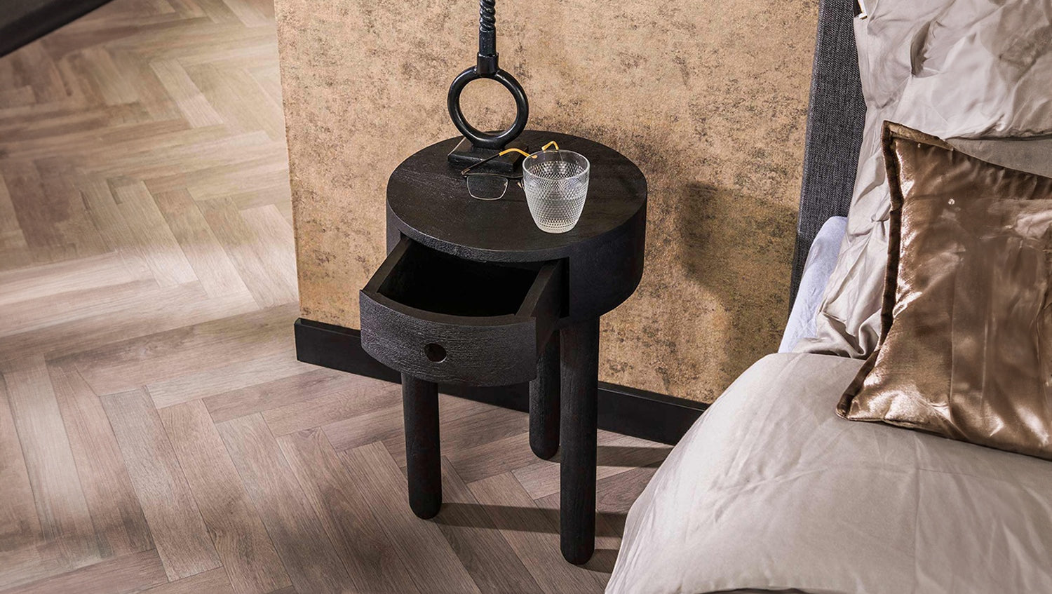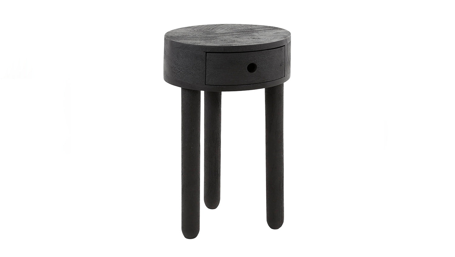 La mesilla de noche KAWOLA RIDA convence por su diseño redondeado y su elaboración de alta calidad en madera maciza de mango con acabado en negro. Las formas suaves y redondeadas confieren a la mesita de noche un aspecto moderno y cálido a la vez. La madera de mango suavemente lijada proporciona una superficie lisa que resalta las vetas naturales de la madera. Equipada con un práctico cajón, RIDA ofrece mucho espacio de almacenamiento para objetos personales y mantiene las cosas organizadas junto a la cama. Con sus dimensiones compactas de 35 x 35 x 55 cm, la mesilla de noche es ideal para habitaciones pequeñas o como acento de estilo en cualquier dormitorio. La mesilla de noche RIDA combina diseño, funcionalidad y calidad: perfecta para un entorno moderno.