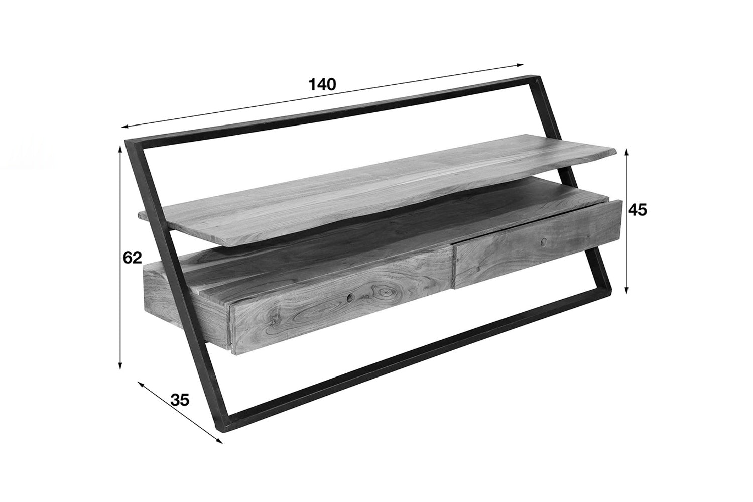 El Aparador de TV VITA está fabricado en madera de acacia y metal con recubrimiento en polvo. Este mueble ofrece espacio para todos sus dispositivos multimedia y adornos. Fije su televisor a la pared como se muestra en la imagen del producto encima del mueble (soporte de pared no incluido). La capacidad de carga máxima del estante superior es de 10 kg y no es adecuado para colocar un televisor. La capacidad de carga máxima de la sección de cajones es de 35 kg. Coloque un televisor con un tamaño de 32 a 55 pulgadas encima de esta unidad para mantener el equilibrio. El Aparador es fácil de montar y se incluye el material de fijación necesario. El artículo puede fijarse a la pared en unos sencillos pasos. Para ello, la estructura metálica está provista de orificios, y en la pared posterior de la sección de cajones también hay orificios pretaladrados. El Mueble bajo VITA combina la funcionalidad con un diseño atractivo y es la elección perfecta para cualquier persona que valore la calidad y la estética. Una auténtica joya para su salón.