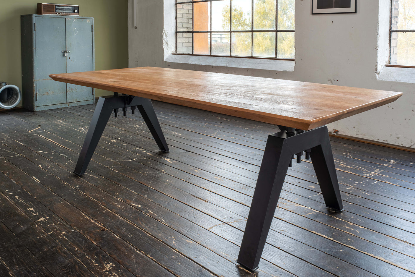 La mesa de madera maciza REY de KAWOLA combina materiales de alta calidad con un estilo moderno, lo que la convierte en el centro de atención de cualquier comedor. La superficie del tablero de madera maciza de acacia está cepillada y es de color roble, lo que acentúa a la perfección el veteado natural de la madera. Destaca especialmente el canto suizo, que confiere al tablero un efecto ligero, casi flotante, gracias a su forma biselada: un sutil pero eficaz punto de atracción. El bastidor de base soldado rústico y lacado en negro, de diseño industrial, confiere a la mesa un toque moderno e industrial. Esta acertada combinación de madera natural y metal robusto convierte a la mesa en un elemento de diseño destacado en su comedor. Disponible en longitudes de 200 cm, 220 cm, 240 cm, 260 cm, 280 cm y 300 cm, la mesa ofrece mucho espacio para comidas en común o veladas acogedoras. La Mesa de comedor REY es la elección perfecta para cualquier persona que aprecie el diseño moderno y la mano de obra de alta calidad. Una pieza única para cualquier salón o comedor.