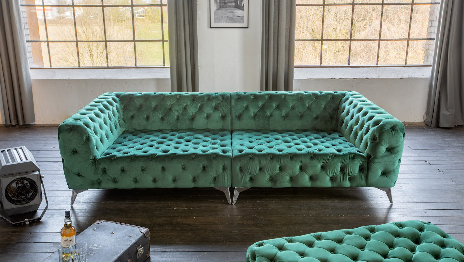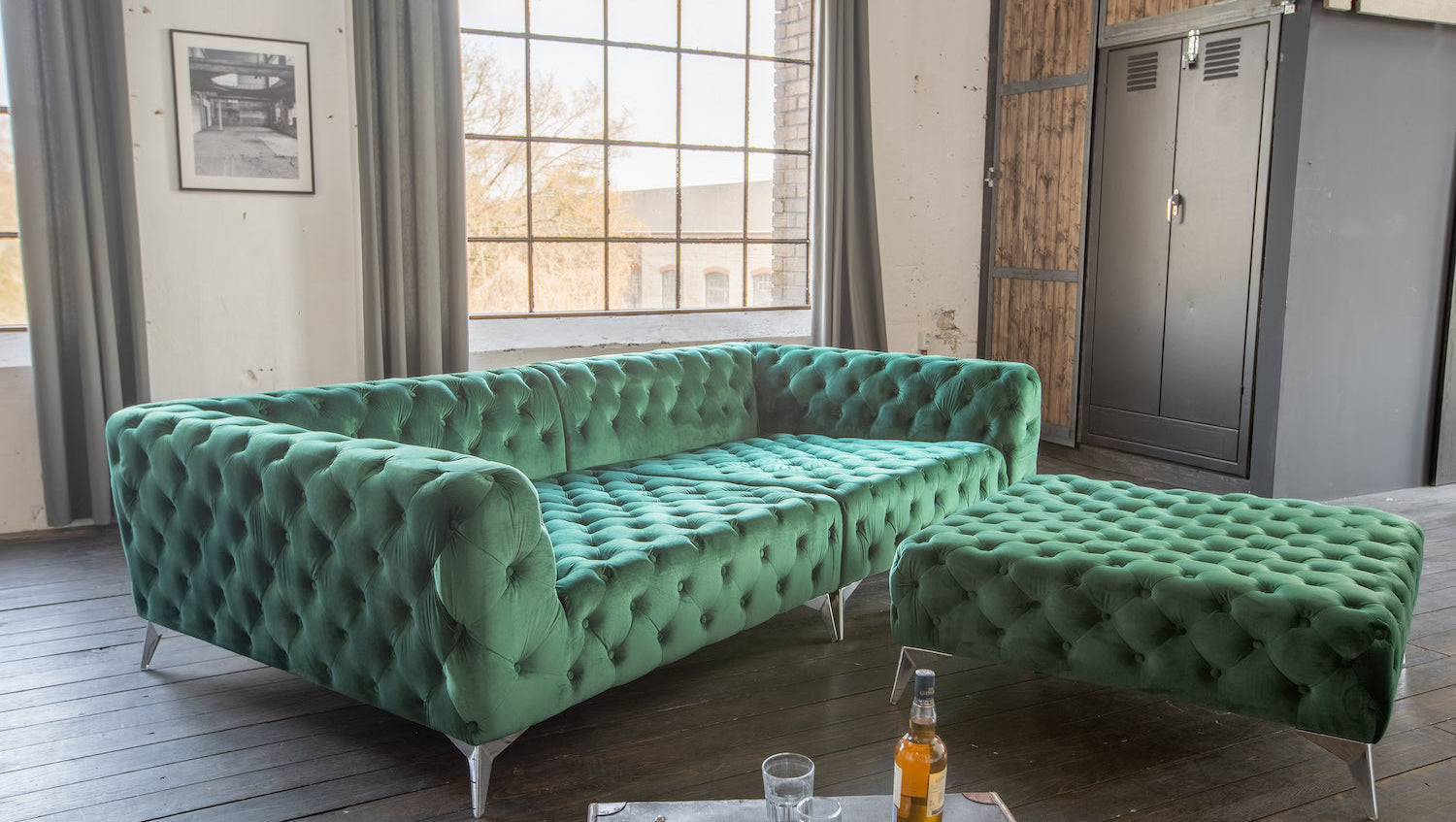 El Sofá extra ancho NARLA de KAWOLA es una auténtica joya en su salón El sofá se inspira en el estilo Chesterfield con su acolchado y su forma. La funda del sofá está hecha de tela aterciopelada de alta calidad y es agradablemente suave. Los modernos pies de metal destacan visualmente del mueble, creando un hábil contraste con la forma tradicional del sofá. El armazón interior del sofá es de madera maciza. El asiento tiene una suspensión de muelles ondulados y ofrece un asiento estupendo y cómodo.