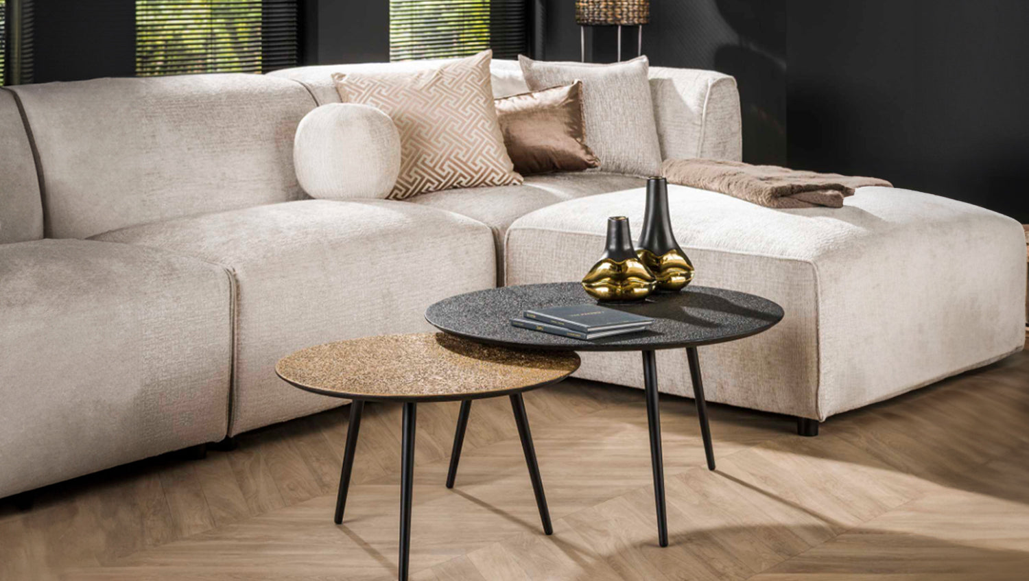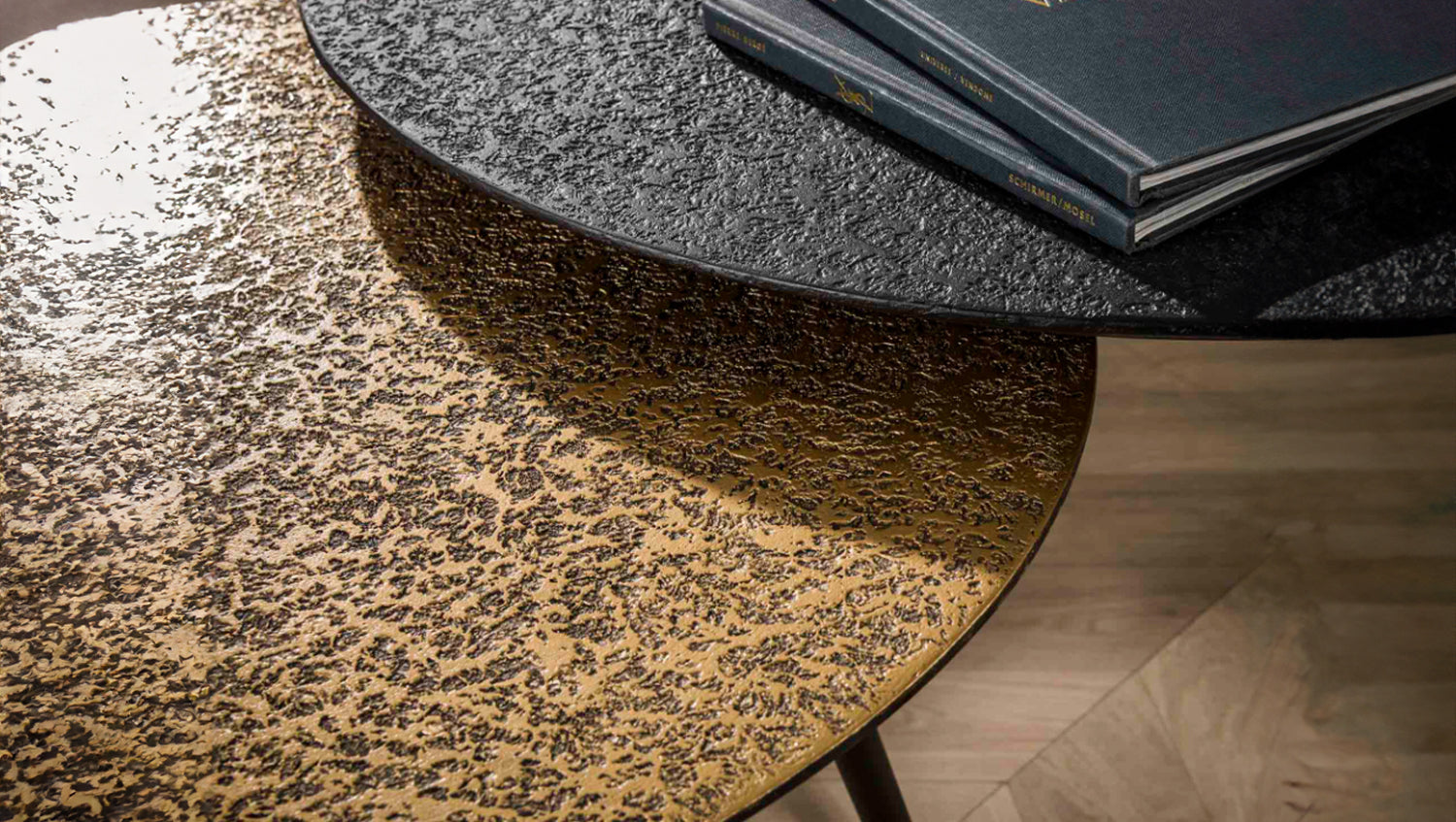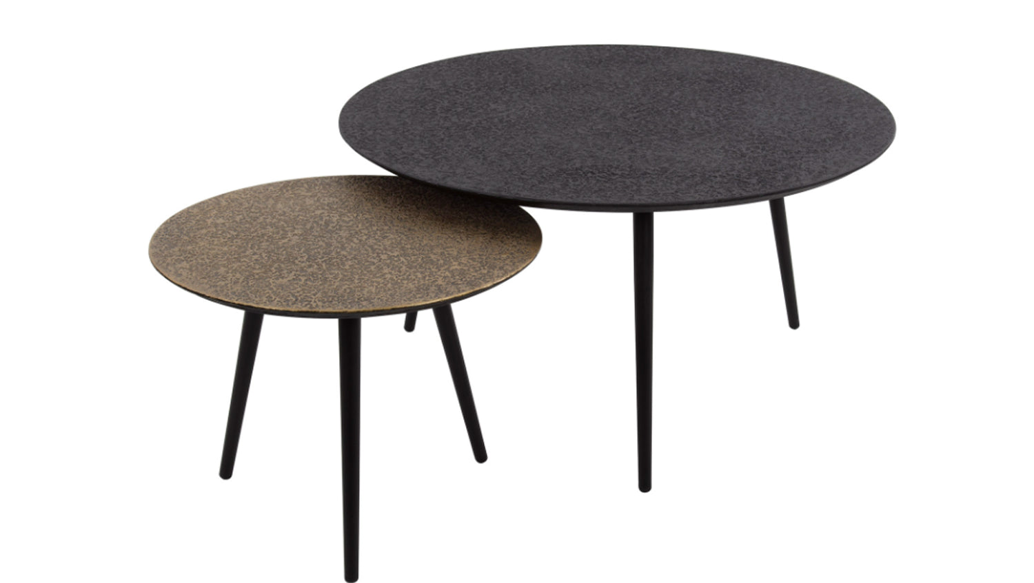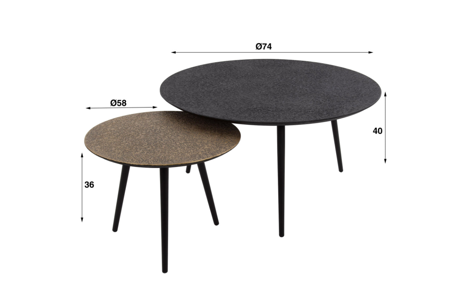 El precioso juego de mesa de centro LAUCA de KAWOLA tiene un acabado "metálico" en bronce antiguo/oro y negro. El tablero tiene un bonito acabado que le da un aspecto único. Las mesas se pueden combinar como se desee. Este conjunto llama la atención. Consta de dos mesas. La más grande tiene un diámetro de 74 cm y una altura de 40 cm, mientras que la más pequeña tiene un diámetro de 58 cm y una altura de 36 cm. Ya sea en un moderno loft, en un acogedor salón o en una elegante sala de estar, el juego de mesa de centro LAUCA pone acentos de estilo y combina funcionalidad con una estética atemporal.