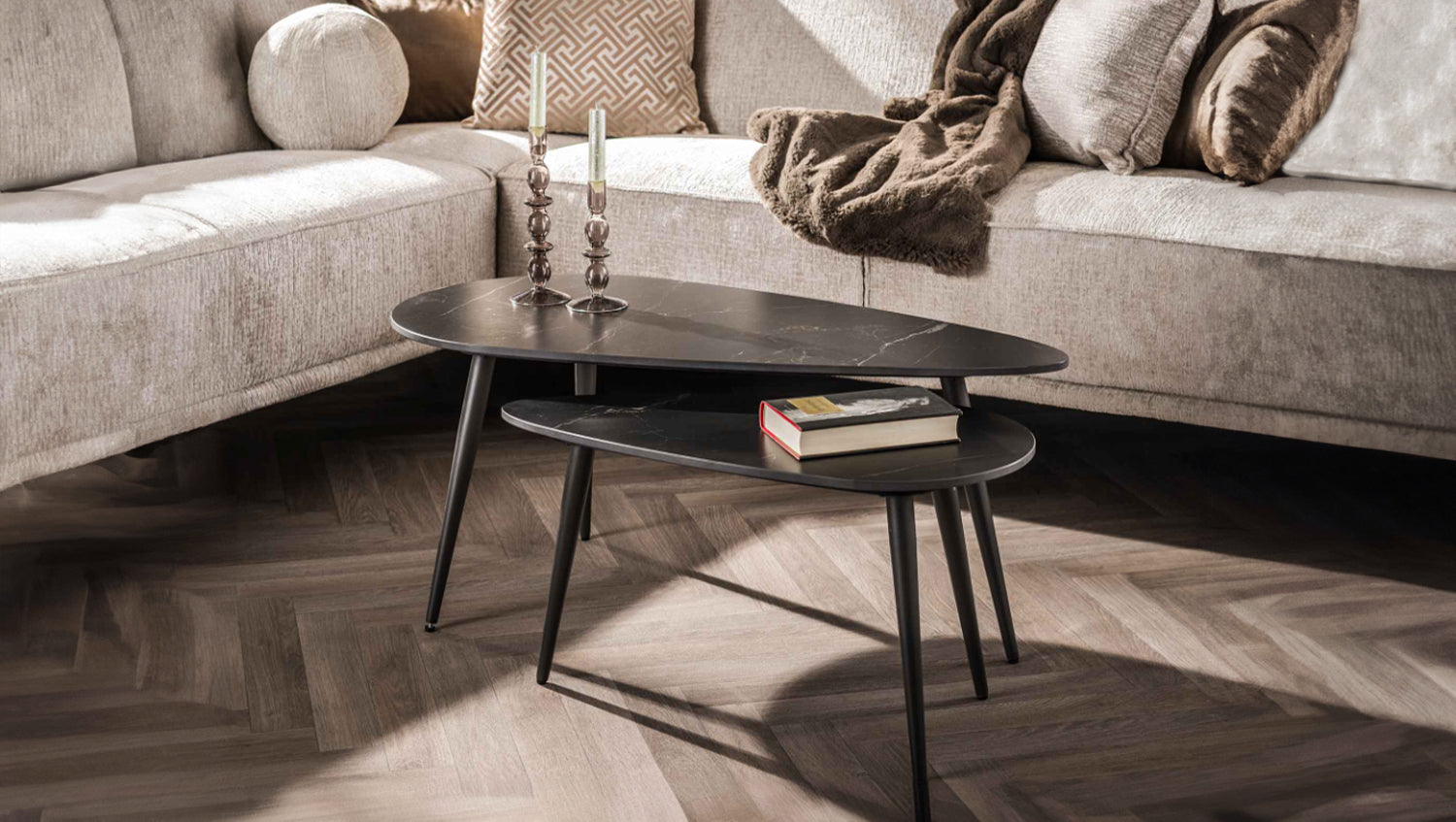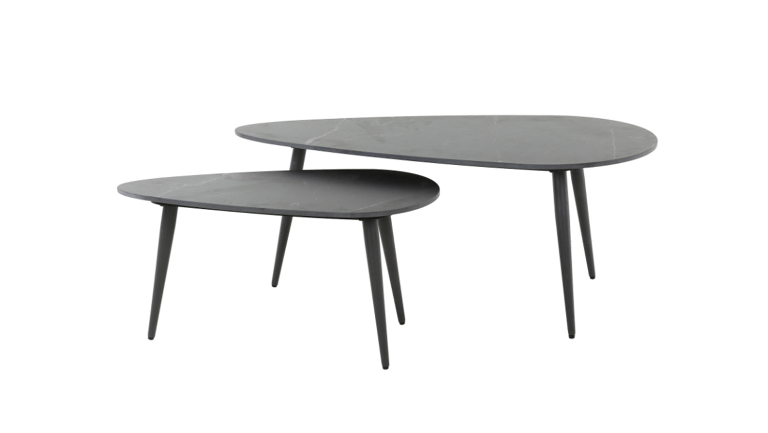 El juego de mesa de centro con forma de riñón SERIDO de KAWOLA está fabricado en cerámica negra. El tablero de cerámica confiere a este juego de dos mesas de centro un aspecto lujoso. La mesa más grande tiene una anchura de aprox. 100 cm, una profundidad de aprox. 50 cm y una altura de 40 cm. La mesa más pequeña tiene una anchura de unos 70 cm, una profundidad de unos 35 cm y una altura de 35 cm. Debido a la diferencia de altura, las mesas pueden colocarse juntas como se desee. También pueden combinarse perfectamente con diferentes estilos de mobiliario. Ya sea en un moderno loft, en un acogedor salón o en una elegante sala de estar, el juego de mesas de centro SERIDO pone acentos de estilo y combina funcionalidad con una estética atemporal.