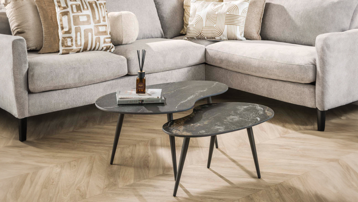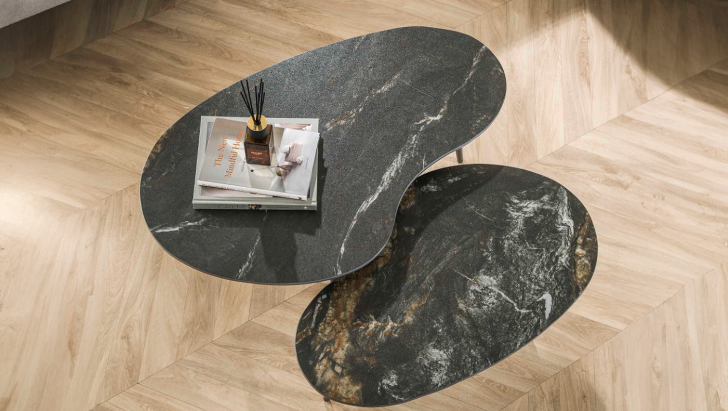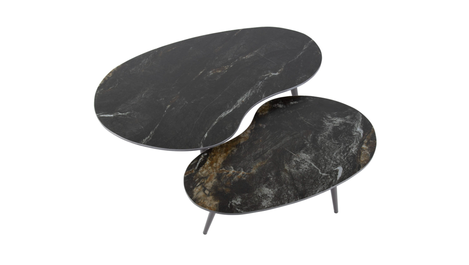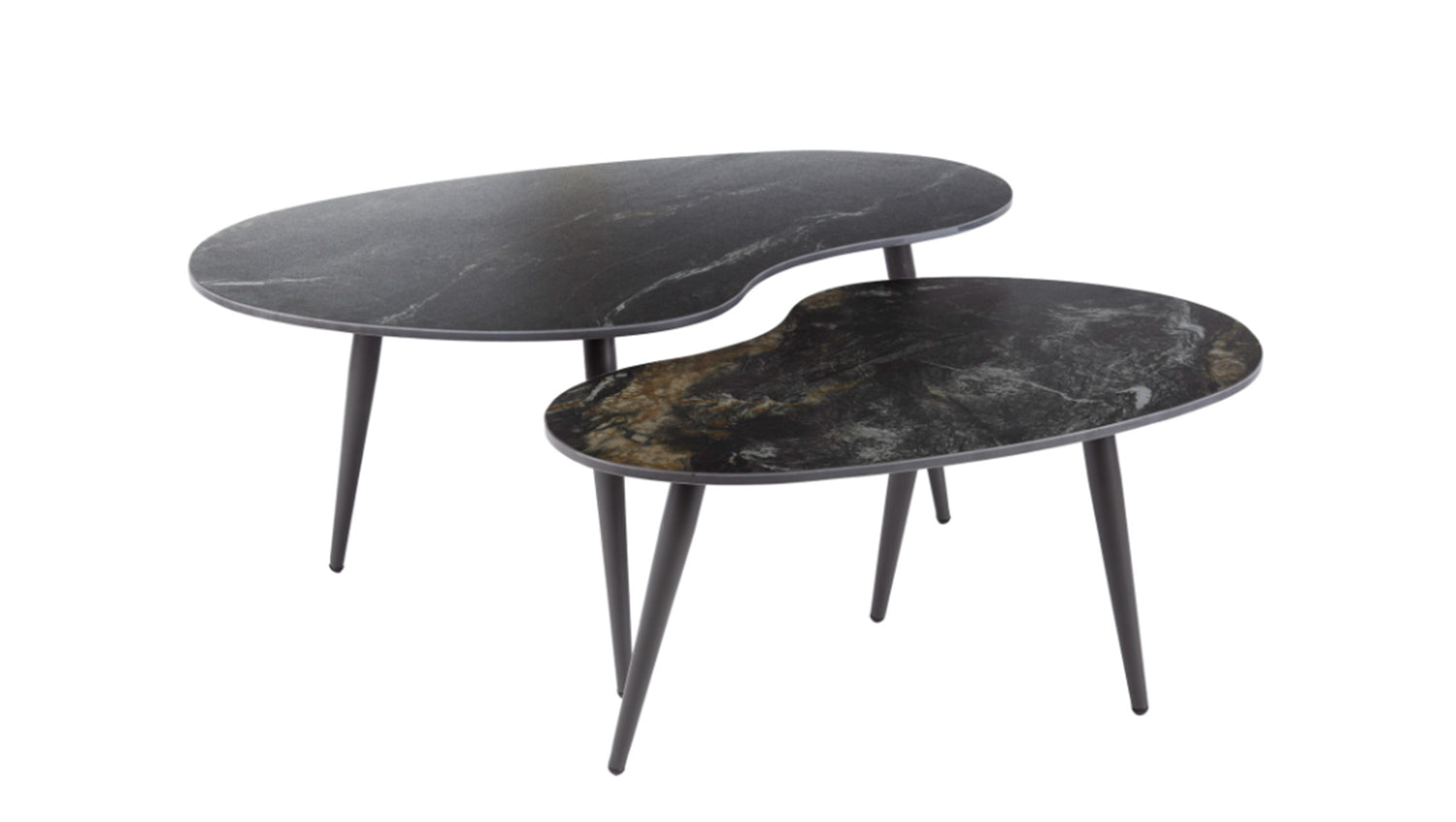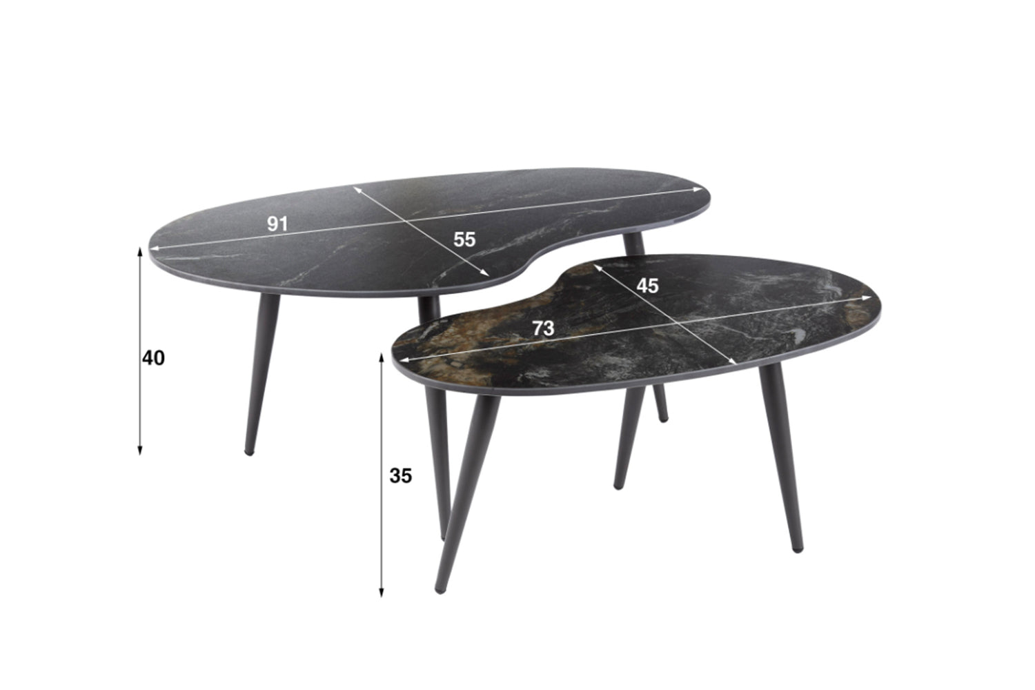 El elegante juego de mesa de centro PONTE de KAWOLA, con forma de riñón, combina una estructura minimalista con un lujoso tablero de cerámica que le confiere un aspecto sofisticado, perfecto para interiores modernos y clásicos. Estas mesas son versátiles y funcionales. El juego consta de dos mesas. La mesa más grande tiene una superficie de 71 x 56 cm y una altura de 40 cm, y la mesa más pequeña tiene una superficie de 58 x 47 cm y una altura de 36 cm. Ya sea moderno, rústico o clásico, el conjunto de mesas de centro PONTE se adapta sin esfuerzo a cualquier estilo de decoración gracias a su aspecto atemporal. Ideal como centro de mesa con estilo en el salón y una auténtica atracción para los amantes de los muebles de alta calidad.