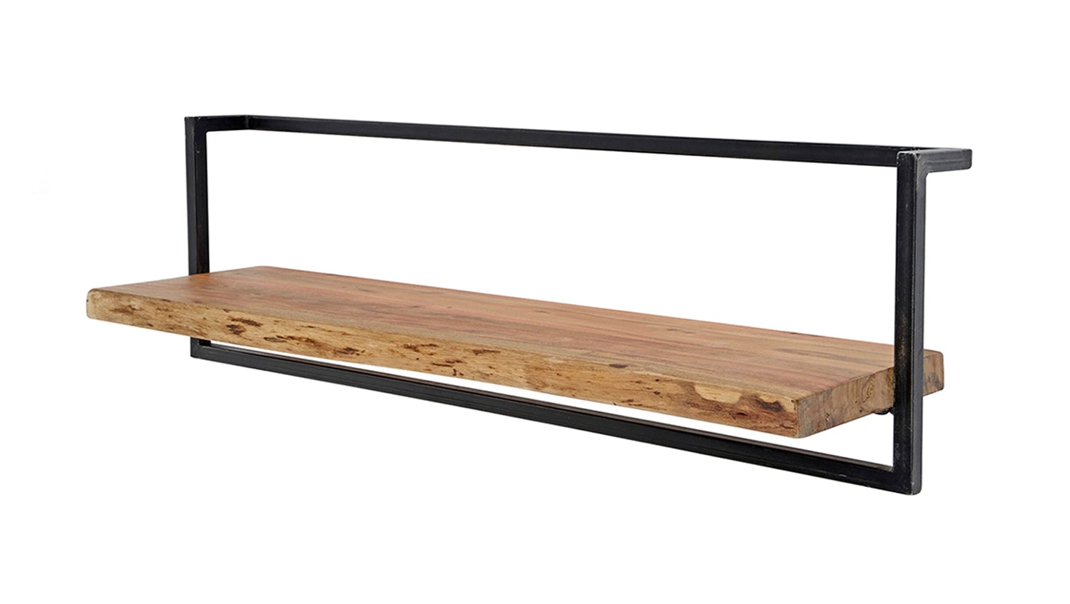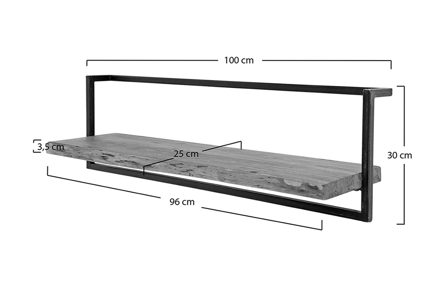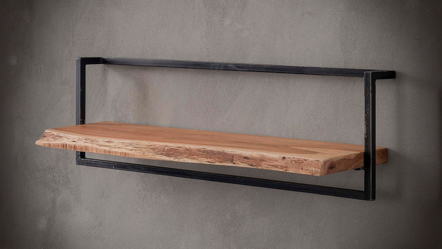 La estantería de pared KAWOLA ERGEA de 100 cm es un impresionante mueble que combina la belleza natural de la madera de acacia con un robusto diseño industrial. Consta de una balda de 96 cm de ancho fabricada en madera de acacia maciza, cuyos extremos tienen una robusta forma de tronco de árbol lijado que le confiere un aspecto auténtico y único. La plancha de madera está rodeada por un robusto marco de acero vintage, que confiere a la estantería su carácter inconfundible. La instalación es sencilla y segura en la pared gracias a dos ojales de fijación.