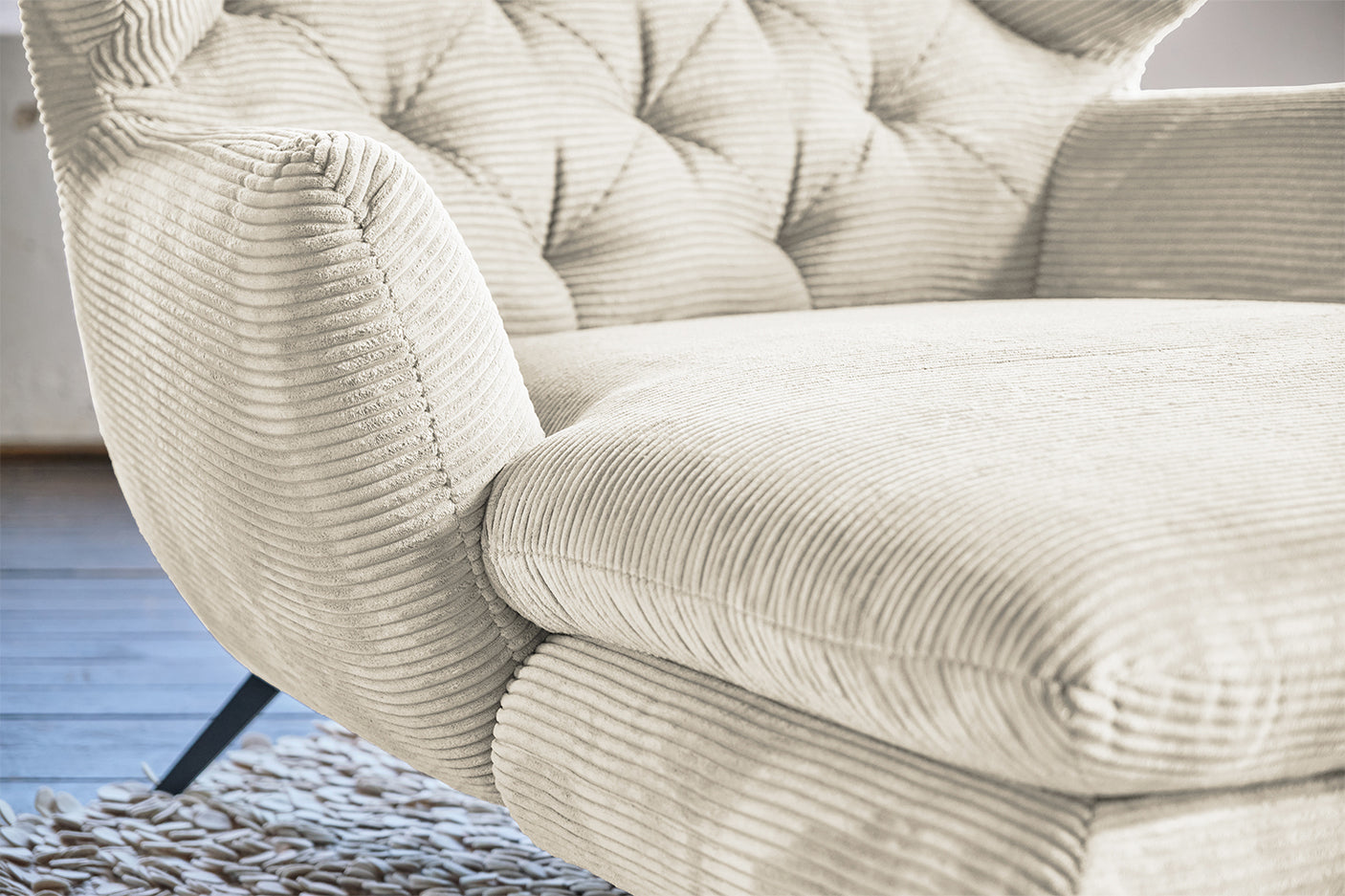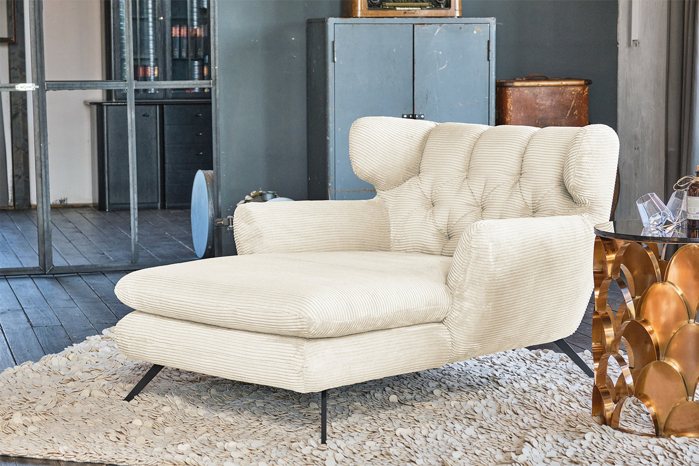 El acolchado de la chaise longue KAWOLA CHARME es de espuma PUR e impresiona por su suave y desenfadado confort de asiento. Naturalmente, el asiento largo está completamente tapizado con la tela Pana, de modo que este estupendo sofá reclinable también puede colocarse en cualquier lugar de la habitación. Si no busca simplemente un sillón largo, sino un punto culminante muy especial, ¡la otomana KAWOLA CHARME es la elección perfecta!