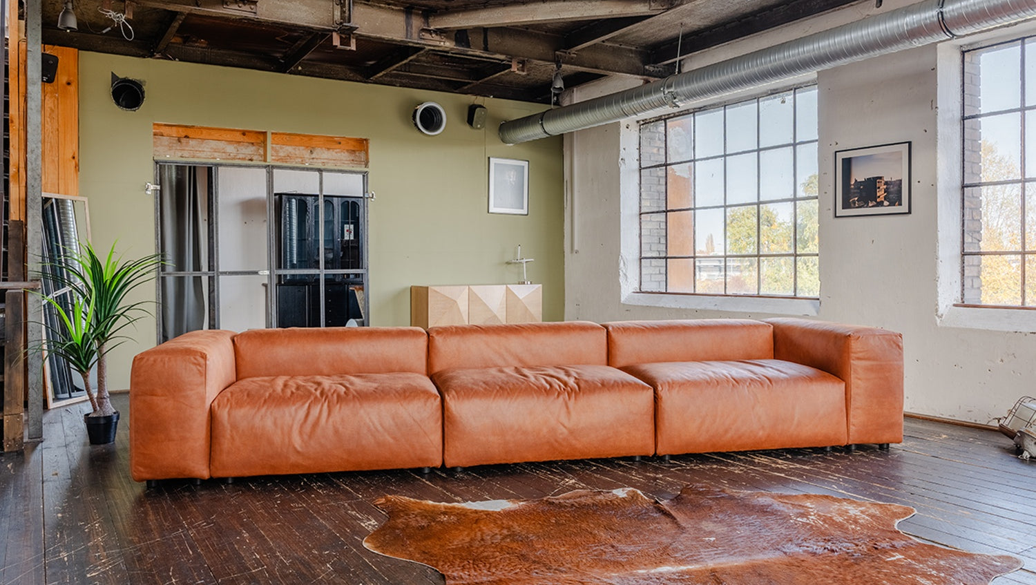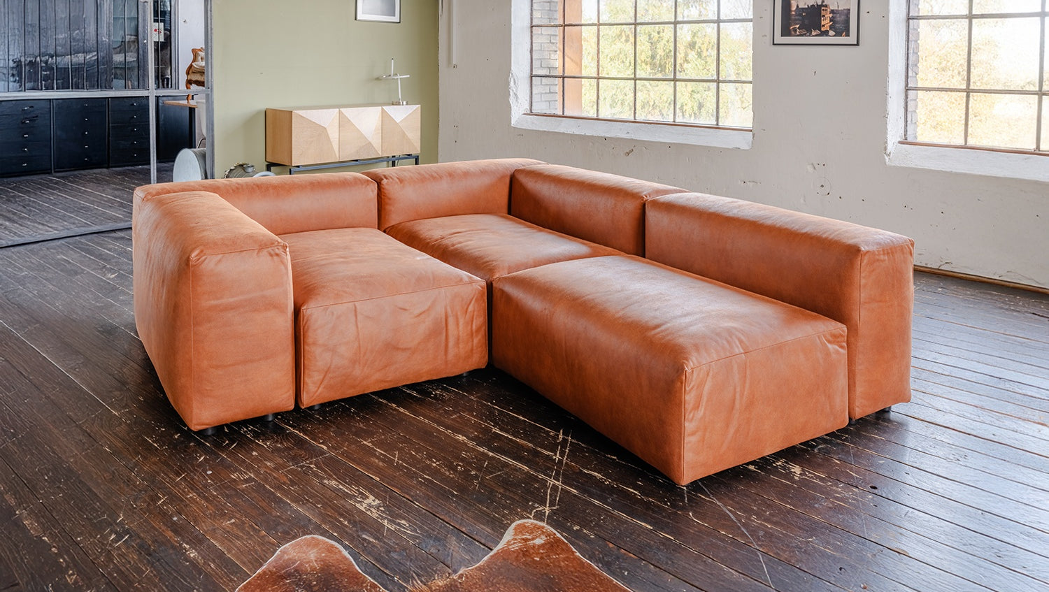 KAWOLA Sofá MIA Sofá modular 8 piezas piel fibra tejido coñac