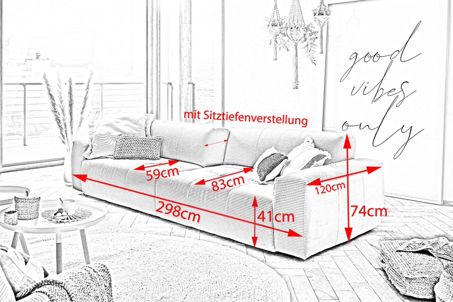 Se trata de 2a oportunidad que ofrecemos a un precio reducido. Los defectos específicos de este artículo se documentan detalladamente en las imágenes del producto que aparecen justo después de la imagen principal y también se describen en los "Detalles del producto" (véase más abajo). El sofá PALACE impresiona por su elegancia atemporal, su diseño moderno y su confort especialmente elevado. La elegante funda de terciopelo cubre la acogedora superficie reclinable, cuyo desenfadado tapizado invita a relajarse y descansar. El extra especial: el sofá PALACE puede transformarse de un Sofá extra ancho en un asiento clásico en un abrir y cerrar de ojos. Gracias a la regulación de la profundidad del asiento, que se consigue ajustando el respaldo, la profundidad del asiento puede reducirse de 83 cm a 59 cm. Esto le permite decidir si prefiere una posición sentada más erguida o si prefiere tener espacio para estirarse. Nota: Cuando son nuevas, las fundas muestran un pronunciado patrón ondulado, que es intencionado debido al diseño, el modelo y la construcción. La tapicería se adaptará a la forma del cuerpo y la firmeza del asiento disminuirá ligeramente. Las ligeras diferencias en la firmeza del asiento de los grupos complementarios se deben al diseño y, por tanto, no son motivo de queja.