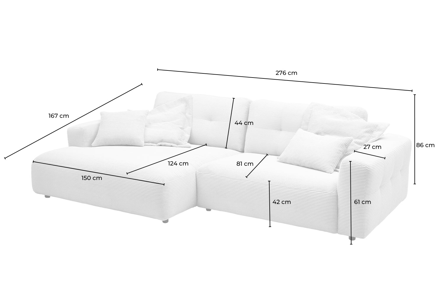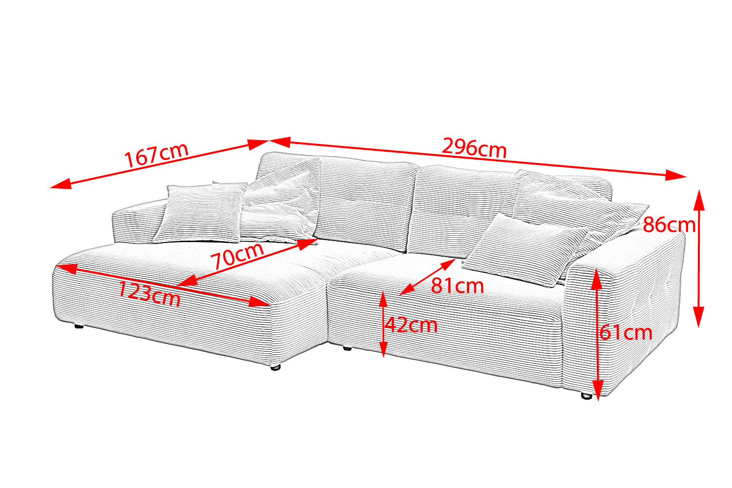 El sofá esquinero MIKA de KAWOLA combina un diseño moderno con un acabado de alta calidad y se convertirá en el centro de atención de su salón. Con su tapizado integral en la moderna tela Pana, el sofá resulta atractivo desde todos los ángulos y se puede colocar de forma flexible en la habitación. La característica más destacada es la comodidad de asiento de firmeza media, que ofrece un agradable equilibrio entre apoyo y comodidad. Con unas dimensiones de 296 cm de ancho y 167 cm de fondo, el sofá ofrece espacio suficiente para pasar horas de relax, mientras que la suspensión de muelles ondulados del asiento y el duradero tapizado de espuma fría proporcionan comodidad y apoyo adicionales. Los deslizadores de plástico de las patas facilitan el desplazamiento y la colocación sobre diferentes revestimientos de suelo. El sofá rinconero MIKA de KAWOLA no sólo es elegante y cómodo, sino también muy acogedor, para pasar horas agradables en su salón. Regálese lo mejor y apueste por la calidad y el estilo: elija MIKA.