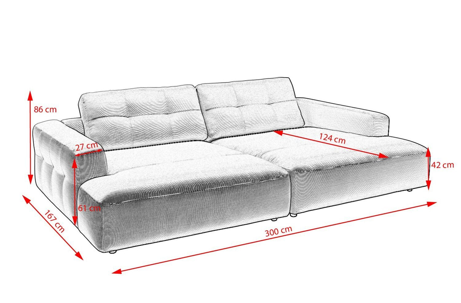 El Sofá extra ancho MIKA de KAWOLA combina un diseño moderno con un acabado de alta calidad y se convertirá en el centro de atención de su salón. Con su tapizado integral en la moderna tela Pana, el sofá resulta atractivo desde todos los ángulos y se puede colocar de forma flexible en la habitación. Su característica más destacada es la comodidad del asiento, de firmeza media, que ofrece un agradable equilibrio entre apoyo y comodidad. Con unas dimensiones de 300 cm de ancho y 167 cm de fondo, el sofá ofrece espacio suficiente para pasar horas de relax, mientras que la suspensión de muelles ondulados del asiento y el duradero tapizado de espuma fría proporcionan comodidad y apoyo adicionales. El Sofá extra ancho MIKA de KAWOLA no sólo es elegante y cómodo, sino también muy acogedor, para pasar horas de relax en el salón. Regálese lo mejor y opte por calidad y estilo: elija MIKA.