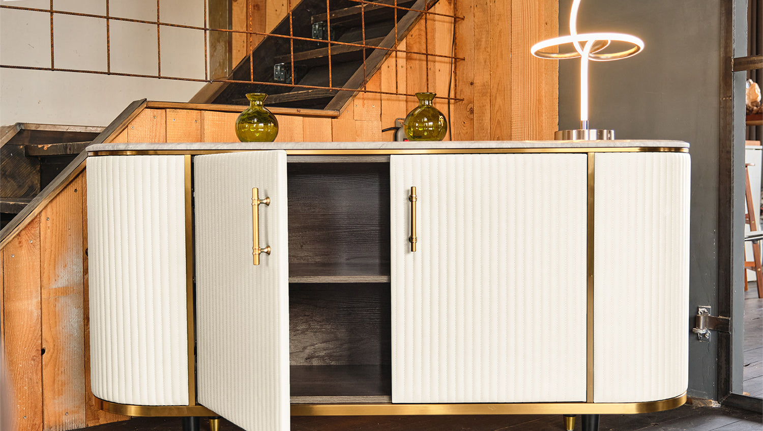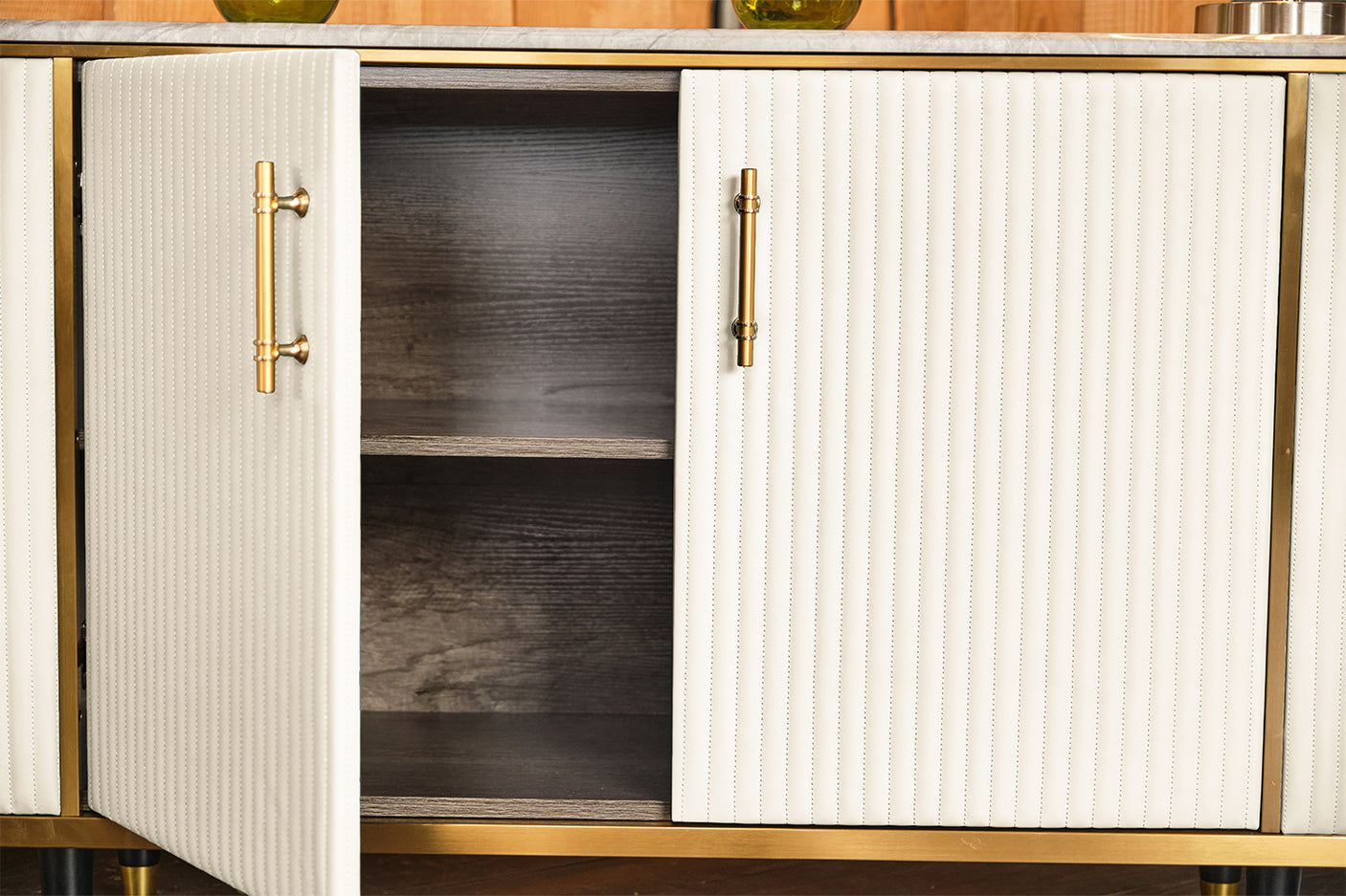 El Aparador KAWOLA MARIA llama la atención en cualquier hogar. Su nostálgico diseño retro al estilo de los años 50 se caracteriza especialmente por la mezcla de materiales. La encimera de mármol gris claro y el elaborado frente de piel sintética crean un acertado contraste. Los pies dorados y los detalles de acero inoxidable completan el conjunto. Otros artículos de la gama MARIA añaden un mueble de buen gusto a su hogar.