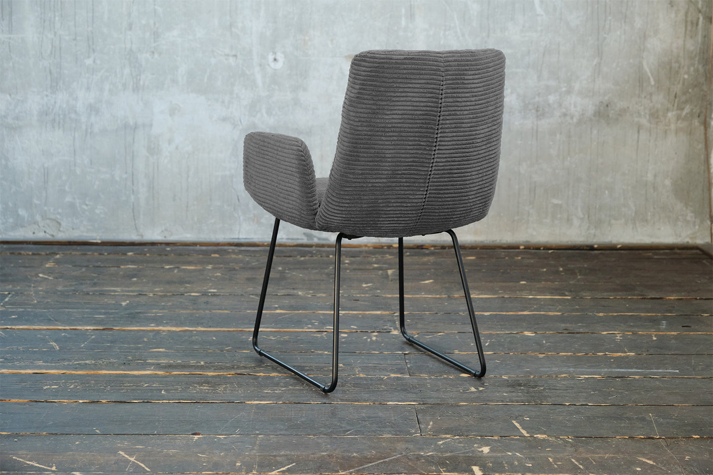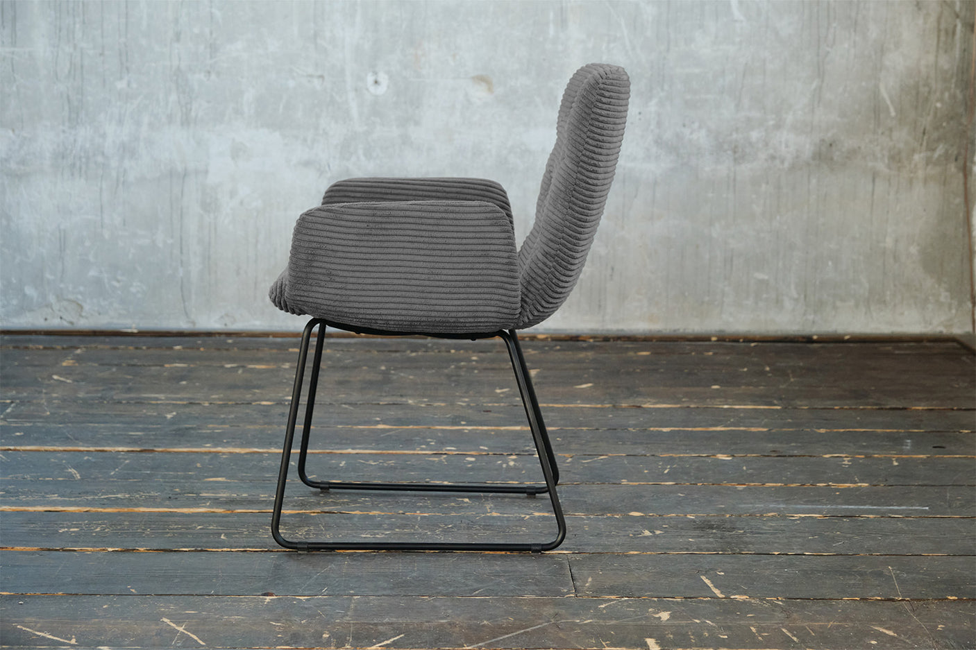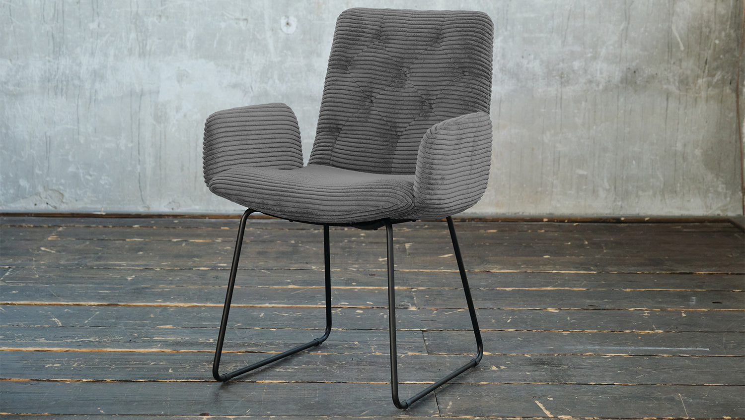 La silla de comedor KAWOLA NEW CHARME no es sólo un mueble, sino un auténtico elemento de diseño que pone un nuevo acento en su hogar. El estilo de la serie NEW CHARME es una reminiscencia de los años sesenta: el respaldo está cosido de forma elaborada sin botones; el respaldo está ligeramente curvado hacia delante en ambos lados y recuerda la forma de una silla de ala; los pies de patín de metal están recubiertos de polvo. La forma inusual de la silla NEW CHARME se complementa con la tapicería en la moderna tela de pana. Si lo que busca no es sólo una silla de comedor, sino una silla atemporal que marque tendencia, la serie NEW CHARME de KAWOLA es la elección perfecta.