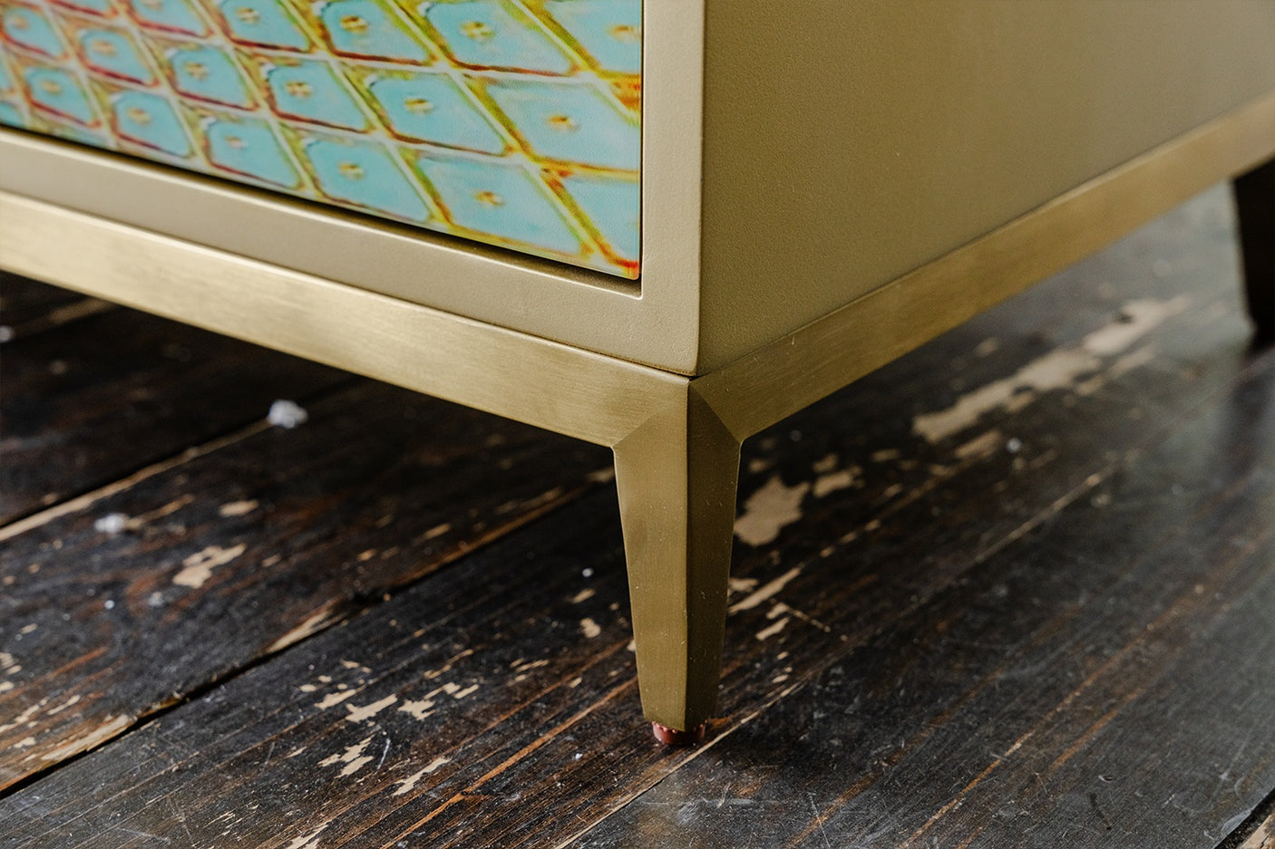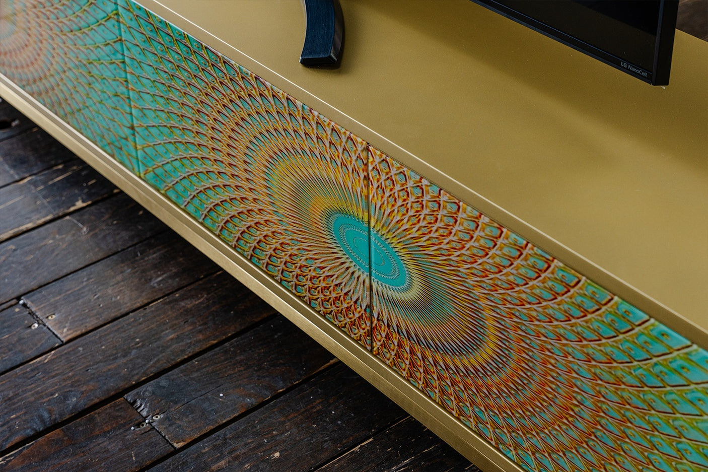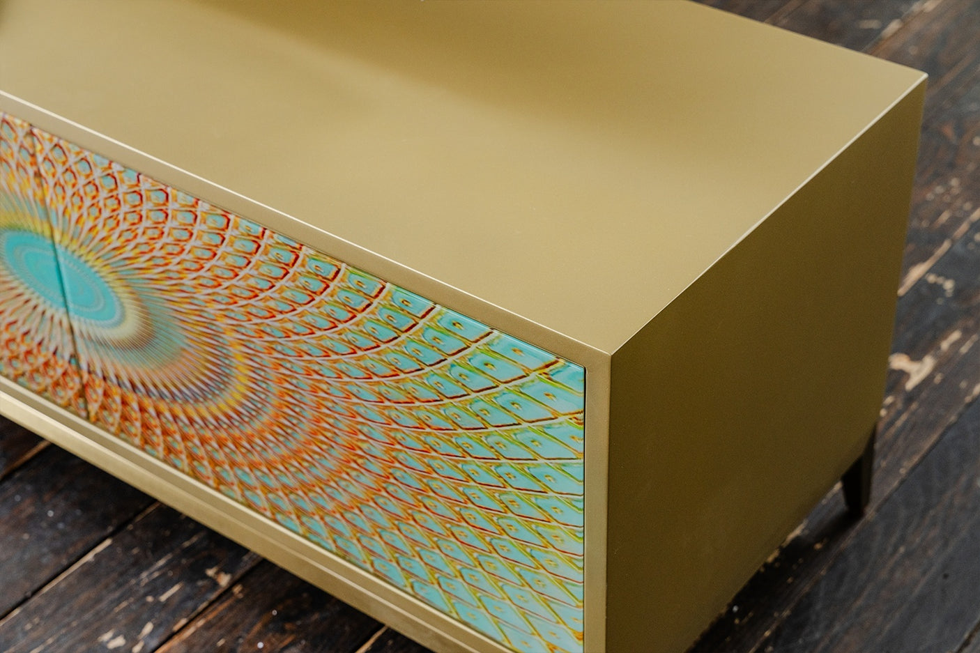 El Mueble bajo LAGO de KAWOLA impresiona por su elegante combinación de diseño inusual y funcionalidad práctica. Con su anchura de 200 cm, es el lugar ideal para su televisor. Las puertas están revestidas de cristal templado y presentan decoraciones doradas en forma de ojo de pavo real. Las cuatro puertas ofrecen un amplio espacio de almacenamiento y pueden abrirse sin esfuerzo gracias al cómodo mecanismo de apertura a presión. Las patas de acero inoxidable cepillado de color dorado aportan un aspecto moderno y atemporal a la vez que estabilidad. El Aparador LAGO de KAWOLA se integra perfectamente en cualquier ambiente y es ideal para los amantes de los muebles originales y elegantes. Descubra la combinación perfecta de diseño y funcionalidad con el Mueble bajo LAGO.
