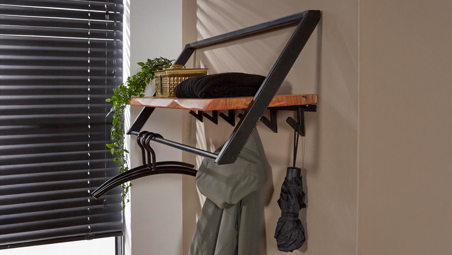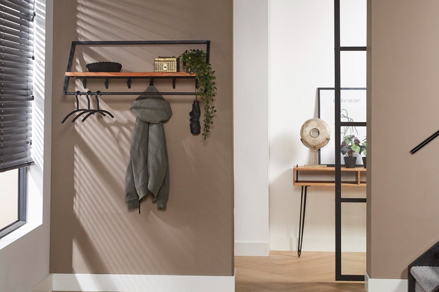 El perchero de pared ALEGRA de KAWOLA impresiona por su diseño de alta calidad y su sofisticada funcionalidad. El perchero de madera maciza de acacia impresiona por su veteado natural y su elegante acabado en negro, que le confiere un aspecto único. Debajo del estante hay 6 robustos ganchos y una barra de metal para colgar perchas, ambos de metal con recubrimiento en polvo para una calidad duradera. El Guardarropa de 100 cm de ancho, 38 cm de alto y 32 cm de profundidad se puede montar de forma segura utilizando dos ojales. Ideal para pasillos, vestíbulos o zonas de entrada, ALEGRA ofrece una solución elegante para una mayor organización.