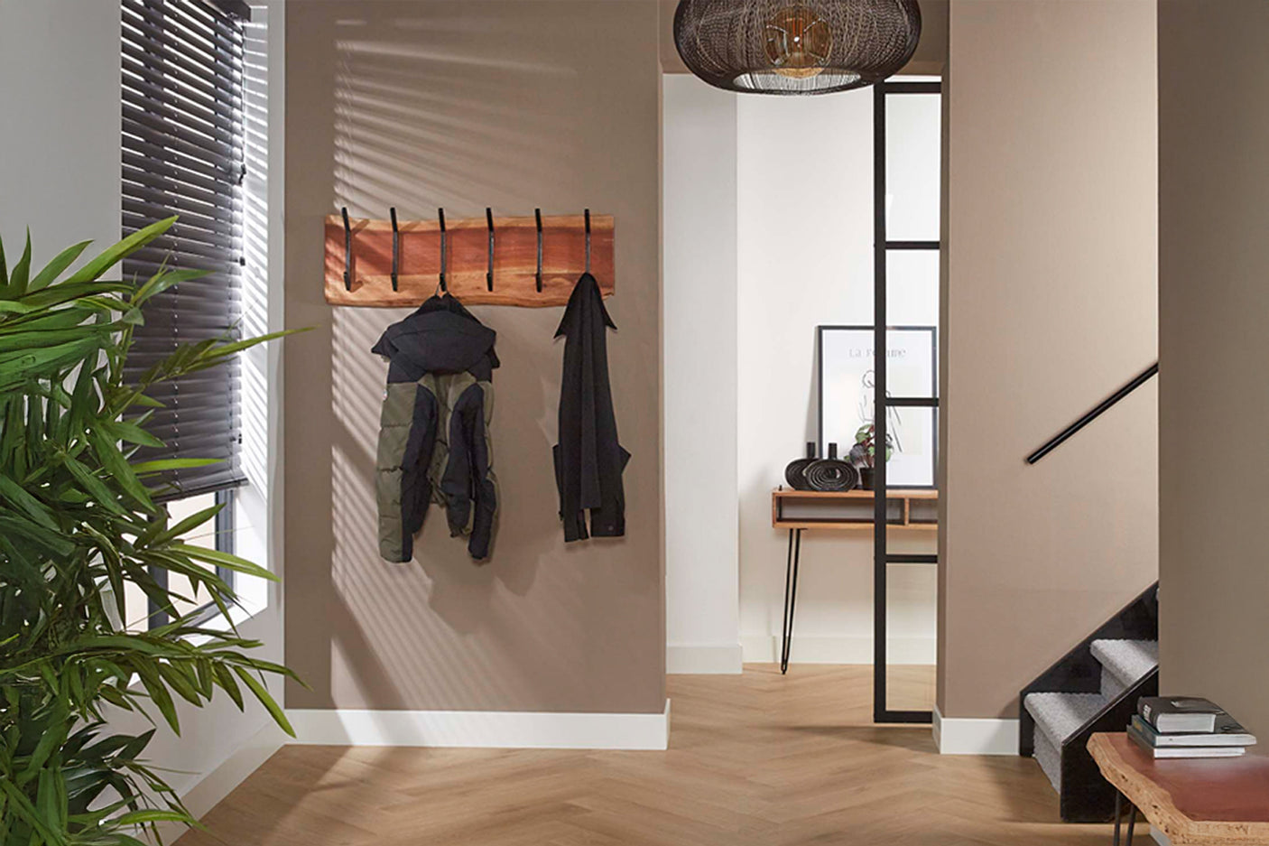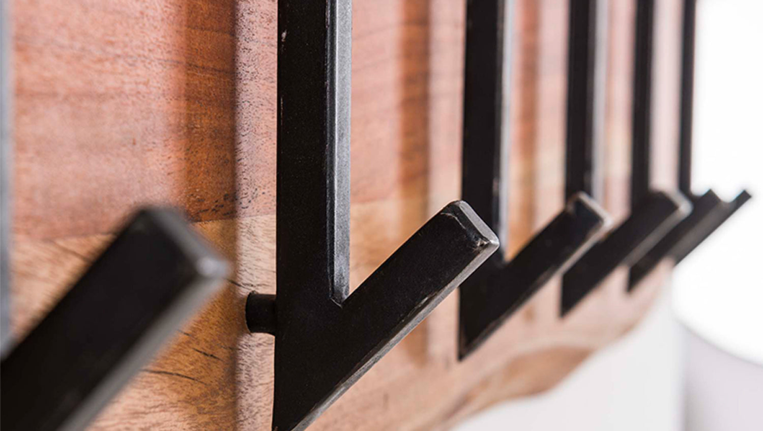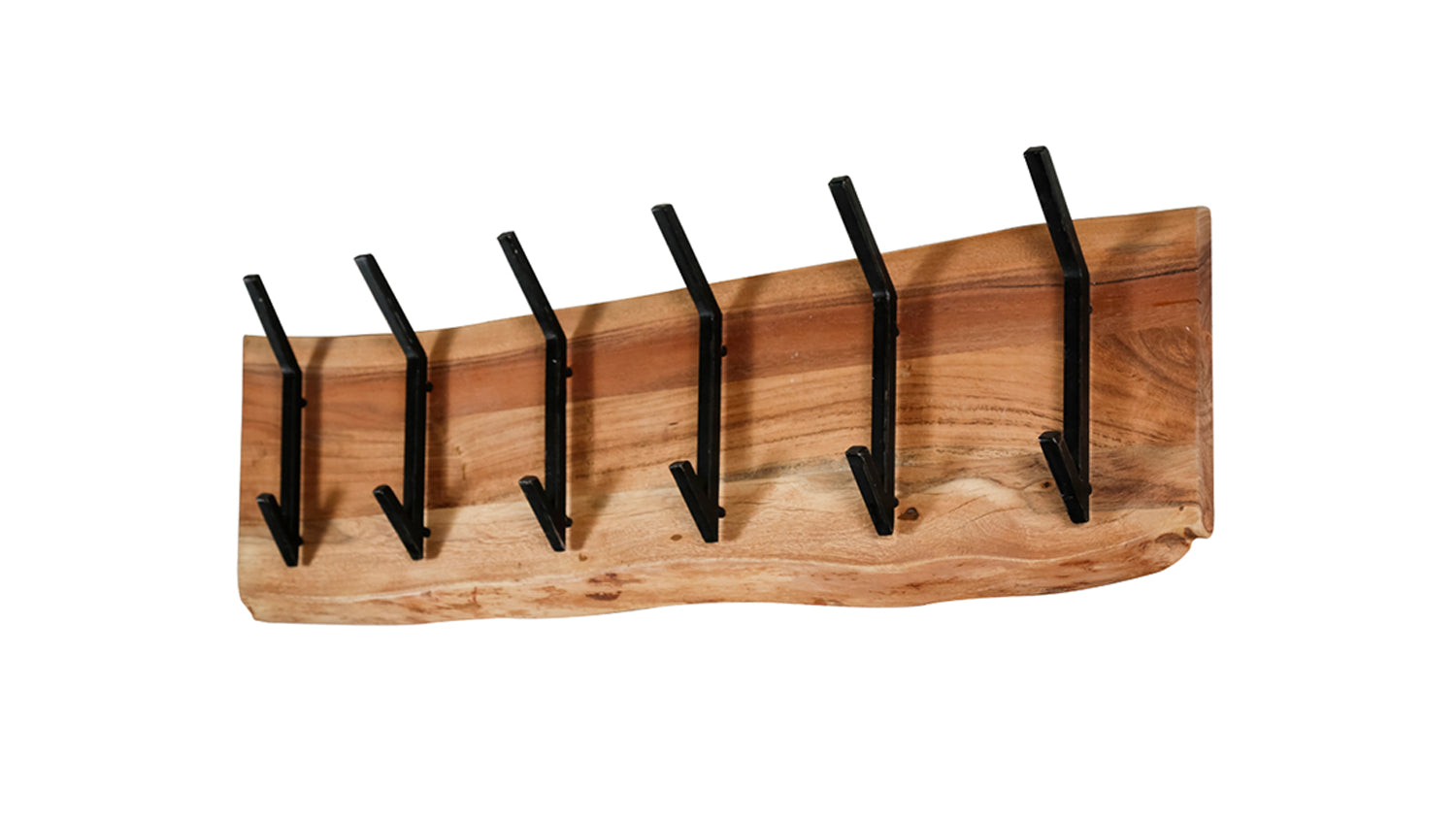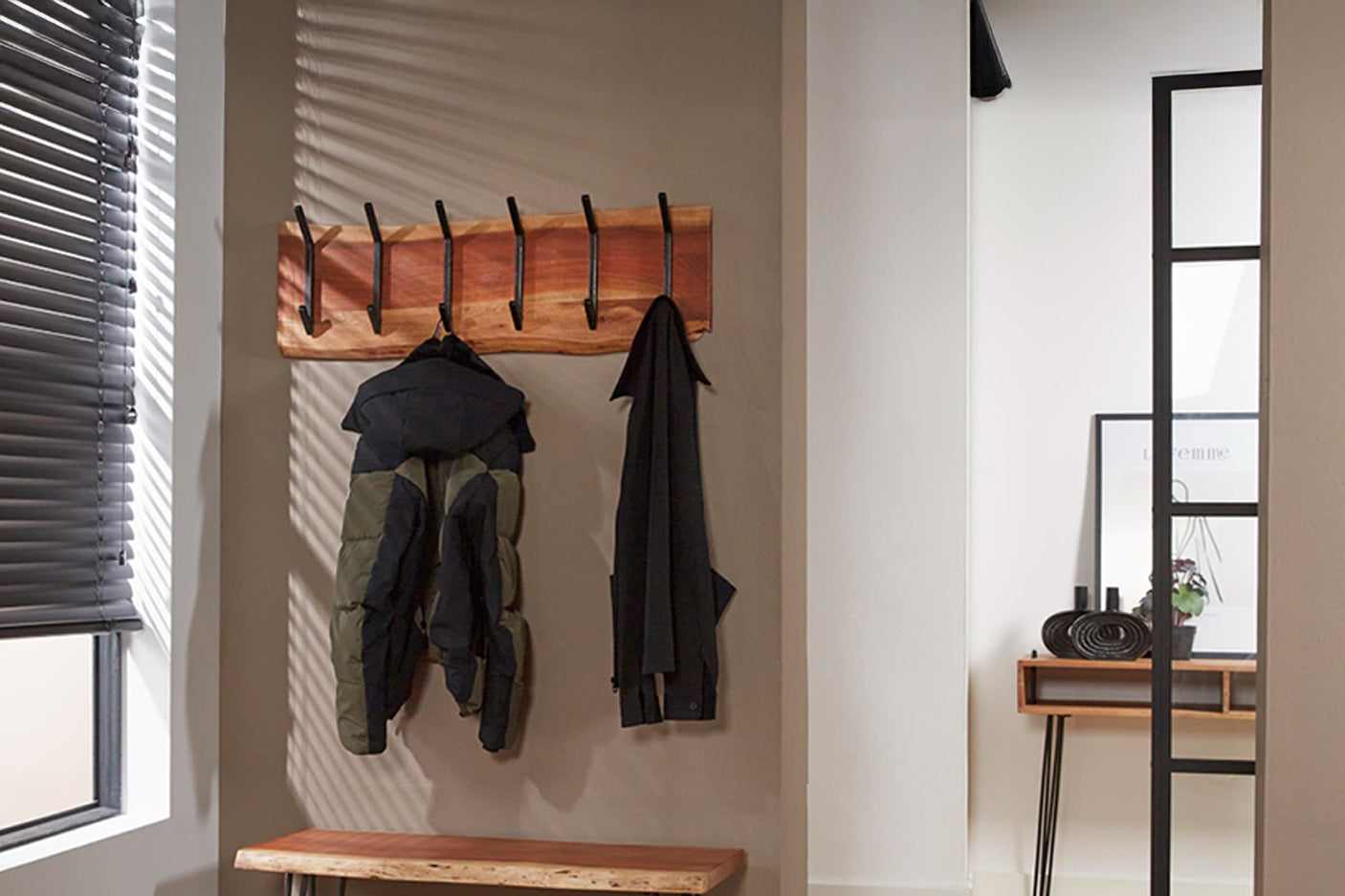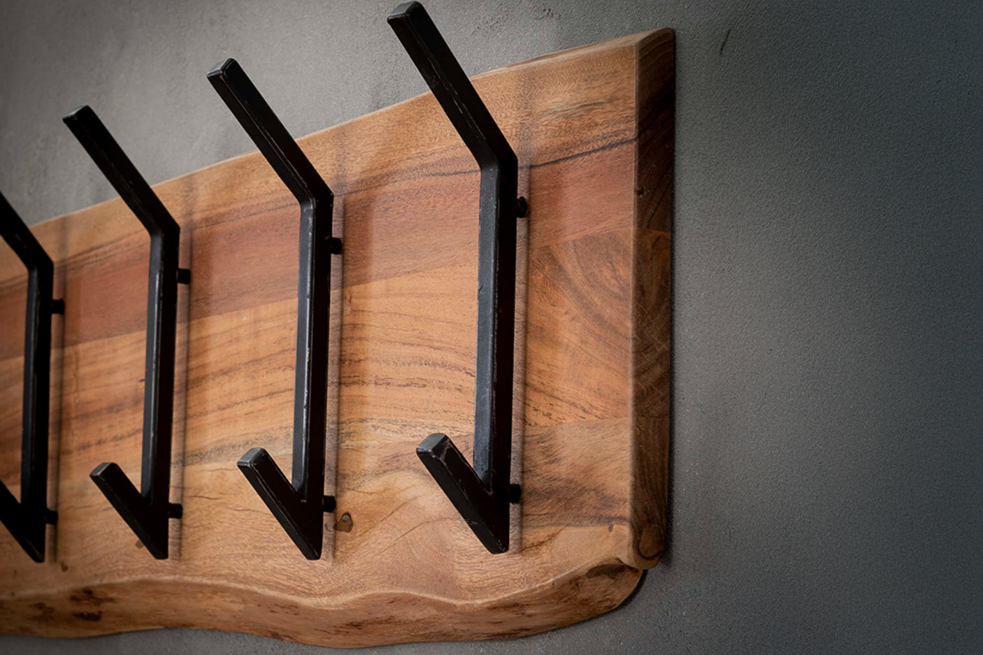El perchero de pared NEREA de KAWOLA impresiona por su diseño único y natural. Fabricado en madera maciza de acacia, impresiona por sus finas vetas y llamativos nudos, que le confieren un encanto especial. La madera se procesa siguiendo métodos tradicionales, lo que confiere al Guardarropa un aspecto natural y único. 12 robustos ganchos de metal pulido negro ofrecen espacio para chaquetas, bolsos y accesorios. Gracias a los dos ojales de la parte trasera, el Guardarropa de 100 cm de ancho, 30 cm de alto y 12 cm de profundidad puede montarse fácilmente en la pared. Elegante, compacto y funcional: ¡NEREA es la elección perfecta para el recibidor, el pasillo o el dormitorio!
