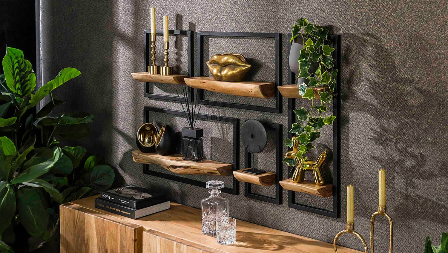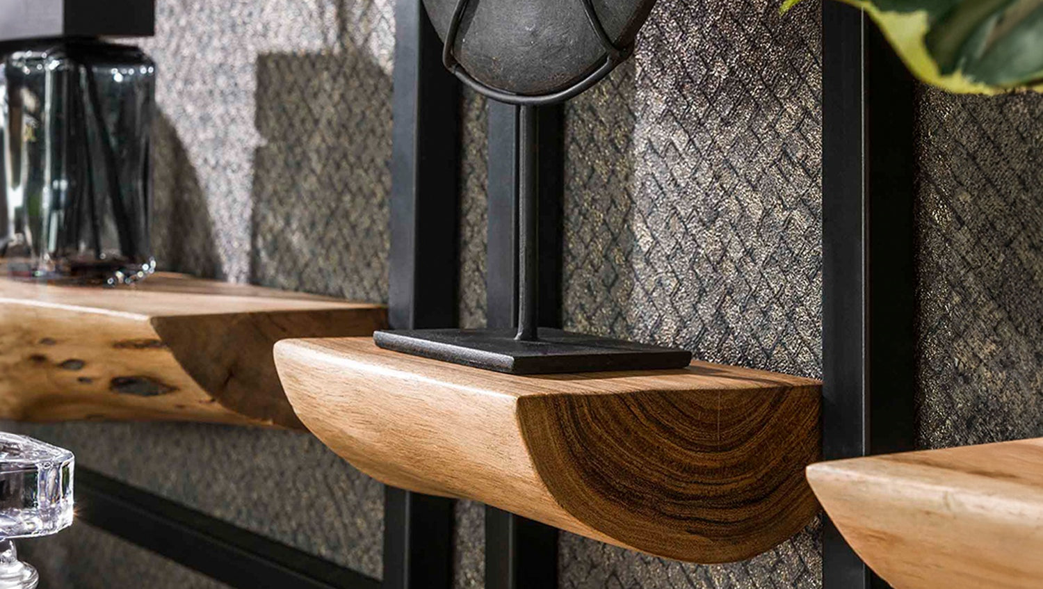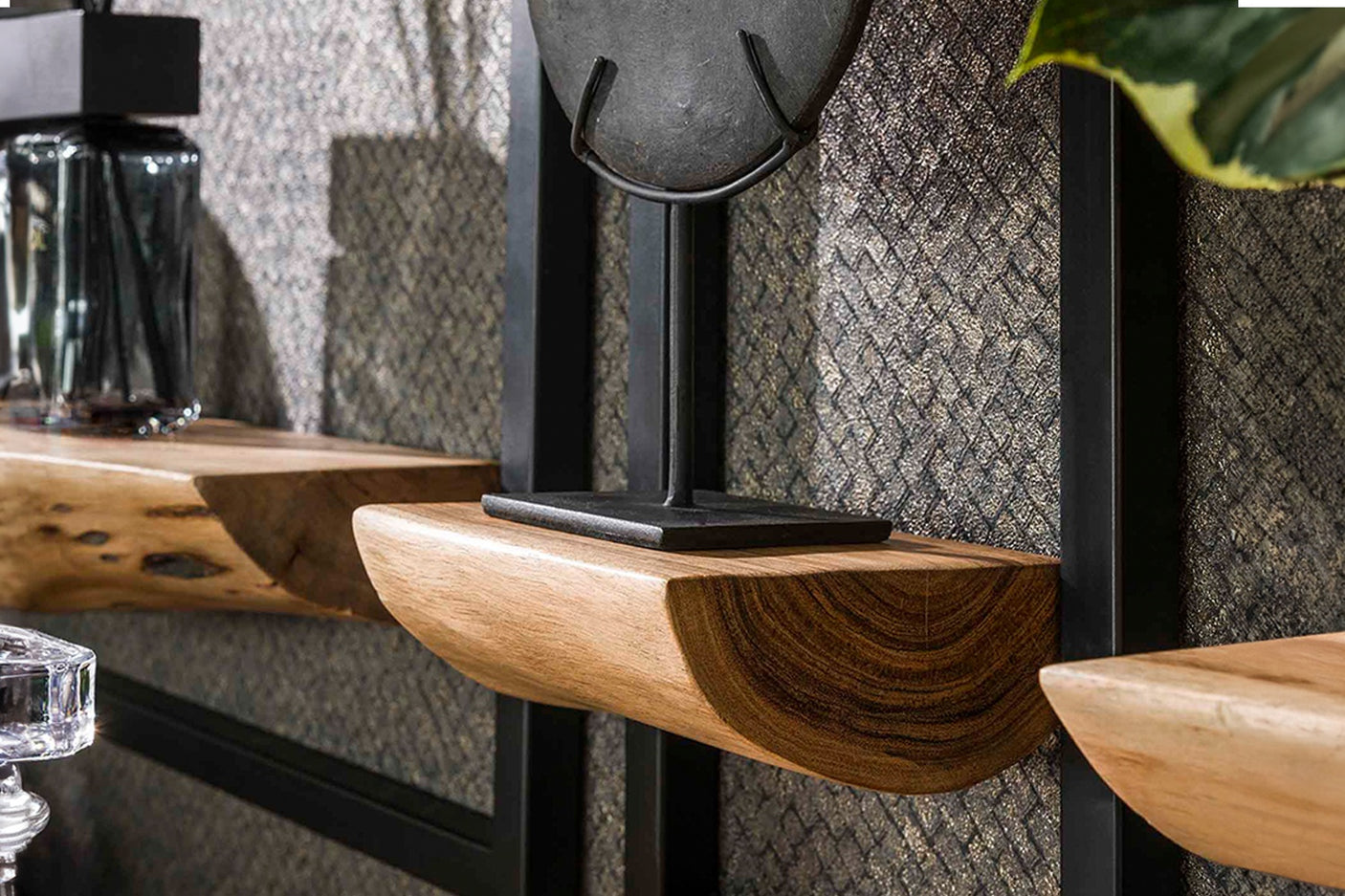 El juego de estanterías de pared KAWOLA ERGEA es un elegante conjunto de 5 piezas que aporta un toque único a cualquier habitación. Consta de cinco estantes de madera maciza de acacia, que se combinan con una robusta estructura de metal con recubrimiento en polvo. Los tablones se caracterizan por su robusta forma de tronco de árbol lijado, que proporciona un aspecto natural y auténtico. Cada balda está equipada con dos ojales de fijación, lo que facilita y flexibiliza su montaje en la pared.