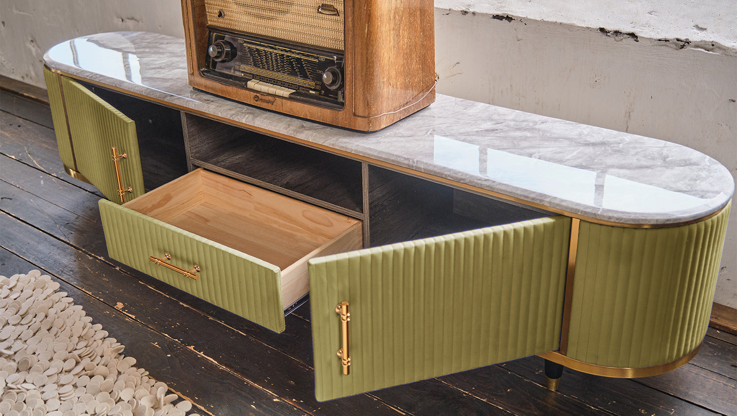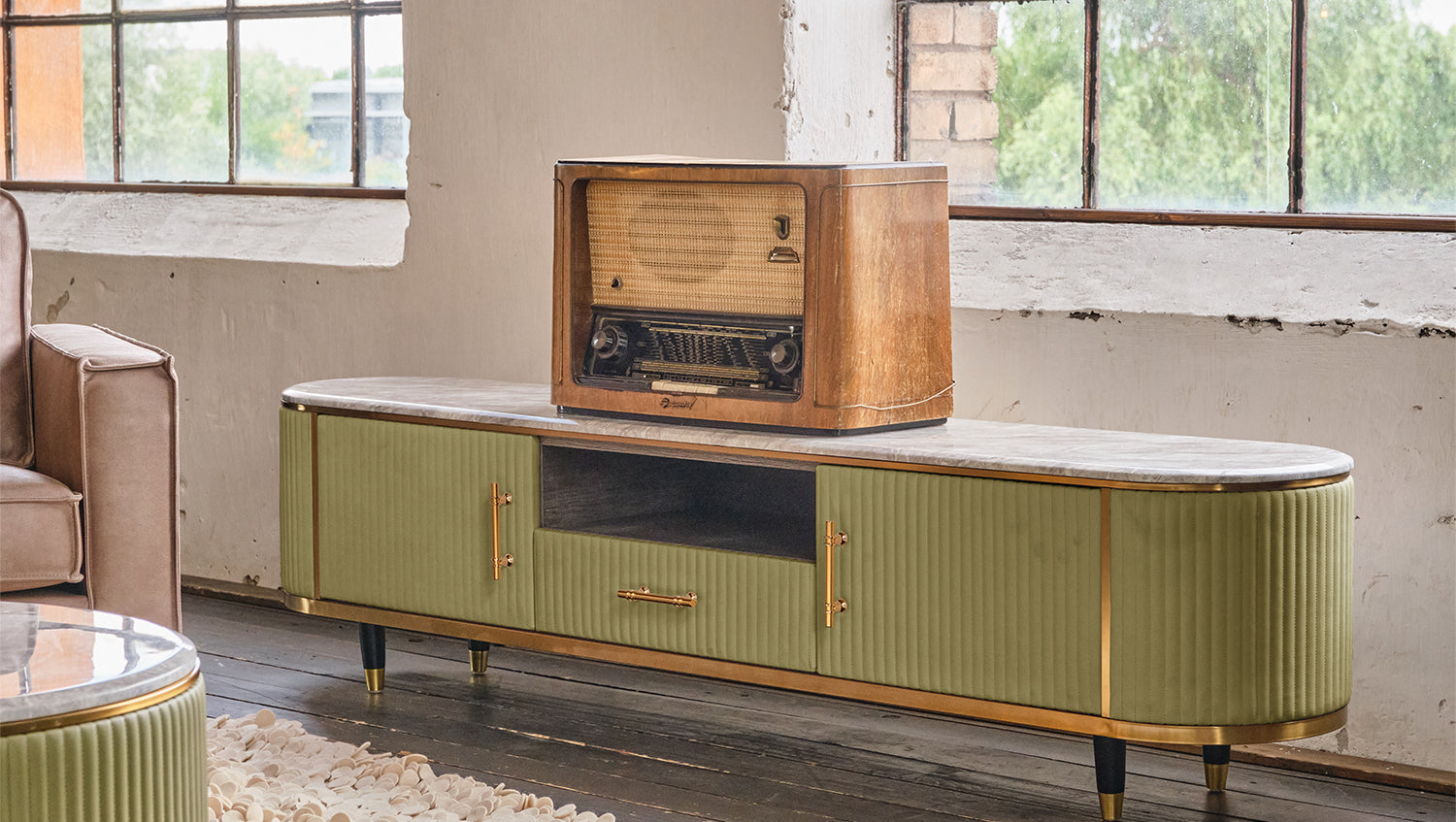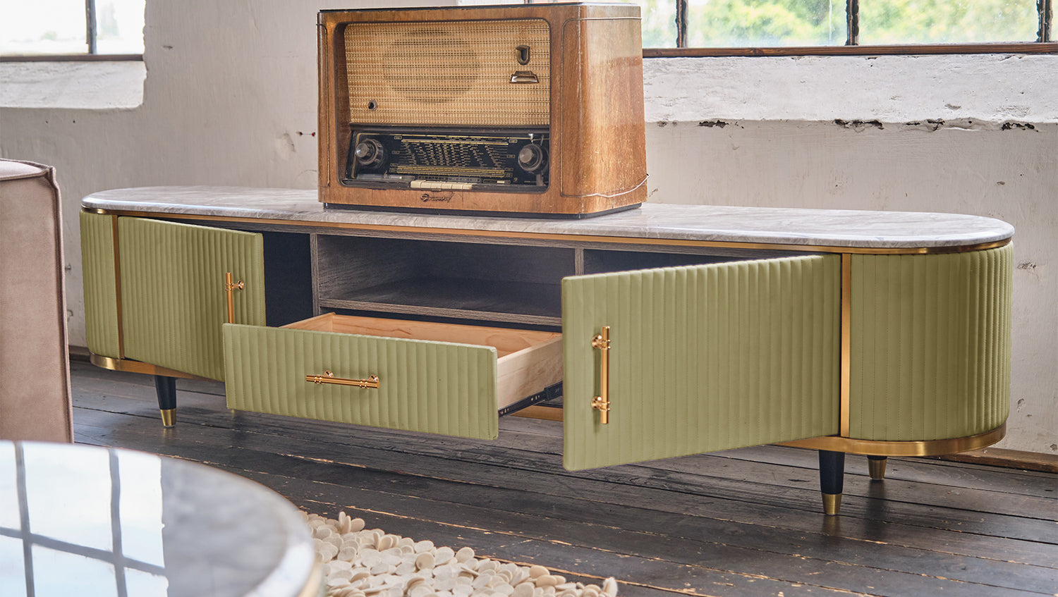 Das KAWOLA Lowboard MARIA ist ein Eyecatcher in jedem Zuhause. Sein nostalgisches Retro-Design im 50er-Jahre-Stil zeichnet sich besonders durch den Materialmix aus. Die Platte aus hellgrauem Marmor und die aufwendig verarbeitete Front aus Kunstleder bilden einen gelungenen Kontrast. Die goldfarbenen Füße sowie Details aus Edelstahl runden das Gesamtbild ab. Weitere Artikel der Serie MARIA ergänzen die heimischen vier Wände um ein geschmackvolles Möbelstück.