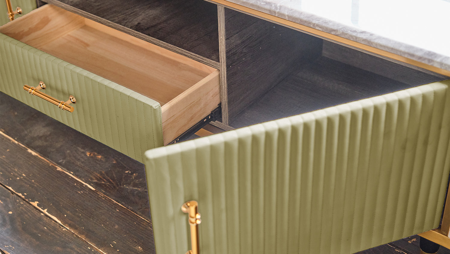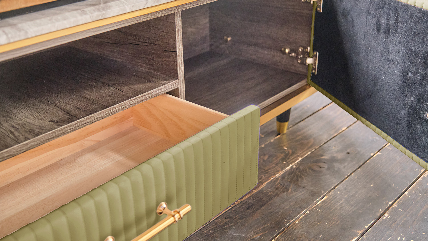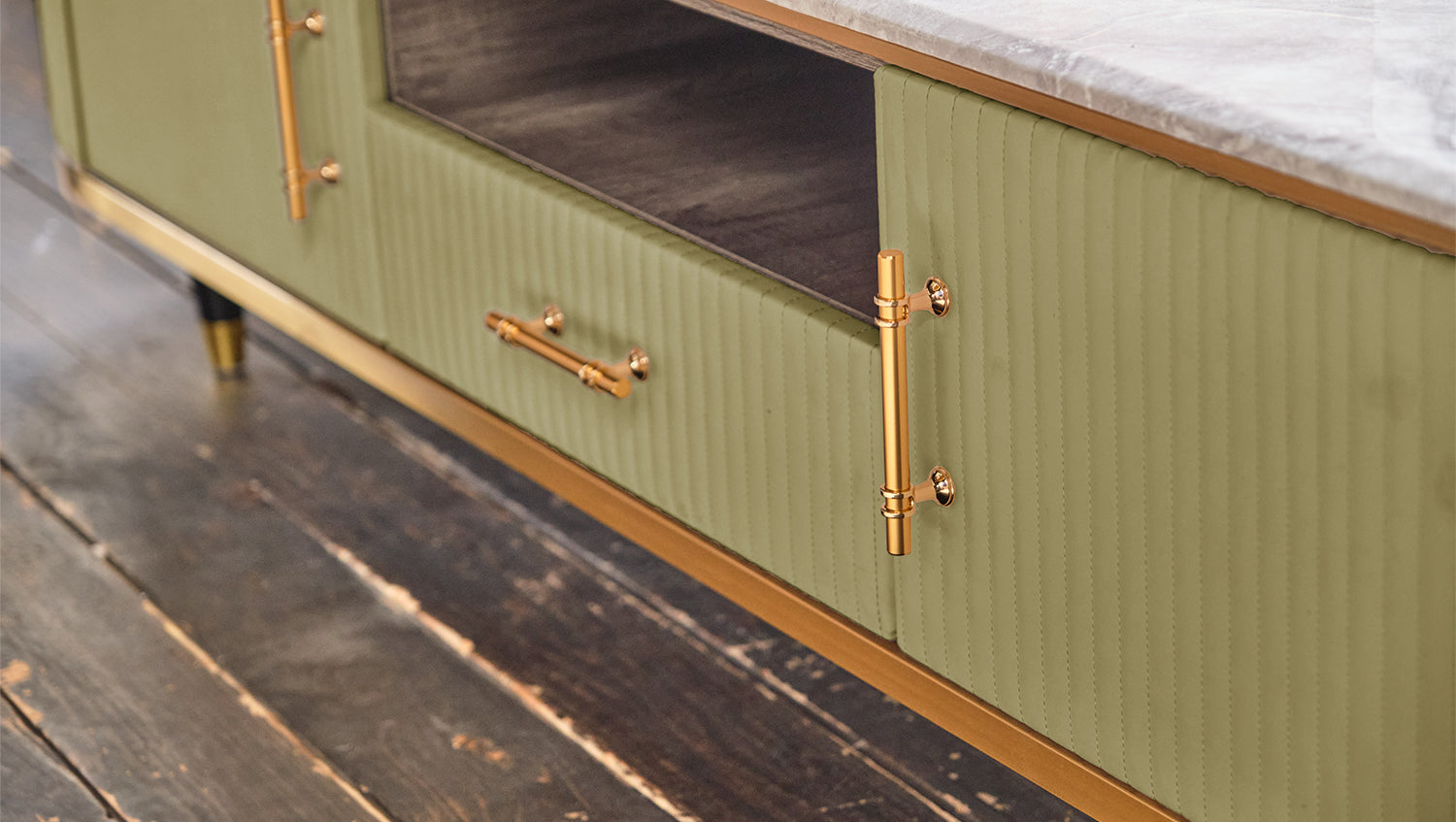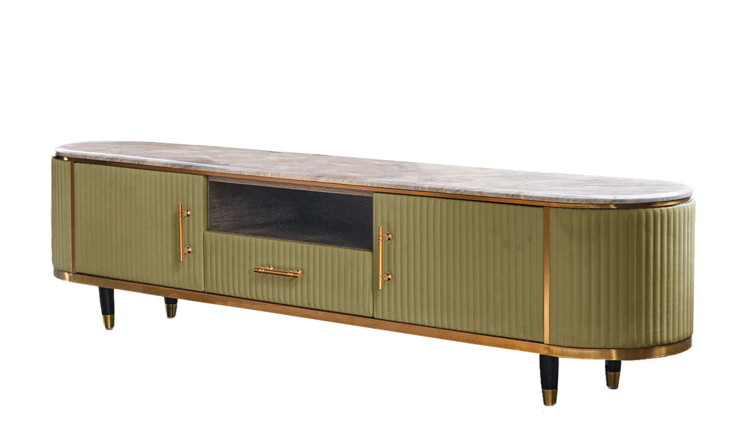 Das KAWOLA Lowboard MARIA ist ein Eyecatcher in jedem Zuhause. Sein nostalgisches Retro-Design im 50er-Jahre-Stil zeichnet sich besonders durch den Materialmix aus. Die Platte aus hellgrauem Marmor und die aufwendig verarbeitete Front aus Kunstleder bilden einen gelungenen Kontrast. Die goldfarbenen Füße sowie Details aus Edelstahl runden das Gesamtbild ab. Weitere Artikel der Serie MARIA ergänzen die heimischen vier Wände um ein geschmackvolles Möbelstück.