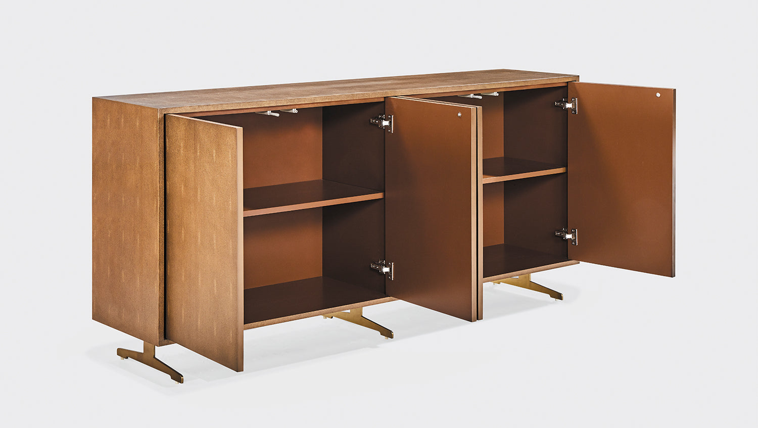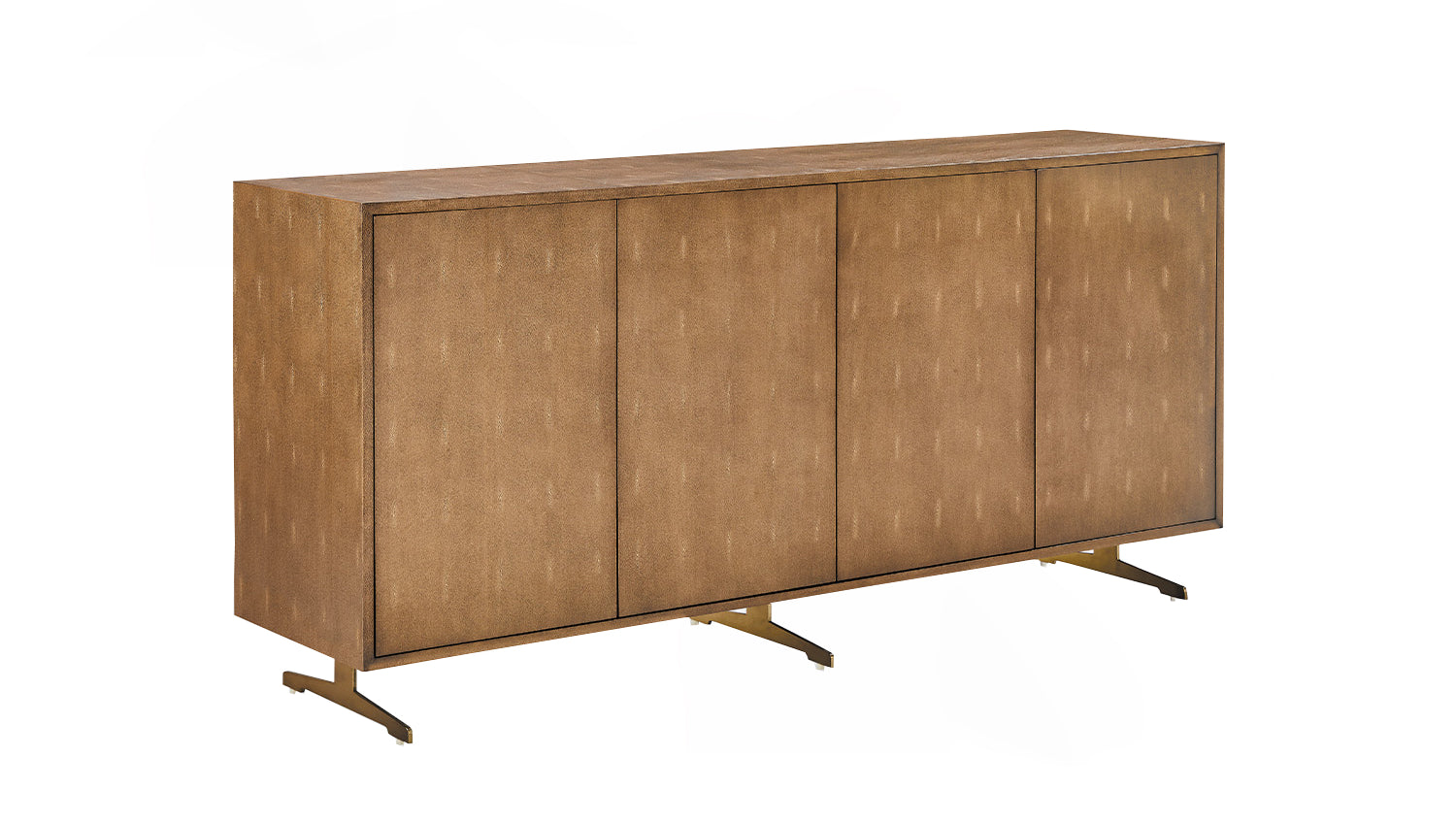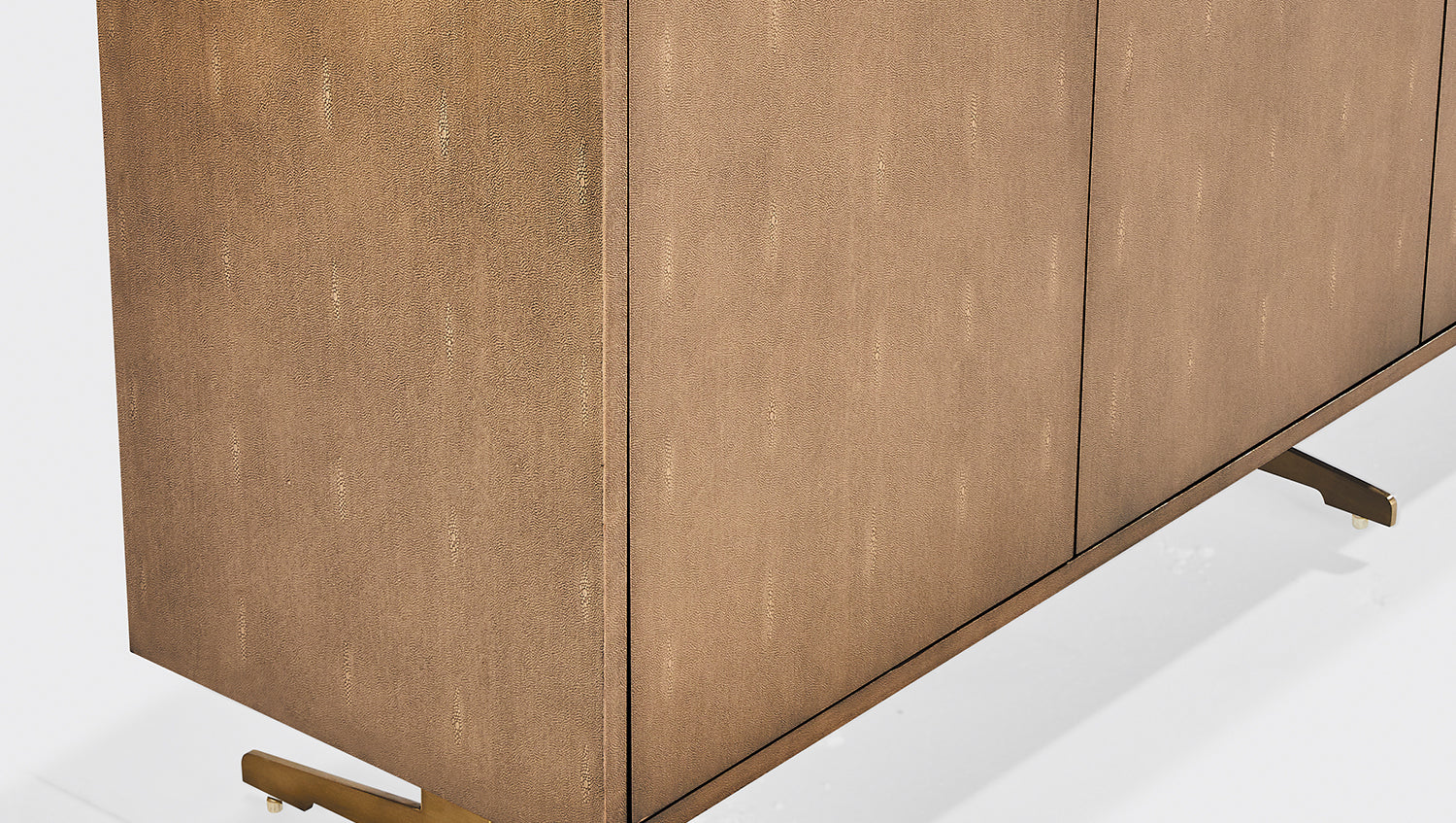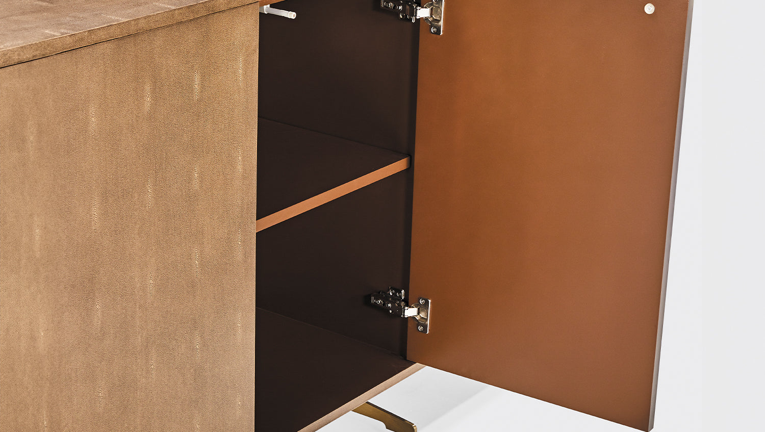 Das KAWOLA Sideboard GALA besticht durch seine elegante Kombination aus modernem Design und praktischer Funktionalität. Der Korpus und die Türen sind stilvoll mit hochwertigem goldfarbenen Kunstleder bezogen, das dem Möbelstück eine luxuriöse Optik verleiht. Die vier Türen bieten großzügigen Stauraum und lassen sich dank des komfortablen Push-to-Open-Mechanismus mühelos öffnen. Die goldfarbenen Kufenfüße aus gebürstetem Edelstahl sorgen für einen modernen, zeitlosen Look und bieten gleichzeitig stabile Standfestigkeit. Variabel einsetzbare Einlegeböden ermöglichen eine flexible Nutzung des Innenraums und passen sich Ihren Bedürfnissen an. Das Sideboard GALA von KAWOLA fügt sich perfekt in jedes Wohnambiente ein und ist ideal für Liebhaber von schlichten, aber dennoch eleganten Möbelstücken. Entdecken Sie die perfekte Kombination aus Design und Funktionalität mit dem Sideboard GALA!