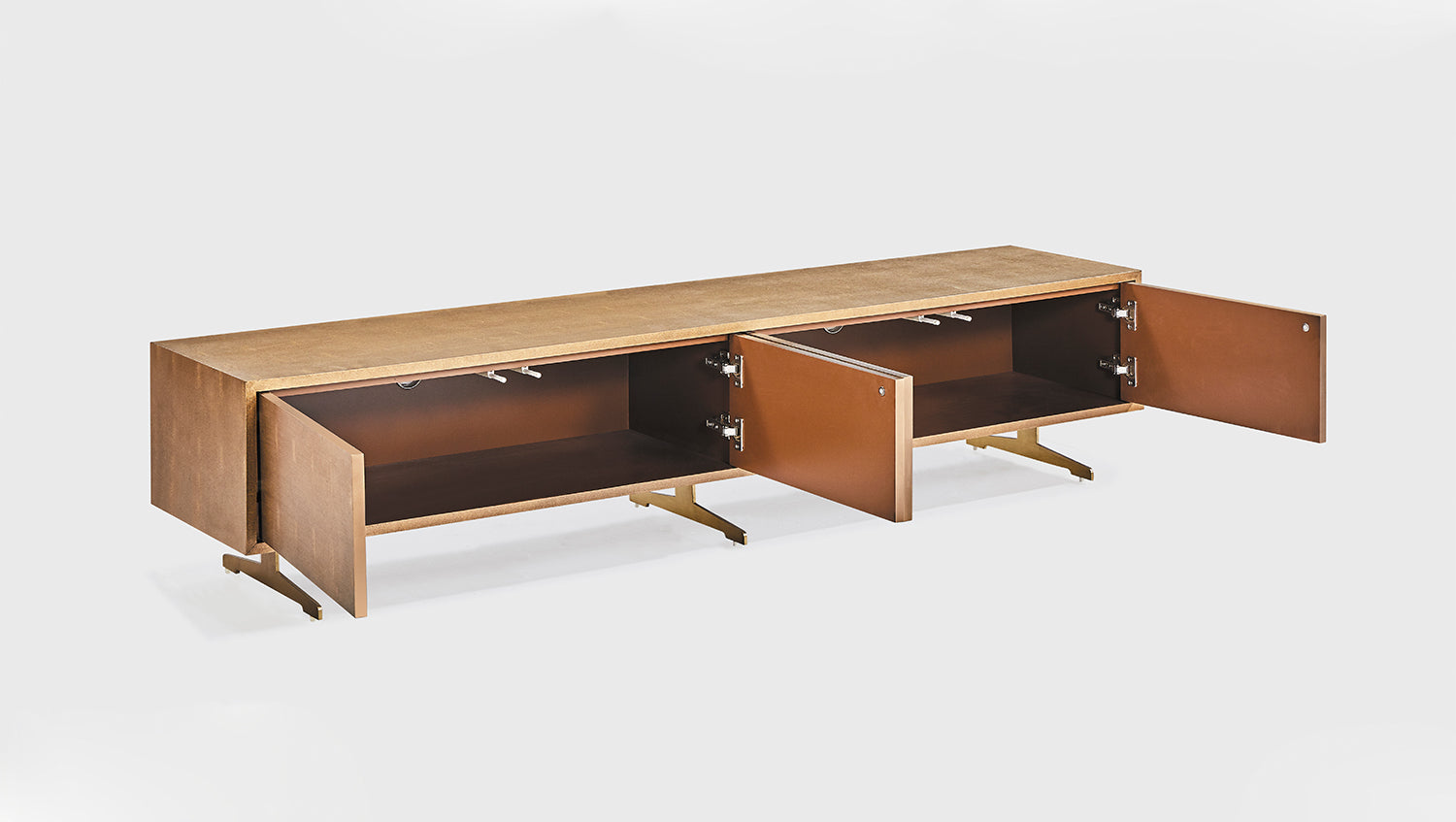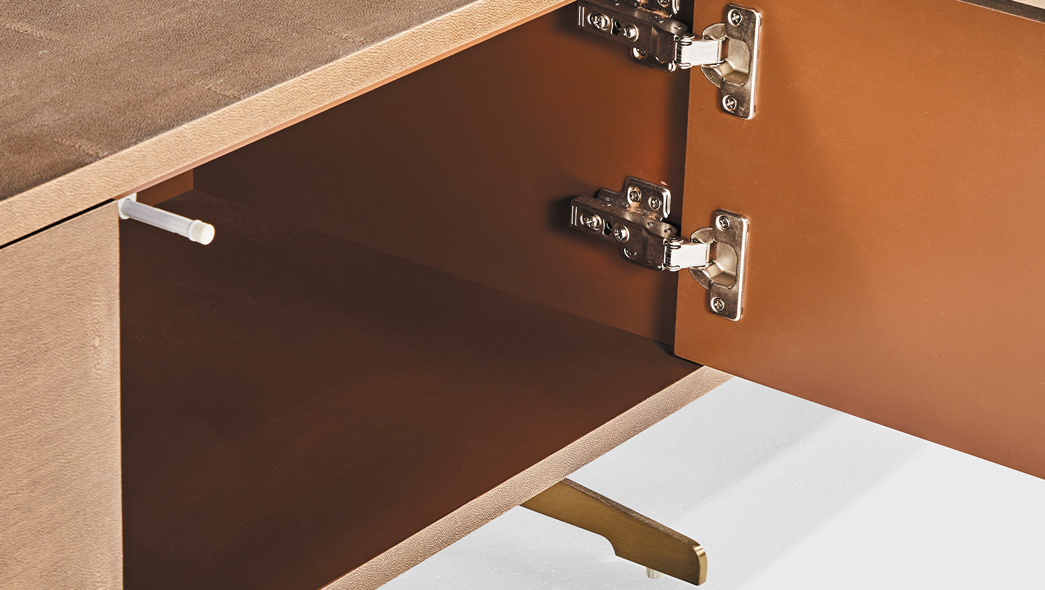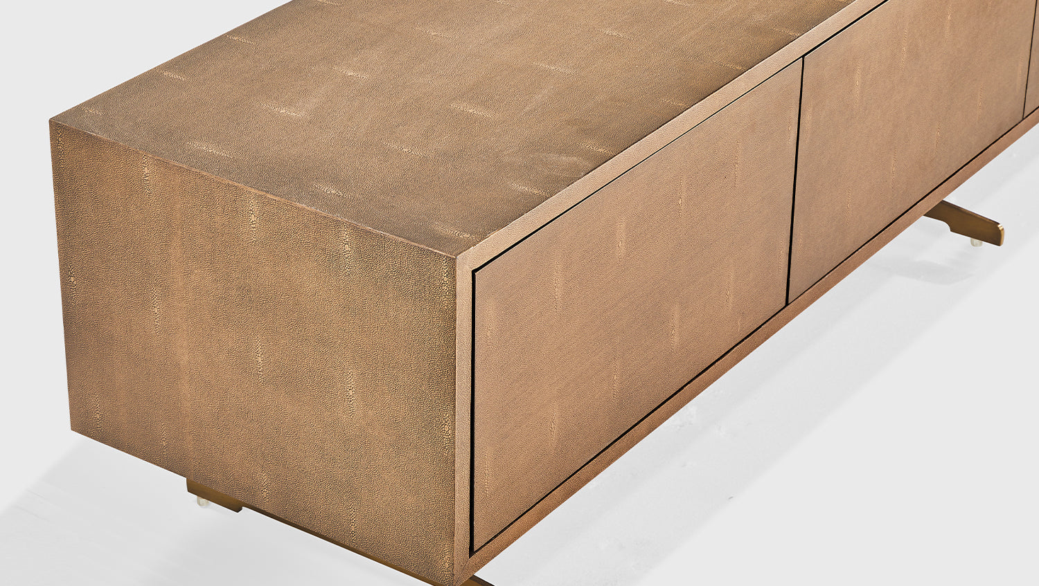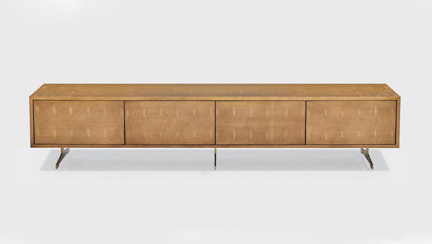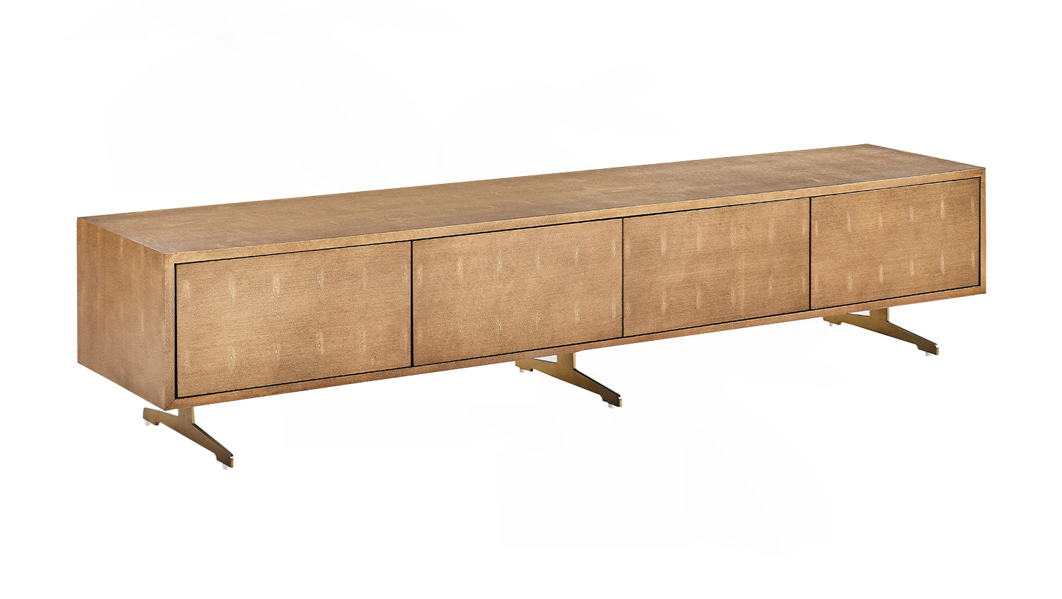 Das KAWOLA Lowboard GALA besticht durch seine elegante Kombination aus modernem Design und praktischer Funktionalität. Mit seiner Breite von 200 cm ist es der ideale Platz für Ihren Fernseher. Der Korpus und die Türen sind stilvoll mit hochwertigem goldfarbenen Kunstleder bezogen, das dem Möbelstück eine luxuriöse Optik verleiht. Die vier Türen bieten großzügigen Stauraum und lassen sich dank des komfortablen Push-to-Open-Mechanismus mühelos öffnen. Die goldfarbenen Kufenfüße aus gebürstetem Edelstahl sorgen für einen modernen, zeitlosen Look und bieten gleichzeitig stabile Standfestigkeit. Das TV-Board GALA von KAWOLA fügt sich perfekt in jedes Wohnambiente ein und ist ideal für Liebhaber von schlichten, aber dennoch eleganten Möbelstücken. Entdecken Sie die perfekte Kombination aus Design und Funktionalität mit dem Lowboard GALA!
