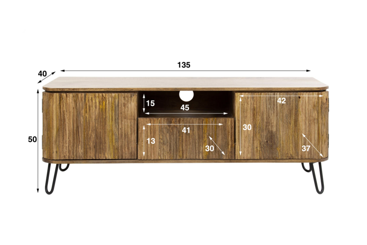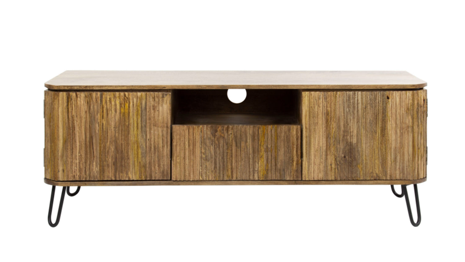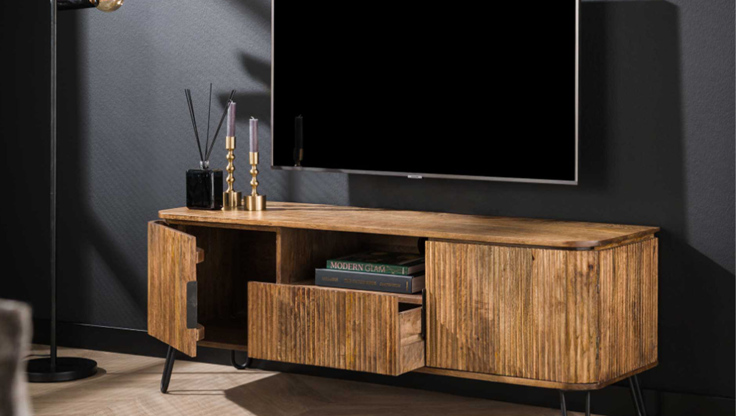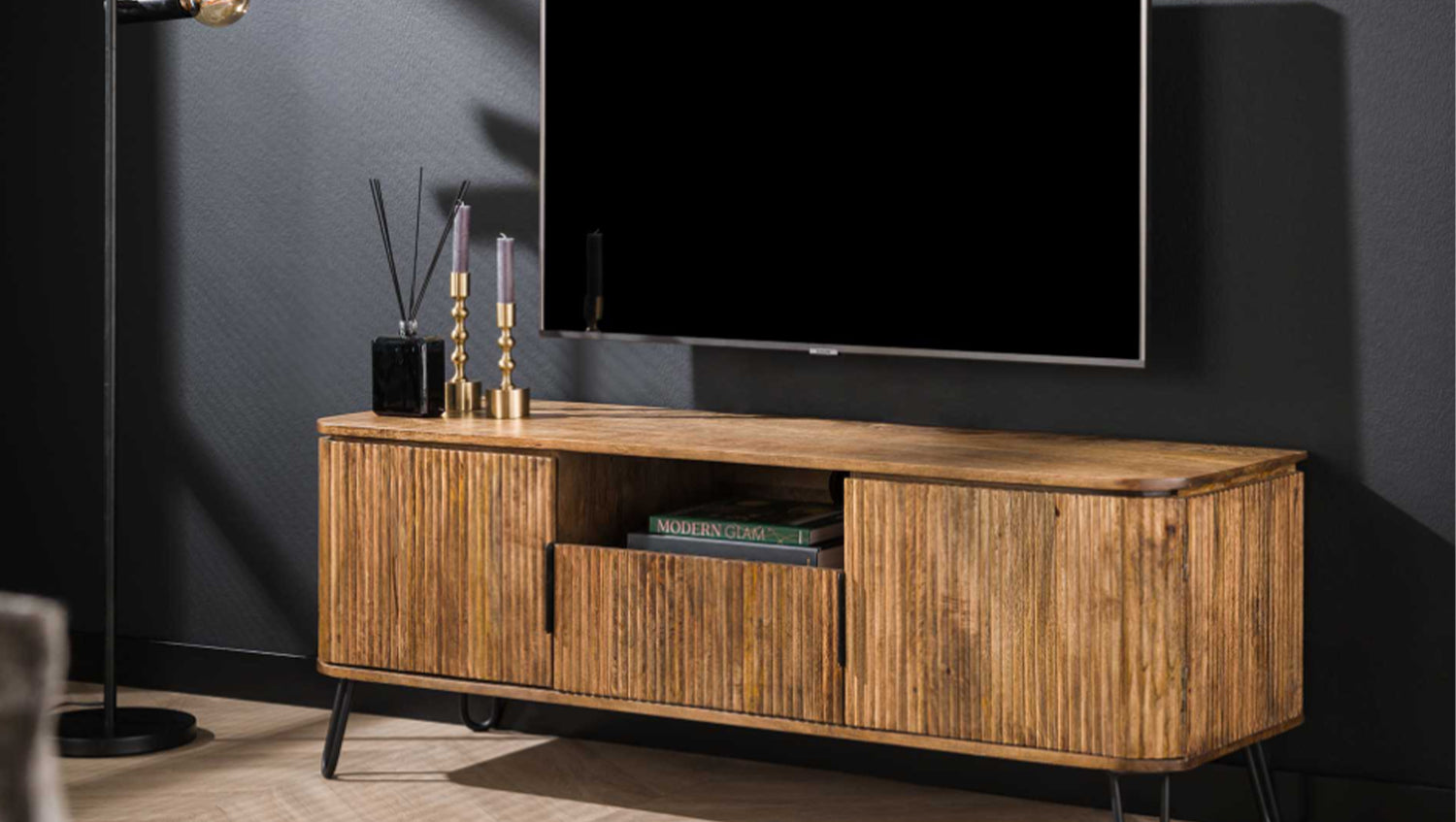 Das KAWOLA Lowboard SALEMA überzeugt mit seinem außergewöhnlichen Wellen-Design und natürlicher Eleganz. Gefertigt aus robustem Mangoholz, verleiht es jedem Wohnraum eine warme und stilvolle Atmosphäre. Mit einer Breite von 135 cm ist es perfekt für Fernseher und Multimedia-Geräte geeignet. Für ausreichend Stauraum sorgen zwei Türen, eine Schublade und ein offenes Fach, ideal zur Aufbewahrung von Technik, Kabeln und Deko-Elementen. Die hochwertige Verarbeitung garantiert Stabilität und Langlebigkeit. Das SALEMA TV-Board vereint modernes Design mit Funktionalität und passt perfekt in verschiedenste Wohnstile – von minimalistisch bis boho. Ein echter Hingucker für stilbewusste Wohnräume!
