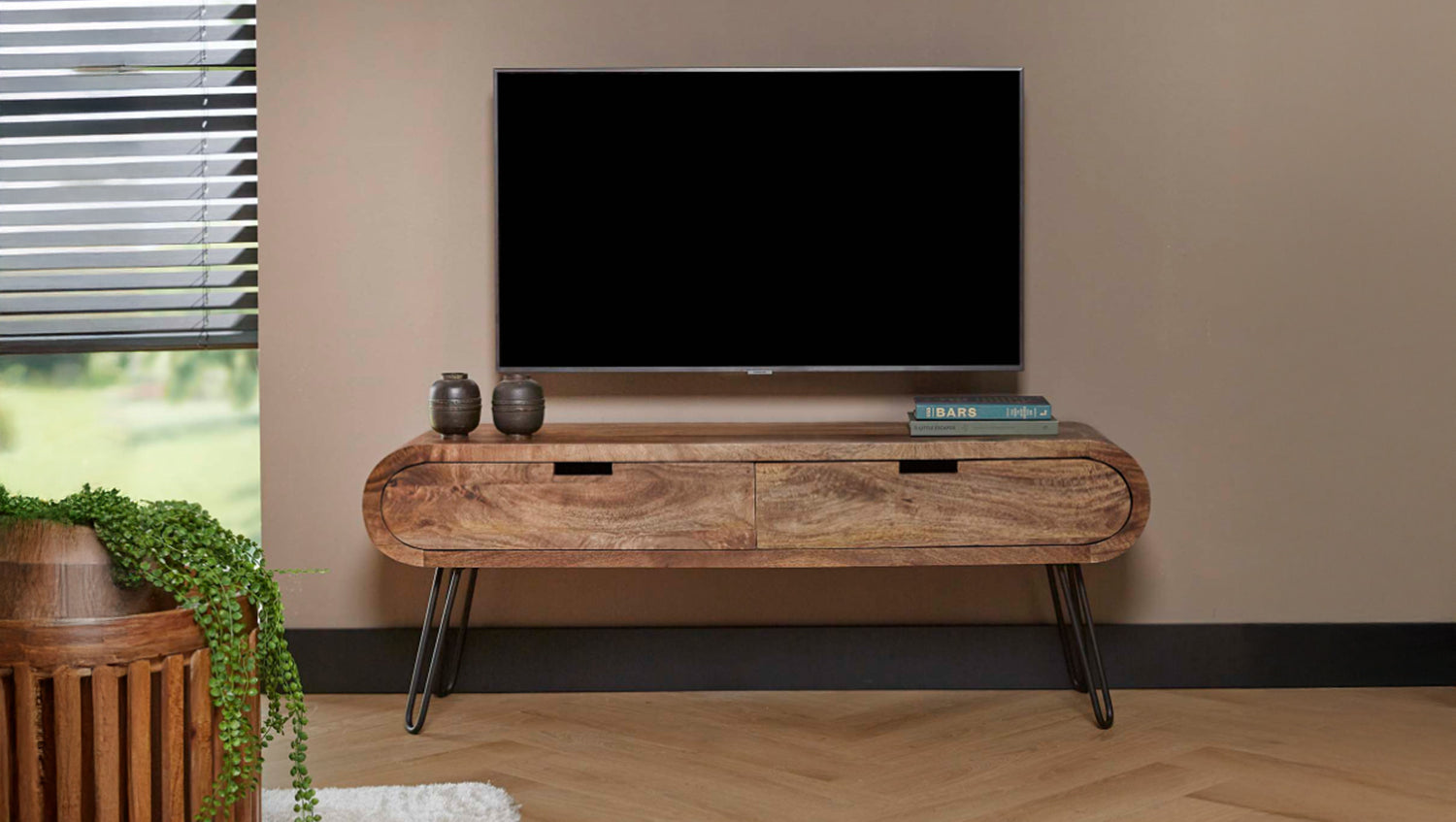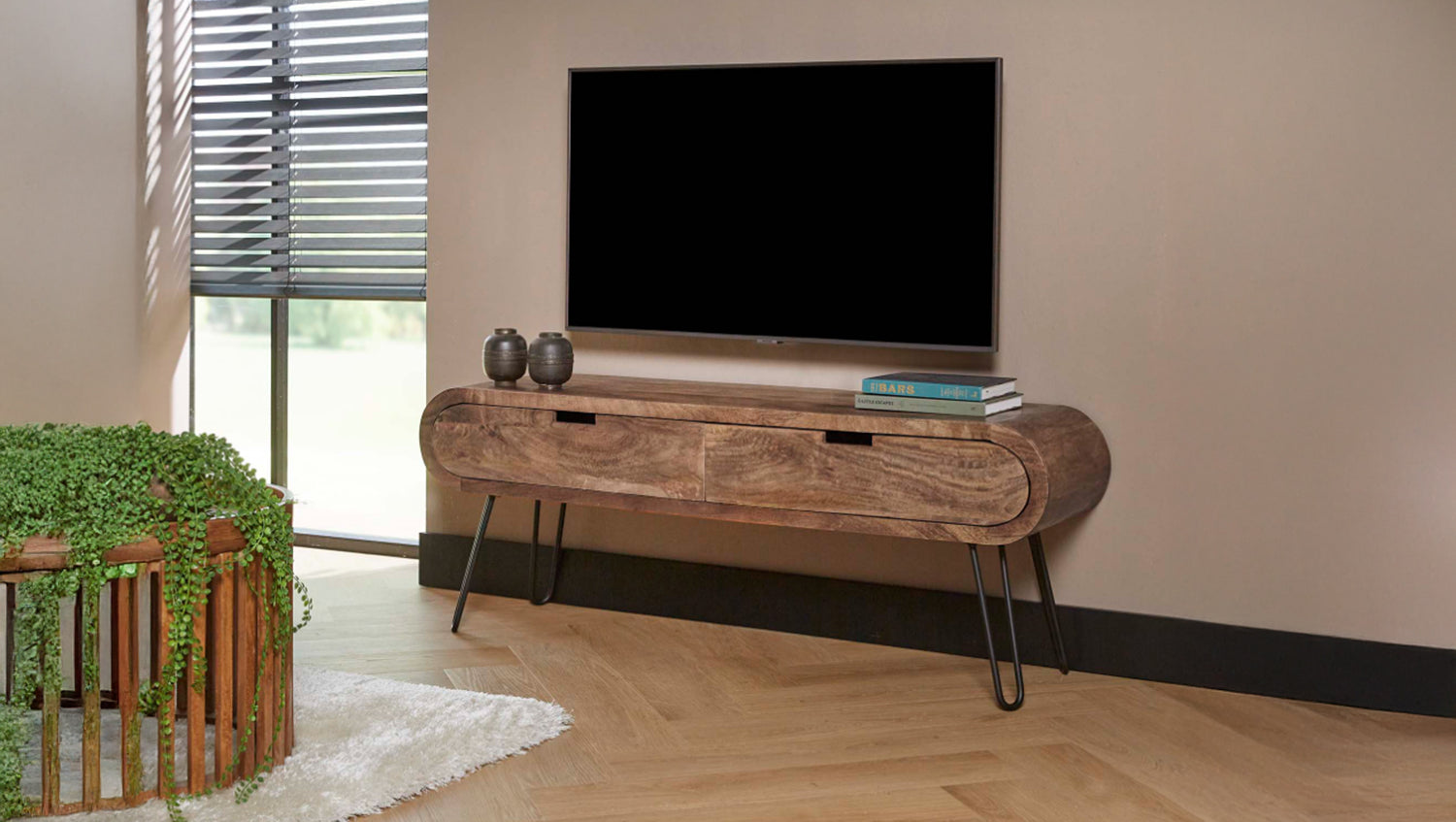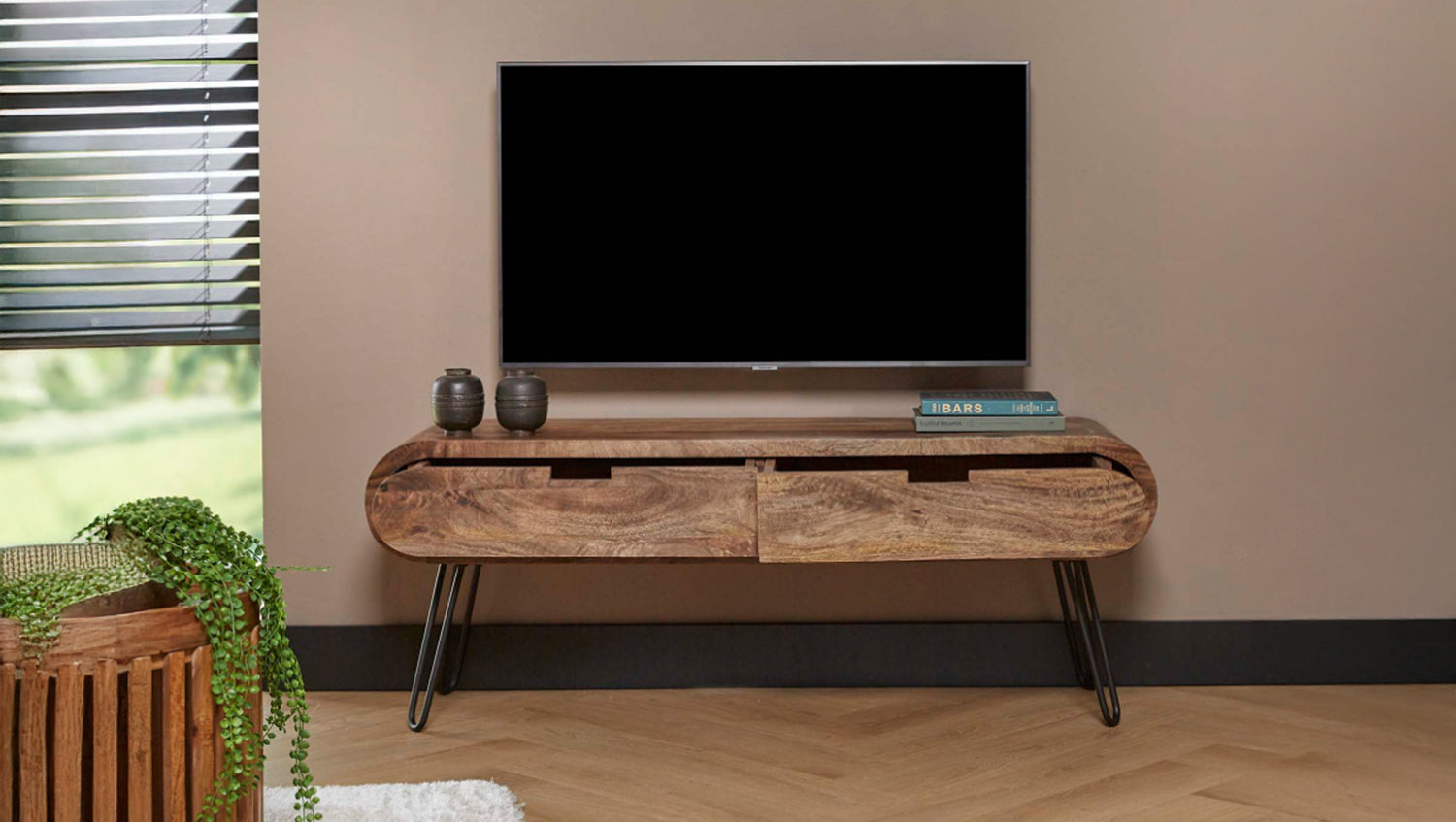 Das KAWOLA Lowboard EVORA begeistert mit seinem modernen Look und hochwertigen Materialien. Gefertigt aus massivem Mangoholz, überzeugt es durch seine warme Ausstrahlung und natürliche Maserung. Die abgeflachten Ecken sorgen für ein trendiges Design, das sich harmonisch in moderne Wohnräume einfügt. Mit einer Breite von 135 cm bietet das TV-Board ausreichend Platz für Fernseher, Mediengeräte und Deko. Die schwarzen, pulverbeschichteten Metallfüße setzen einen stilvollen Kontrast und verleihen dem Möbelstück Stabilität und eine leichte, schwebende Optik. Das EVORA Lowboard kombiniert Funktionalität mit ansprechendem Design und ist die perfekte Wahl für alle, die Wert auf Qualität und Ästhetik legen. Ein echtes Highlight für Ihr Wohnzimmer!
