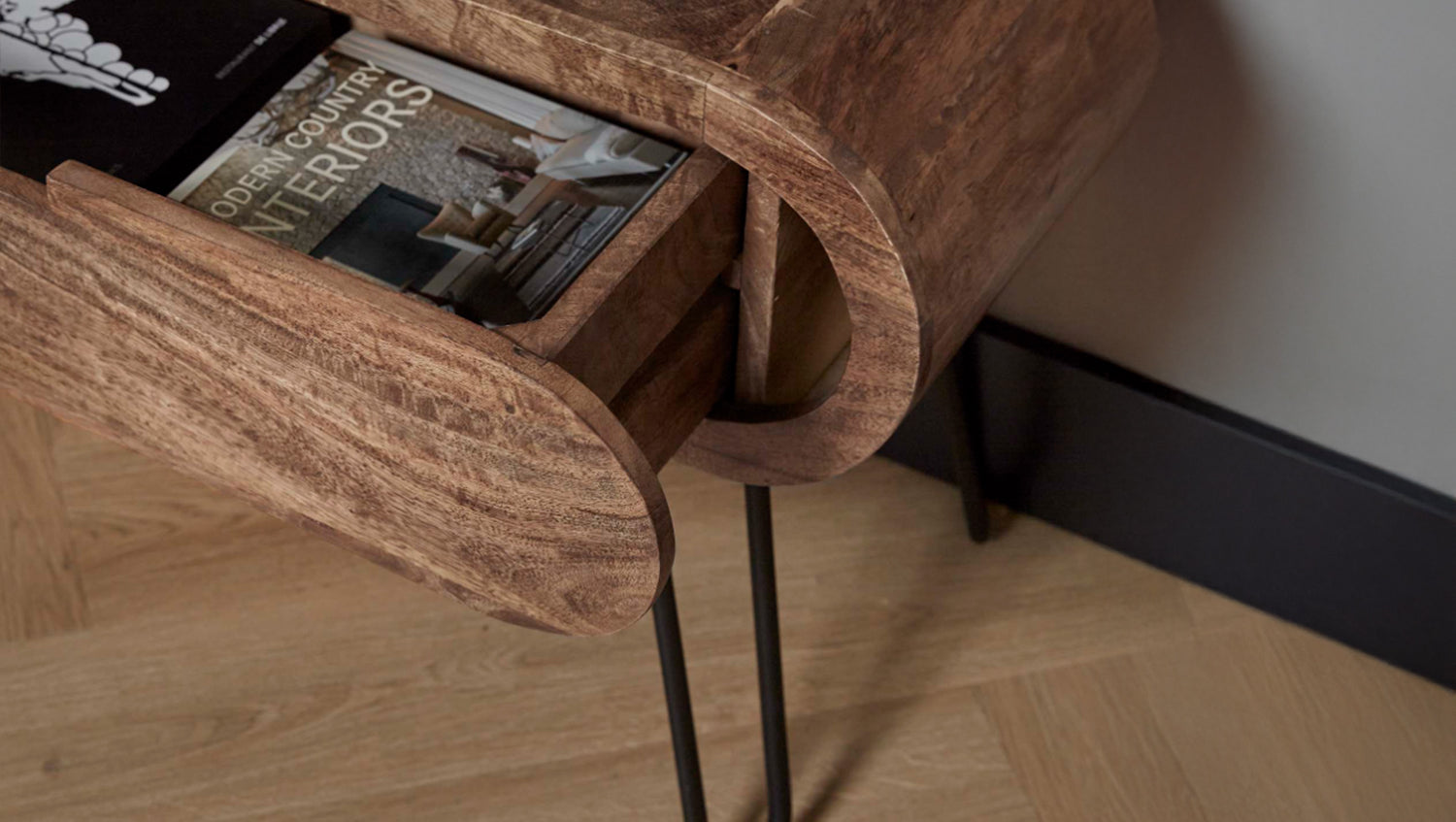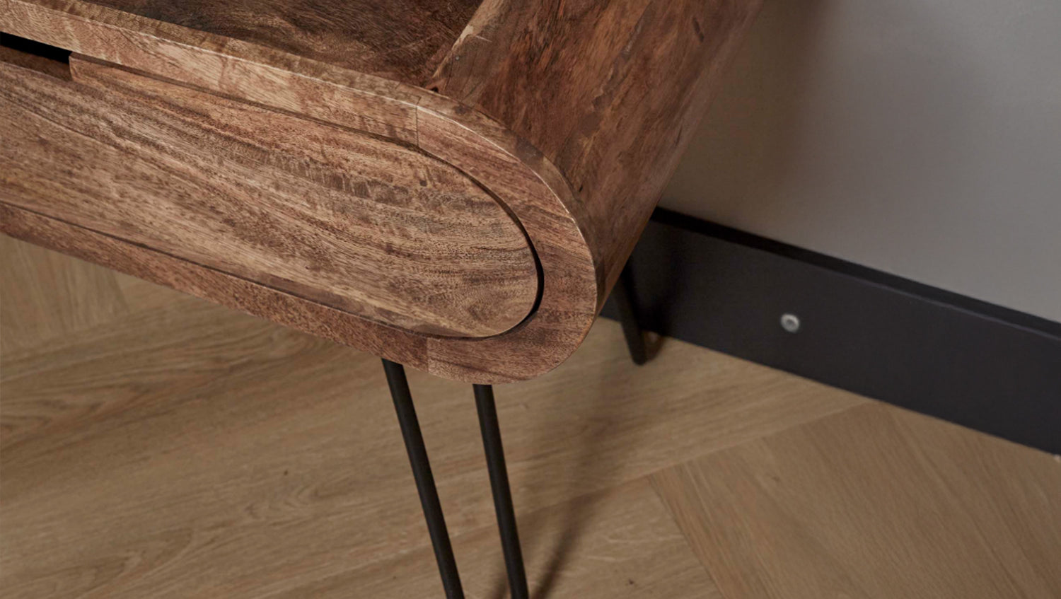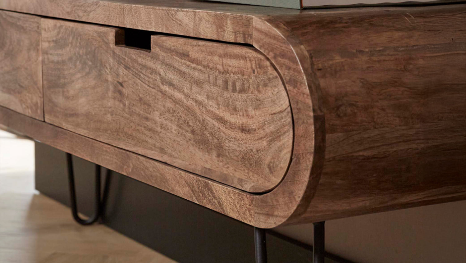 Das KAWOLA Lowboard EVORA begeistert mit seinem modernen Look und hochwertigen Materialien. Gefertigt aus massivem Mangoholz, überzeugt es durch seine warme Ausstrahlung und natürliche Maserung. Die abgeflachten Ecken sorgen für ein trendiges Design, das sich harmonisch in moderne Wohnräume einfügt. Mit einer Breite von 135 cm bietet das TV-Board ausreichend Platz für Fernseher, Mediengeräte und Deko. Die schwarzen, pulverbeschichteten Metallfüße setzen einen stilvollen Kontrast und verleihen dem Möbelstück Stabilität und eine leichte, schwebende Optik. Das EVORA Lowboard kombiniert Funktionalität mit ansprechendem Design und ist die perfekte Wahl für alle, die Wert auf Qualität und Ästhetik legen. Ein echtes Highlight für Ihr Wohnzimmer!