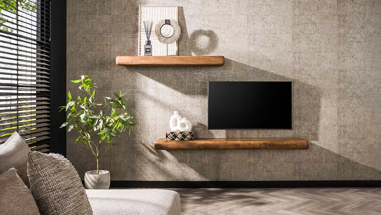 Das KAWOLA SWEAK 118 cm Wandregal ist aus hochwertigem Mangoholz mit sandfarbenem Finish gefertigt. Das Regal wird mit einer Latte und zwei Holzklötzen an der Wand befestigt, was eine feste und stabile Anbringung gewährleistet. Durch diese Konstruktion hängt das Regal schön flach an der Wand.