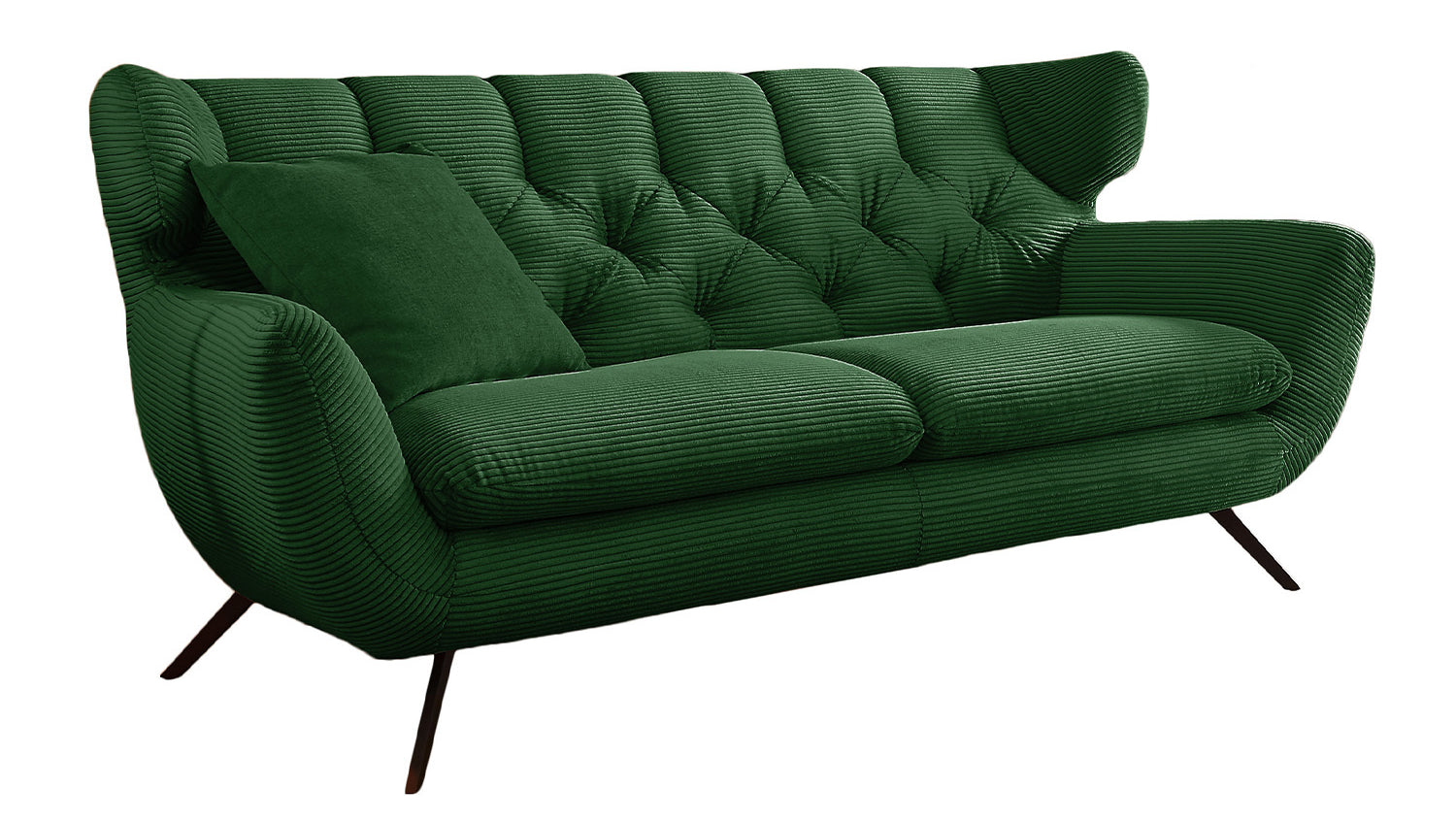 Der Stil des Sofas CHARME erinnert an die sechziger Jahre: Der Rücken wurde aufwendig abgesteppt ohne Knöpfe; die Rückenlehne wurde an den beiden Seiten leicht nach vorne gewölbt und erinnert an die Form eines Ohrensessels; die Füße aus Metall sind leicht ausgestellt.