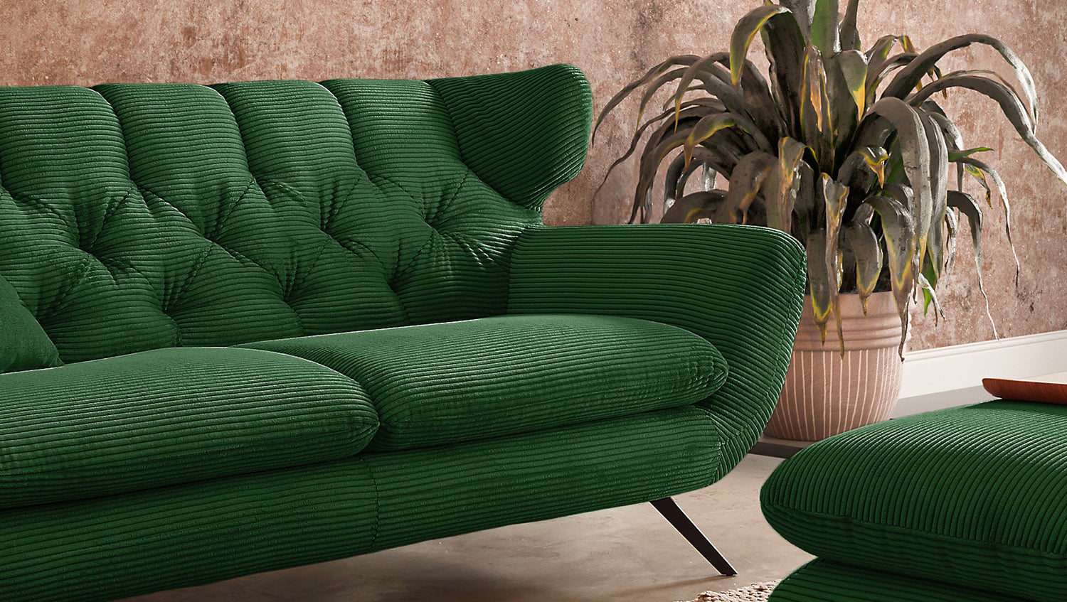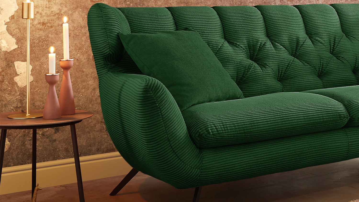 Selbstverständlich wurde das Sofa komplett in Cord bezogen, so dass es auch frei in den Raum gestellt werden kann.