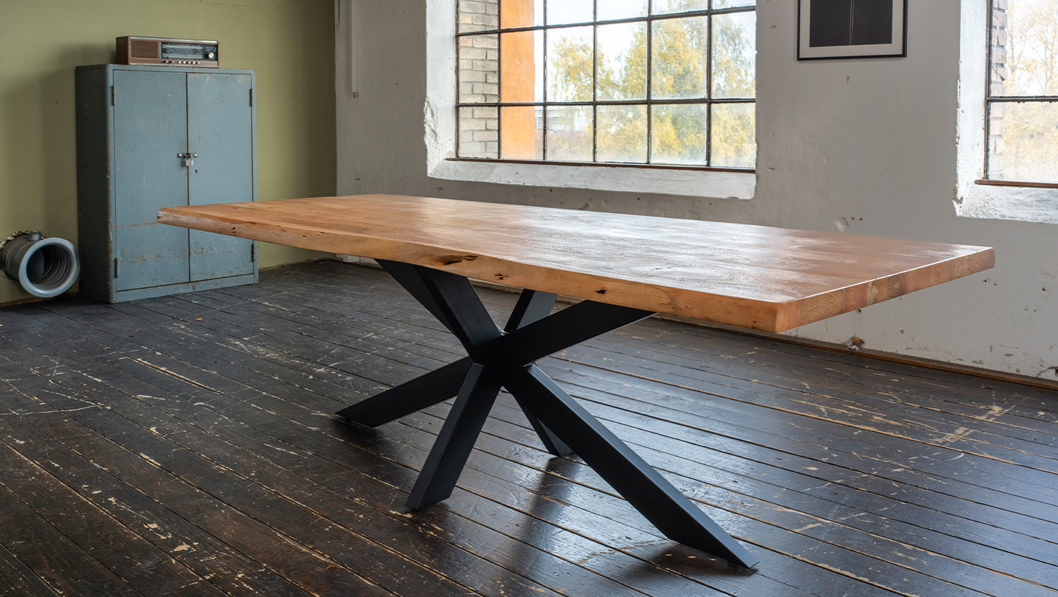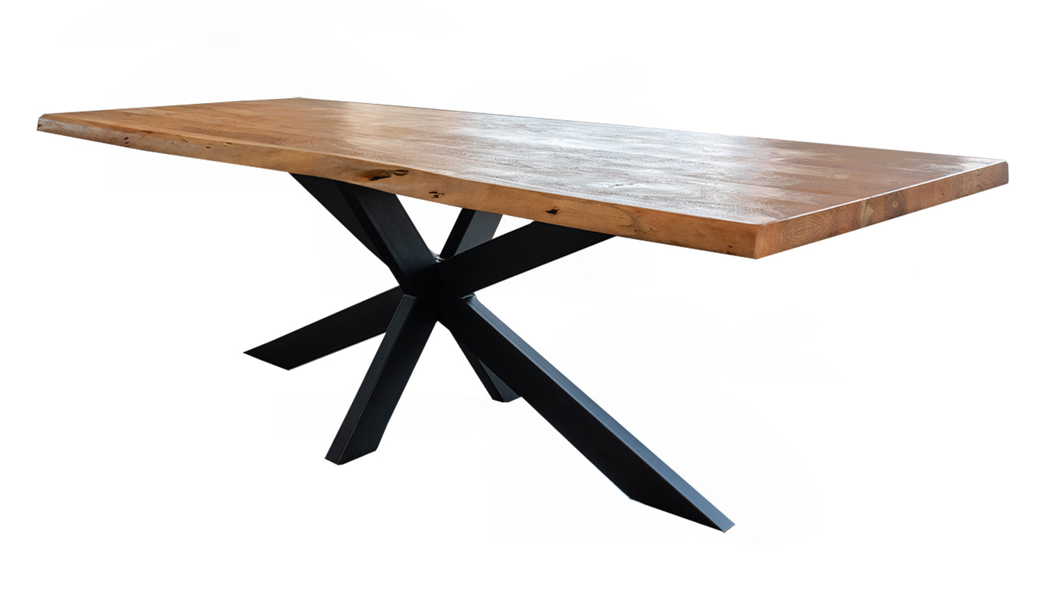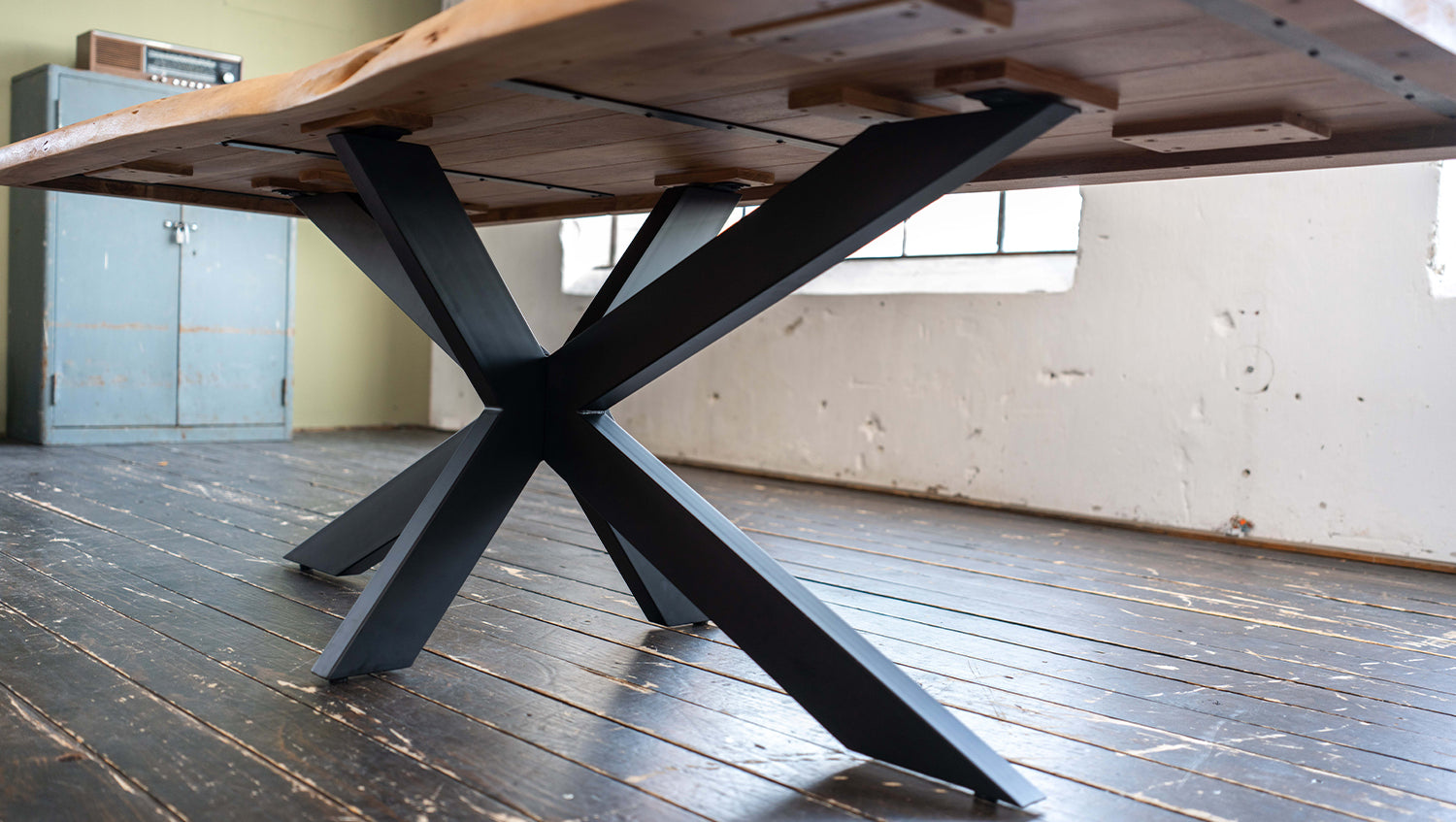 Das rustikal geschweißte Untergestell im Industriedesign, schwarz lackiert und mit einem markanten Spider-Fuß, verleiht dem Tisch eine moderne, industrielle Note. Diese gelungene Kombination aus natürlichem Holz und robustem Metall macht den Tisch zu einem Design-Highlight in Ihrem Esszimmer.