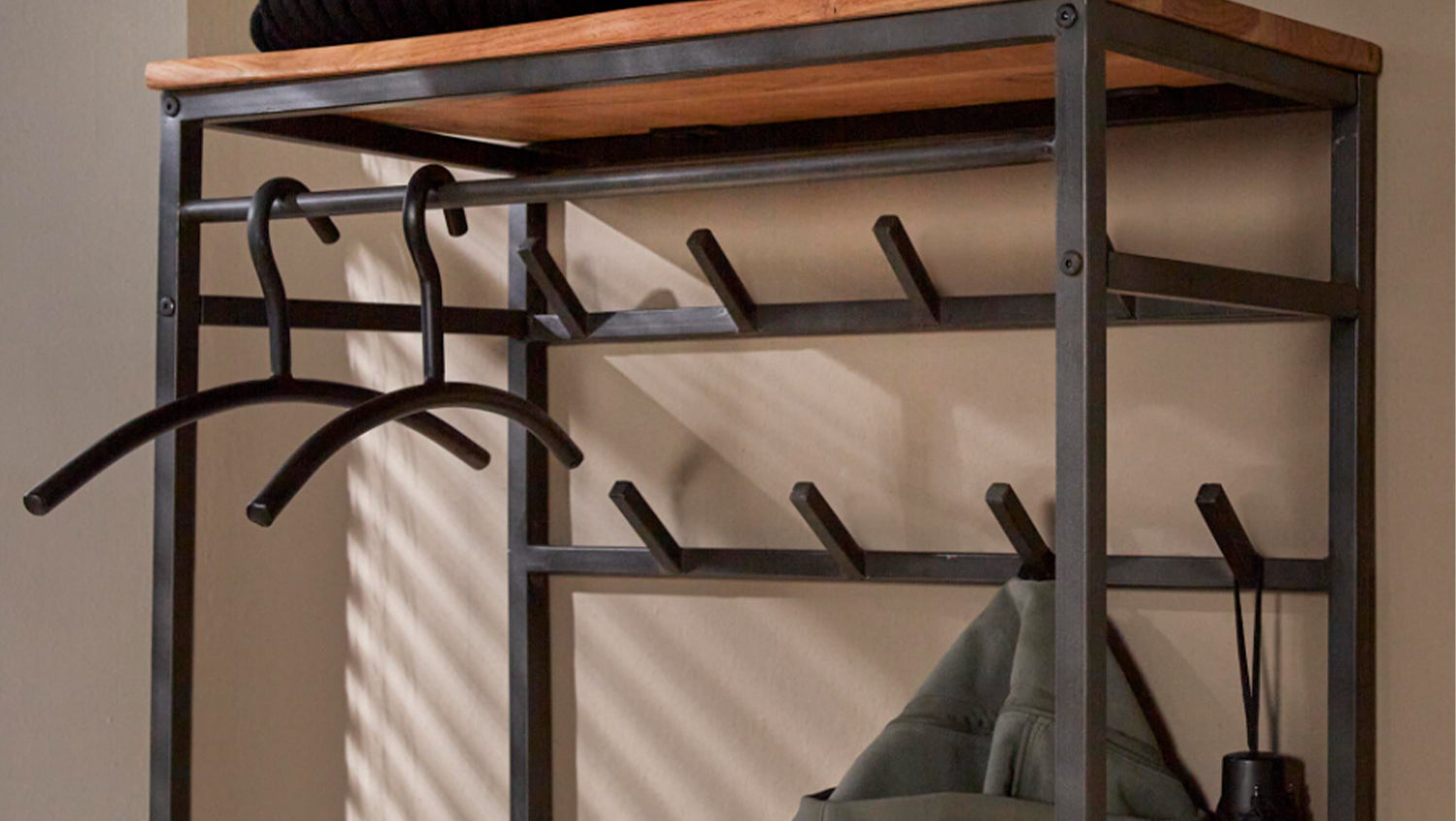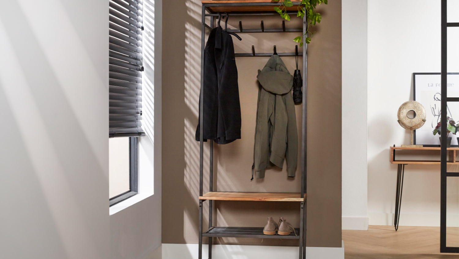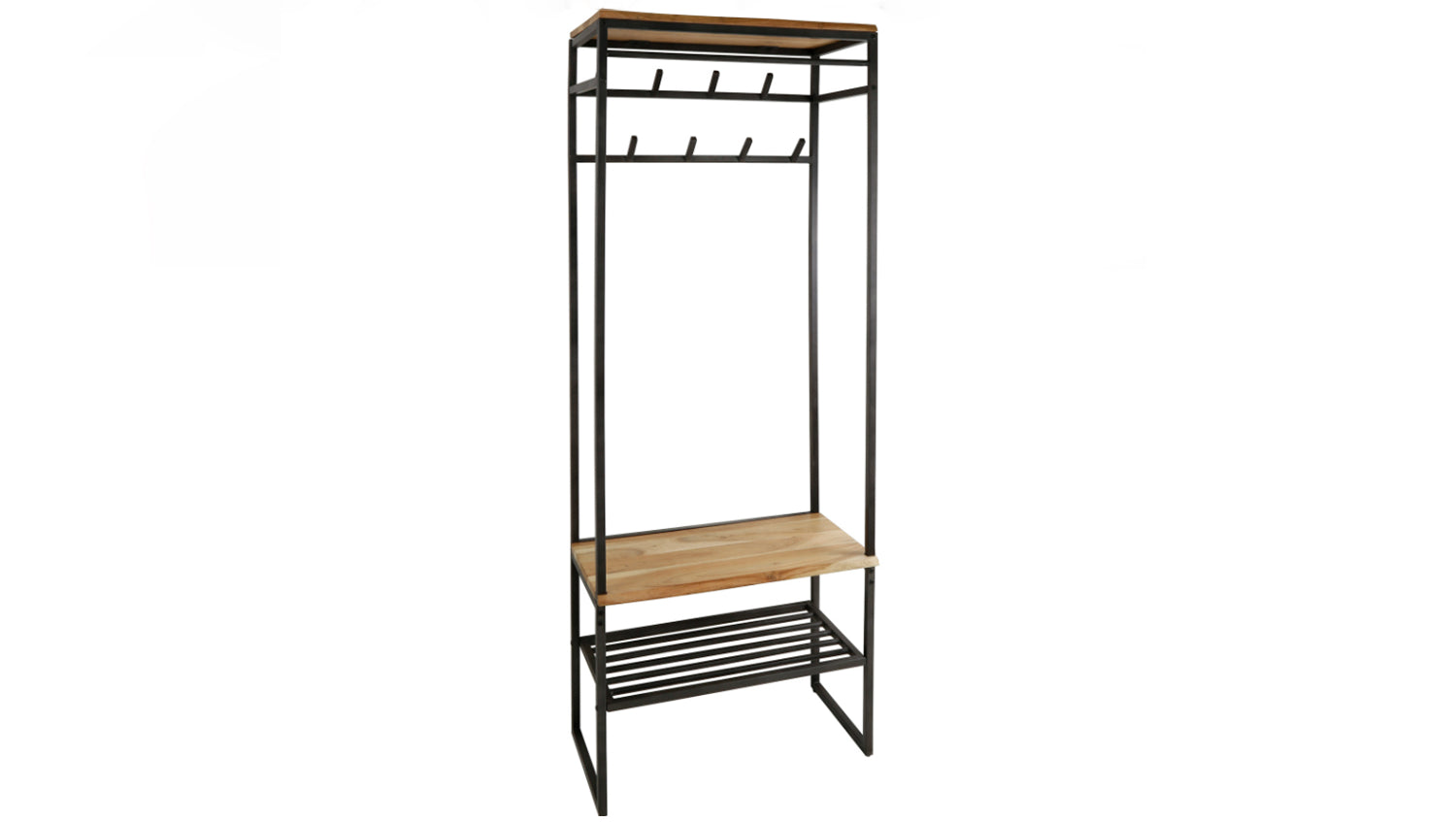 Die KAWOLA Garderobe FLINT kombiniert hochwertiges Akazienholz mit lebendiger Kante und robustes Metall, wodurch ein moderner Industrial-Look entsteht. Mit einer Höhe von 182 cm, Breite von 70 cm und Tiefe von 35 cm bietet sie vielseitigen Stauraum. Acht Haken und eine Metallstange ermöglichen das geordnete Aufhängen von Mänteln und Jacken, während das obere Regal Platz für Accessoires bietet. Das integrierte Schuhregal sorgt für eine praktische Ablage und ermöglicht bequemes Anziehen der Schuhe. FLINT ist die ideale Lösung für einen stilvollen und funktionalen Eingangsbereich!