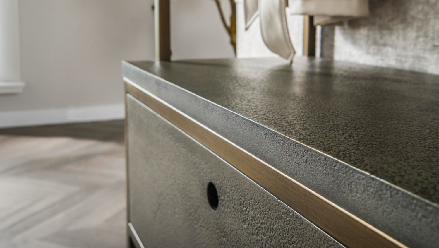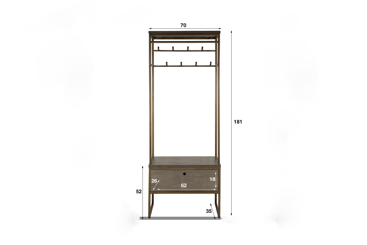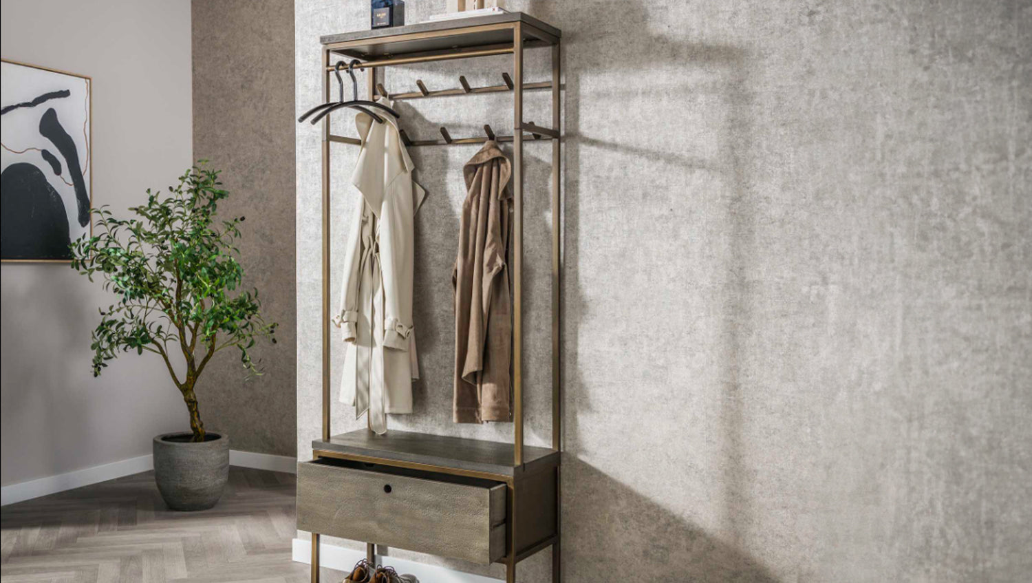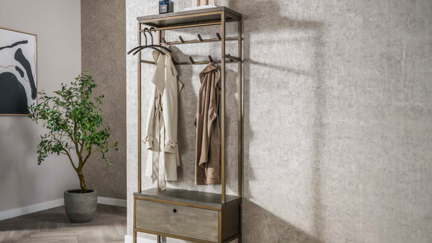 Die KAWOLA Garderobe RISCA besticht durch ihr exklusives Ferro-Finish mit 3D-Struktur, das jedem Raum eine besondere Note verleiht. Mit einer Höhe von 181 cm, Breite von 70 cm und Tiefe von 35 cm bietet sie eine ideale Kombination aus Funktionalität und Ästhetik. Acht Haken und eine Stange im antiken Messing-Finish sorgen für eine stilvolle Aufbewahrung von Jacken, Mänteln und Accessoires. Zusätzlich bietet eine praktische Schublade Platz für kleinere Utensilien. Perfekt für den Flur oder Eingangsbereich – FLINT verbindet Eleganz mit durchdachtem Stauraum.