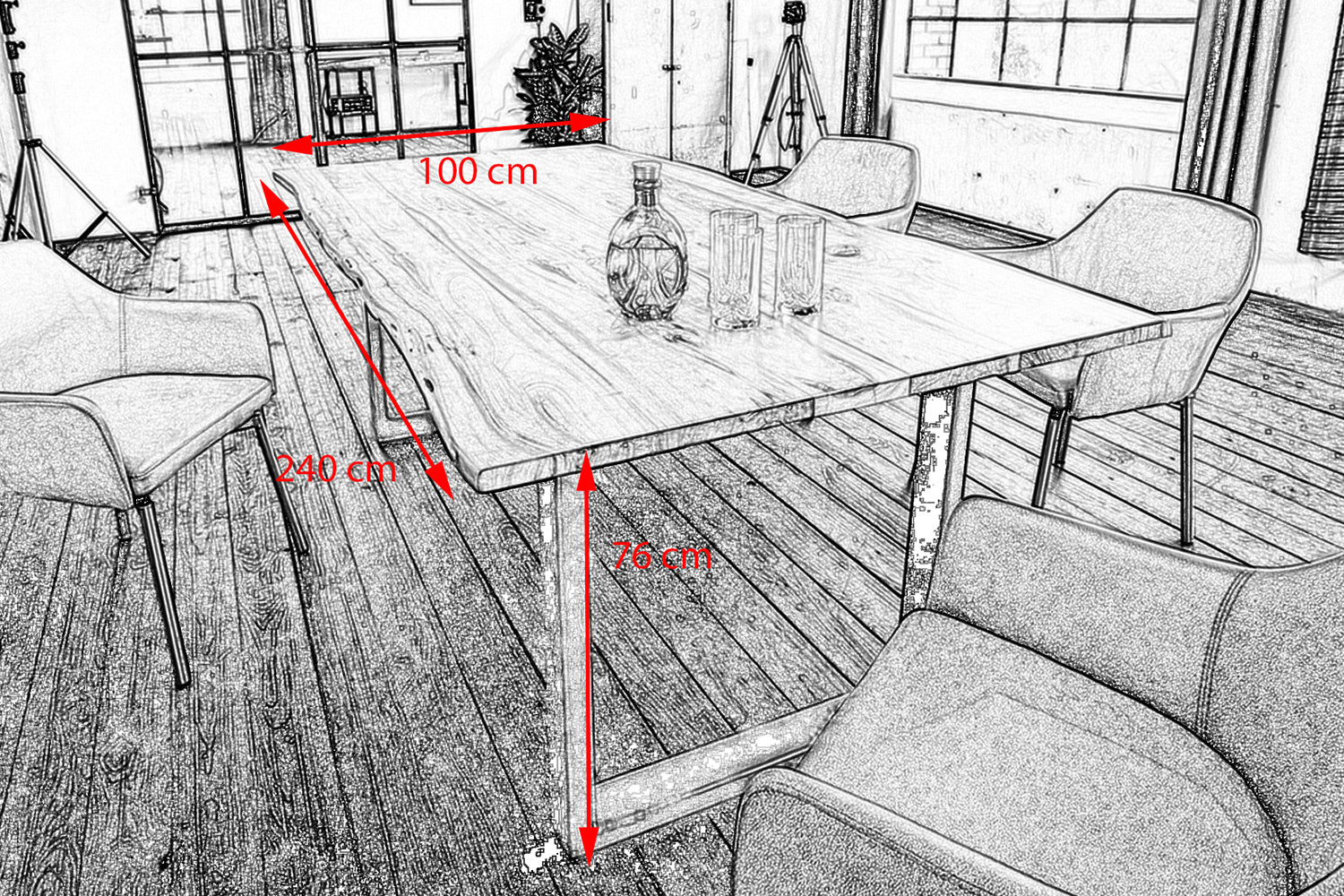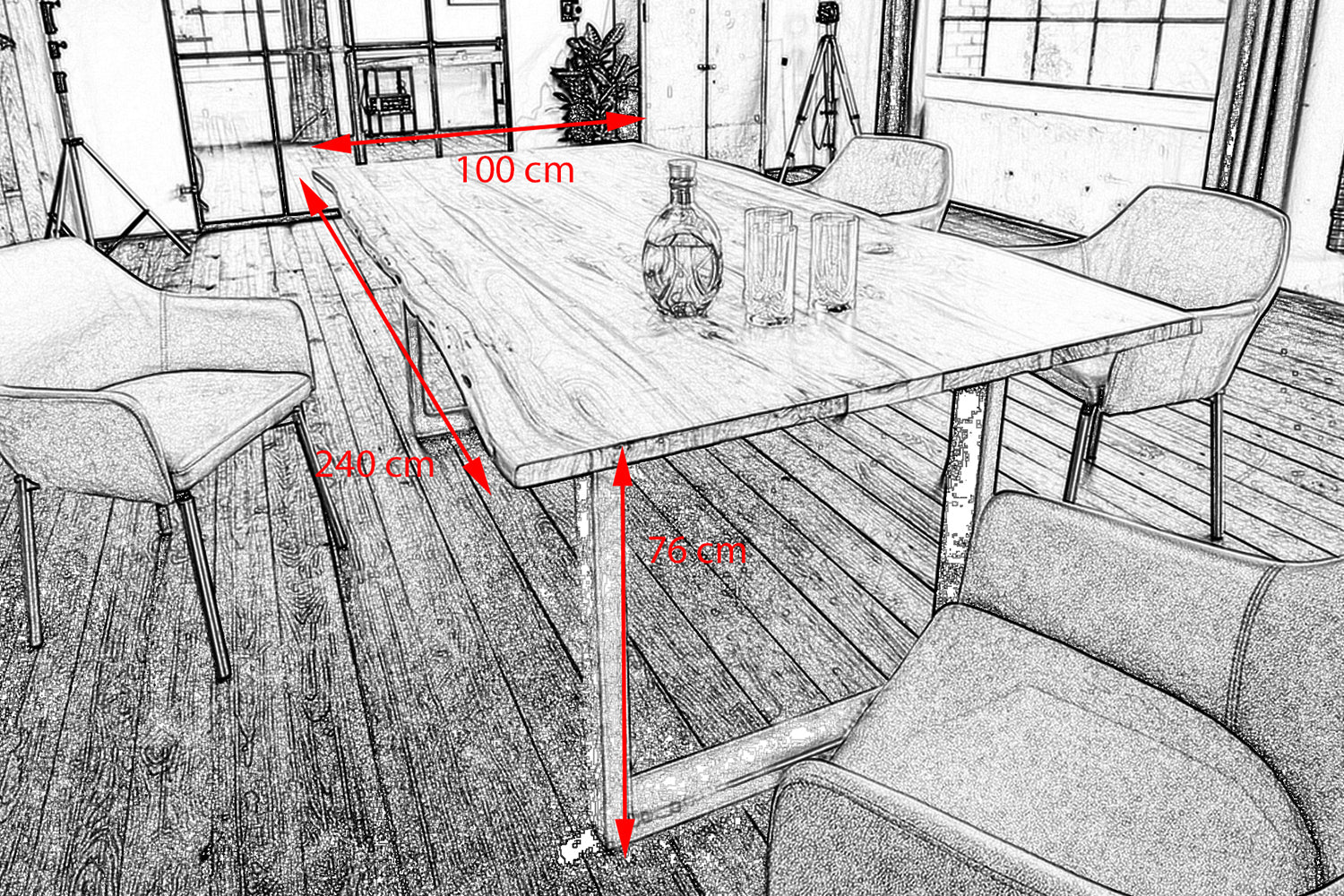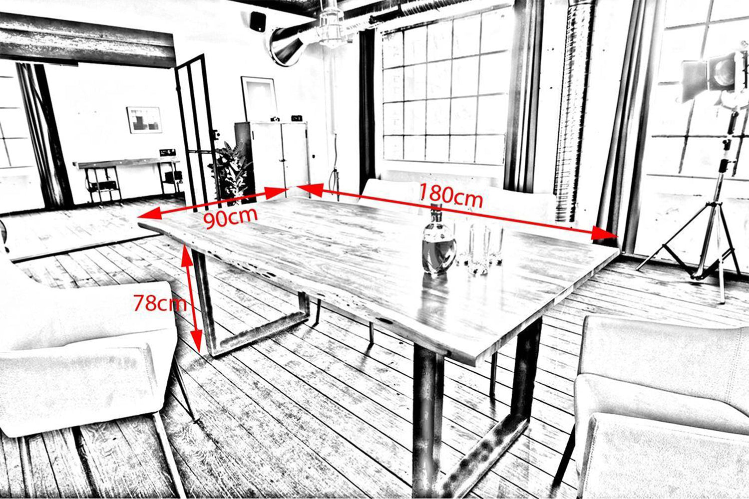 Wunderschöner Esstisch, mit Massivholzplatte, der sich wunderbar in das moderne, aber auch das rustikal gemütliche Wohnambiente integrieren lässt. Besonderes Highlight des Esstisches sind die Tischkanten, die den natürlichen Formen eines Baumes entsprechen. Das kubische Metallgestell bildet hierzu einen gelungenen Kontrast, der dem Massivholz Esstisch einen Hauch industriellen Charme verleiht.